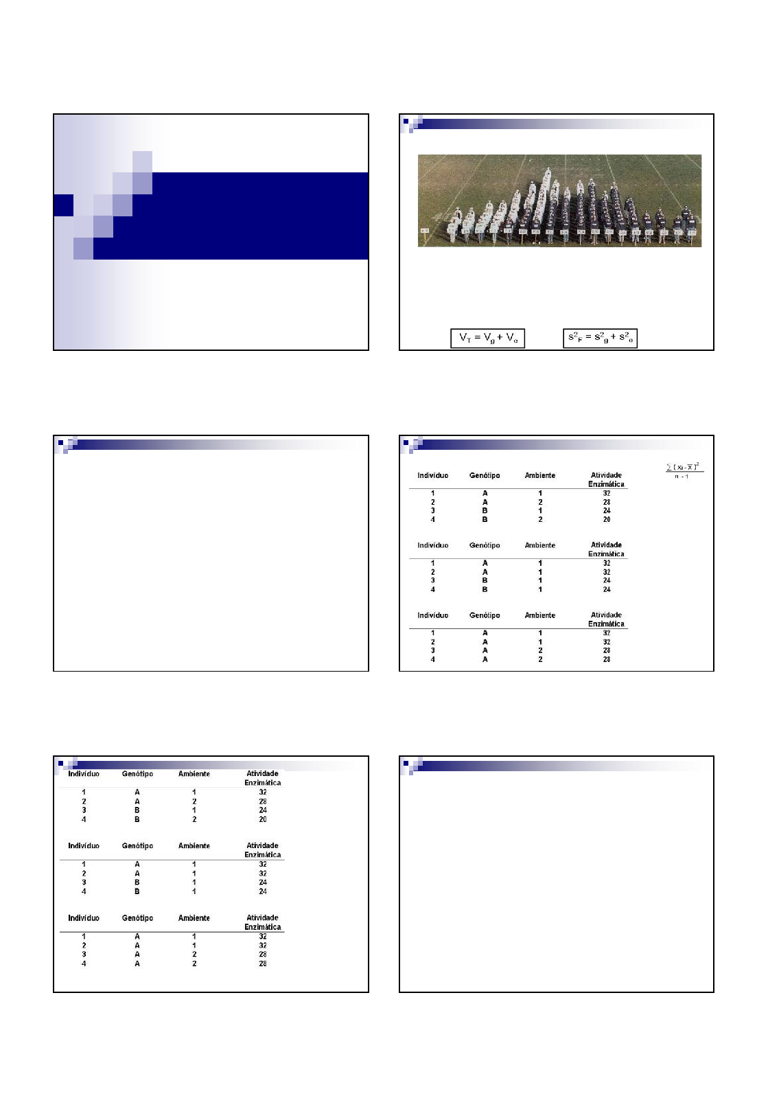 1 1 Herança de caracteres complexos Professora Vanessa Kava-Cordeiro PARTE II Variância fenotípica Var = 61 cm2 Variância Variância Variância Fenotípica Genotípica Ambiental VP = VG + VE Média = 1,72 m ou 2 Como identificar a variância genotípica e a ambiental? Exemplo hipotético: Atividade enzimática de indivíduos com duas possibilidades de genótipos (A ou B), em dois tipos de ambientes (1 ou 2). 3 CALCULAR A VARIÂNCIA PARA AS TRÊS SITUAÇÕES! 4 S2= s2F = 26,6 s2e = 0 s2F = s2g = 21,3 s2g = 0 s2F = s2e = 5,3 5 Calculando a HERDABILIDADE… 6 2 Herdabilidade no sentido amplo (H2) • Proporção da variação fenotípica que é devida a fatores genéticos. ou H2 = 21,3 / 26,6 = 0,80 No exemplo anterior: VT = (Vg + Ve) 7 Herdabilidade em Sentido Amplo H2 = varia de 0 a 1 Mais próxima de 1, maior proporção da variabilidade é atribuída a diferenças genéticas H2 de uma característica é diferente em cada população e em cada conjunto de ambientes 8 Tempo de maturação (dias) Tempo médio de maturação Classe modal X : média da amostra s : desvio padrão s2 : variância •Tempo de maturação do trigo (dias) VT = Vg + Ve VT = Ve = 9 CALCULAR A HERDABILIDADE... Tempo de maturação (dias) Tempo médio de maturação Classe modal X : média da amostra s : desvio padrão s2 : variância •Tempo de maturação do trigo (dias) VT = Vg + Ve VT = 14,26 dias Ve = variação de F1 10 Tempo de maturação (dias) Tempo médio de maturação Classe modal X : média da amostra s : desvio padrão s2 : variância •Tempo de maturação do trigo (dias) VT = Vg + Ve VT = 14,26 dias Ve = 2,88 11 Tempo de maturação (dias) Tempo médio de maturação Classe modal X : média da amostra s : desvio padrão s2 : variância •Tempo de maturação do trigo (dias) VT = Vg + Ve Vg = 14,26 – 2,88 Vg = 11,38 H2 = 11,38/14,26 H2 = 0,798 12 3 13 VARIÂNCIA ADITIVA (S2A): A parte da variância genotípica explicada pelo número de alelos favoráveis ao genótipo. Interação aditiva 14 VARIÂNCIA DE DOMINÂNCIA (S2D): A parte da variância genotípica explicada pelos valores genotípicos favoráveis. Interação dominante 15 VARIÂNCIA DE EPISTASIA (S2I): A parte da variância genotípica causada pelas interações entre genes não alélicos. Epistasia 16 Portanto: S2F = S2A + S2D + S2I + S2E +( S2GE ) Onde: S2F = Variância fenotípica; S2A =Variância aditiva; S2D = Variância devida à dominância; S2I = Variância devida à epistasia; S2E = Variância devida ao ambiente 17 HERDABILIDADE EM SENTIDO RESTRITO h2 = Parte da variância genética que pode ser usada para prever os fenótipos da prole a partir dos fenótipos parentais VT = Va + Vd + Vi + Ve Apenas Va é útil para prever os fenótipos da prole: h2 = Va / VT h2 = varia de 0 a 1 Mais próxima de 1, maior proporção da variância fenotípica que é decorrente da variância genética aditiva maior a capacidade de prever o fenótipo da prole !!! 18 4 Estimativas de herdabilidade em sentido restrito Característica h2 Estatura em seres humanos 0,65 Produção de leite em gado 0,35 Tamanho da prole em porcos 0,05 Produção de ovos em galinhas 0,10 Tamanho da cauda em camundongos 0,40 Tamanho do corpo em Drosophila 0,40 Herdabilidade em Sentido Restrito 19 20 Análise de características quantitativas Variação observada Hipótese de Fatores Múltiplos (Fisher, 1918): Componente genético Componente ambiental T = µ + g + e Onde: T : valor de uma característica quantitativa µ : média da população g : desvio da média devido a fatores genéticos e : desvio da média devido a fatores ambientais 21 Hipótese de Fatores Múltiplos Desvios da média Medidas individuais Fr eq uê nc ia n a po pu la çã o média 22 Valor da média populacional (μ) Valor dos parentais (média) (TP) Herdabilidade em sentido restrito (h2) NÃO É POSSÍVEL PREVER A INFLUÊNCIA AMBIENTAL ! Previsão de Fenótipos 23 Exemplo… Previsão do valor do QI de Oswald, filho de Michael e Frances (SNUSTAD, 2008, p.751-2) TO = µ + h2 [(TM + TF)/2 - µ] TO = µ + h2 [TP - µ] 24 Previsão de Fenótipos Fr eq uê nc ia n a po pu la çã oµ : 100, média da população TP: valor médio parental TM: 110, valor QI do pai (Michael) TF : 120, valor QI da mãe (Frances) TO : valor QI do filho (Oswald) (previsão) TO = µ + h2 [(TM + TF)/2 - µ] TO = µ + h2 [TP - µ] h2 do QI = 0,4 5 25 Fr eq uê nc ia n a po pu la çã o Previsão de Fenótipos Entre a média parental e a média da população TO = 106 µ < TO < TP 40% Se, h2 do QI = 1 então, TO = TP Mas isto é uma previsão!!! 26 Exercícios… 1. A herdabilidade em sentido restrito (h2) para o número de cerdas em uma população de drosófilas é 0,3. O número médio de cerdas é 12. Um macho com 10 cerdas é cruzado com uma fêmea com 20 cerdas. Qual o número de cerdas esperado na prole? RESPOSTA: To: 12 + 0,3 [(10+20)/2 – 12] To: 12,9 TO = µ + h2 [TP - µ] 27 Exercícios… 2. O QI de Leo é 86 e o de Julie é 110. O valor médio do QI populacional é 100. A herdabilidade em sentido restrito (h2) para esta característica é 0,4. Qual o QI esperado para o primeiro filho do casal? RESPOSTA: To: 100 + 0,4 [(86+110)/2 – 100] To: 99,2 TO = µ + h2 [TP - µ] 28 Herdabilidade em sentido restrito (h2) Valor da média populacional (μ) Valor dos parentais selecionados (média) (TS) Seleção artificial e previsão de fenótipos 29 Seleção artificial e previsão de fenótipos TO = µ + h2 [TS - µ] Equação de previsão: TO : média da prole µ : média da população TS : média dos genitores selecionados [TO - µ] = h2 [TS - µ] [TS - µ] = diferencial de seleção S [TO - µ] = resposta a seleção R R = h2 S 30 prole Genitores selecionados Seleção artificial e previsão de fenótipos µ : média da população TS : média dos genitores selecionados TO : média da prole [TS - µ] = diferencial de seleção S [TO - µ] = resposta a seleção R [TO - µ] = h2 [TS - µ] R = h2 S 6 31 Seleção artificial