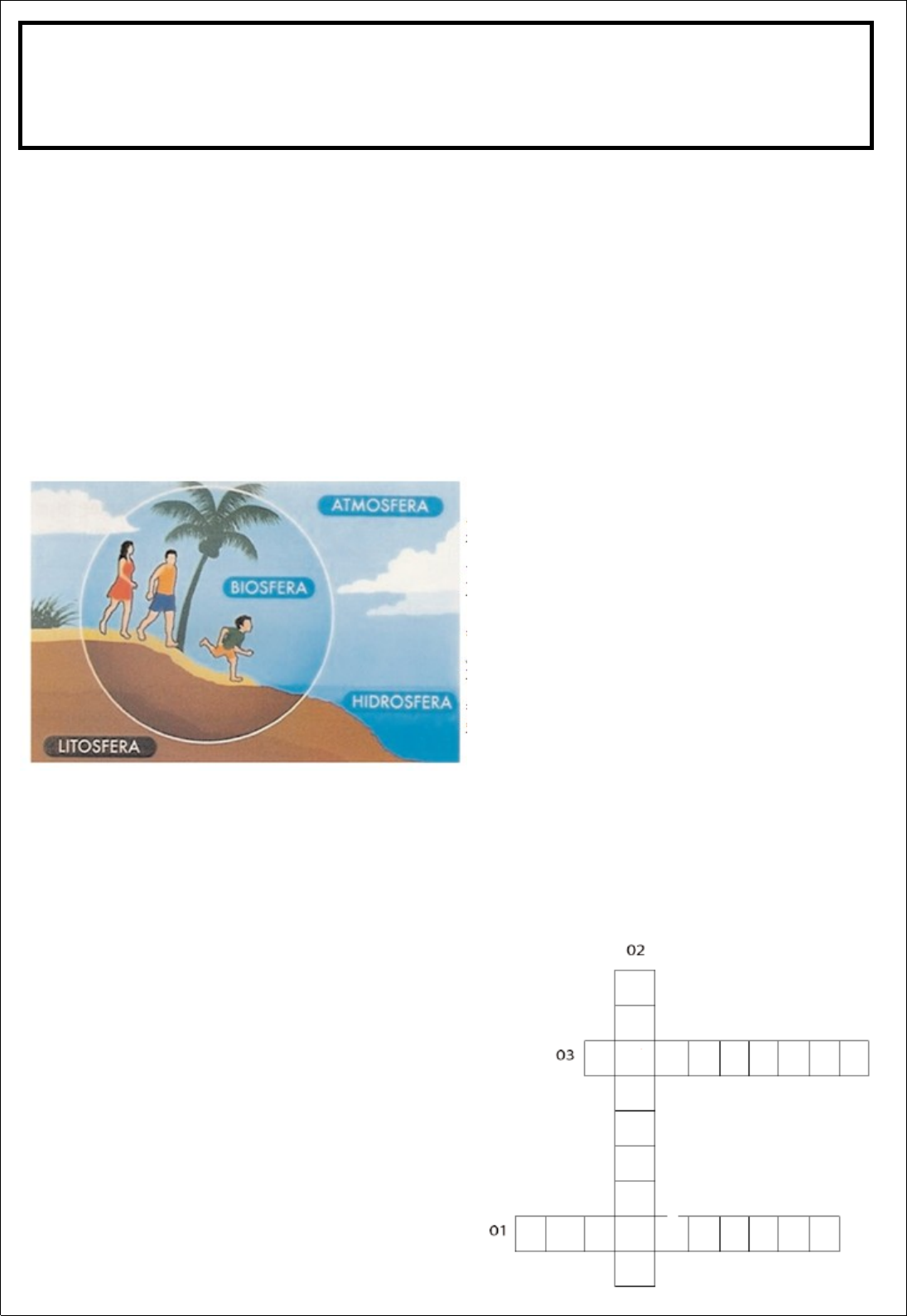 Escola Municipal Orlando Rodrigues da Cunha Júnior Caldas Novas,________de_______________ de 2018 Professora: ________________________________________________ Aluno (a):__________________________________________________ ________________________ __________________________ A biosfera O que devo aprender nesta aula Identificar a estrutura da Terra e suas camadas básicas, hidrosfera, atmosfera, litosfera. Levantamento dos conhecimentos prévios Faça um desenho e escreva os nomes de onde podemos encontrar vida no Planeta Terra. Conceito básico A crosta terrestre é composta por uma parte sólida, a litosfera, e outra líquida, a hidrosfera. É na litosfera que construímos casas, hospitais, escolas etc. Já a porção líquida (oceanos, rios e lagos) é onde vivem peixes, algas, baleias, golfinhos etc. Nosso planeta é envolvido por uma camada de gases, a atmosfera, que se estende da superfície em direção ao Universo com aproximadamente1200 quilômetros. A figura ao lado ilustra as camadas da Terra. 01) A água é um bem precioso para a vida. Aproximadamente setenta e um por cento (71%) de nosso planeta é coberto por água. As frases acima se referem a elementos da a) atmosfera. b) hidrosfera. c) litosfera. d) estratosfera. 02) Preencha a cruzadinha de acordo com as informações a seguir. (01) – Rio Araguaia, Lago das Brisas, Rio Paranaíba são exemplos de componentes da ____________________ (02) – Rochas, terra, areia, argila são alguns componentes da _________________________________ (03) – Oxigênio, gás carbônico, nitrogênio são componentes da __________________________________