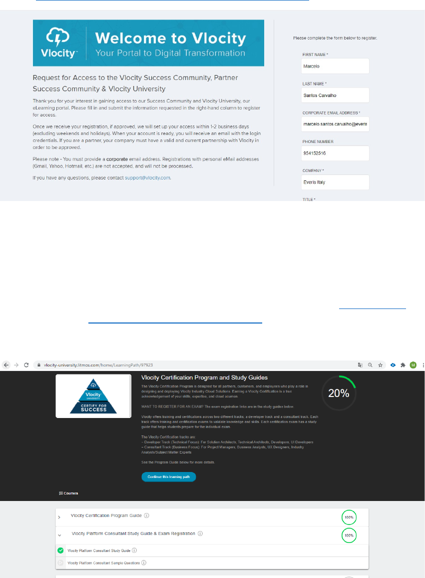 Guia de estudos Consultor de Plataforma Vlocity 1. Crie um Login de acesso ao portal da Vlocity University: 1.1: Acesse o site: https://go.vlocity.com/SuccessCommunityAndVUAccess e solicite um login de acesso ao portal de estudos da Vlocity: Obs: O login de acesso leva até 48 horas para ser realizado pela Vlocity. Necessário realizar a solicitação utilizando o E-mail corporativo, o portal de estudo da Vlocity é destinado apenas para parceiros. 2. Acesse o portal de estudos da Vlocity University: 2.1 Após receber seus dados de acesso, entre no site: https://vlocity-university.litmos.com/account/Login; 2.2 Clique no primeiro modulo chamado Vlocity Certification Program and Study Guides; 2.3 Acesse o tópico: Vlocity Platform Consultant Study Guide; Nesta área você encontra informações referente a certificação de consultor da Vlocity, os pré-requisitos para realizar a prova, recursos recomendados para estudo, quais temas serão abordados no exame e qual o peso de cada assunto na prova. 3. Acessando o módulo de Consultor de Plataforma Vlocity (Vlocity Platform Foundations (VPF)): Completar 100% deste módulo é o único pré-requisito necessário para realizar a exame: 3.1 Dentro do tópico: Vlocity Platform Consultant Study Guide, em Preparing for the Exam, Acesse o link “Vlocity Platform Foundations”; 3.2 Você também pode acessar o módulo utilizando o endereço: https://vlocity-university.litmos.com/course/2436808. Favorite este link no seu navegador para um rápido acesso ao módulo; 4. Criando uma Org Vlocity: Ao decorrer do módulo, muitos exercícios serão realizados utilizando uma Org Sandbox Vlocity. Você pode optar por um playground de Communications, Media and Energy ou Insurance/Health. Para solicitar sua Org de treino siga os passos: 4.1 Dentro do Modulo, Clique em uma das opções para solicitar uma org Sandbox: 4.2 Após clicar no botão azul, a Vlocity tem até 48 horas para criar seu playground, o ambiente ficará disponível para exercícios e consultas por até 180 dias; 5. Realizando exercícios do módulo: