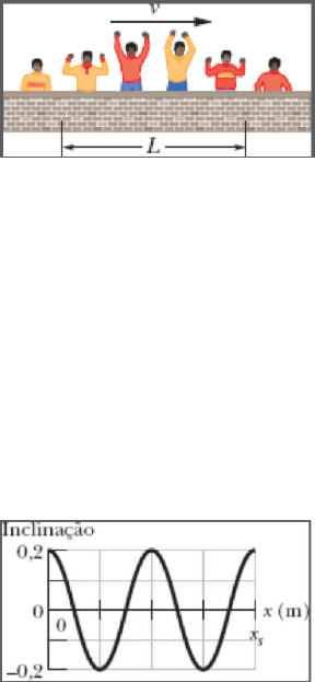 Exercícios sobre Ondas Halliday & Resnick. “Fundamentos de Física – Gravitação, Ondas e Termodinâmica – Volume 2, 10.ª Edição.” Capítulo 16 Obs: Importante para entender melhor Ondas Eletromagnéticas Módulo 16.1 – Ondas Transversais 1) Se a função y(x, t) = (6,0 mm) sen(kx + (600 rad/s)t + ϕ) descreve uma onda que se propaga em uma corda, quanto tempo um ponto da corda leva para se mover entre os deslocamentos y = +2,0 mm e y = –2,0 mm 2) Uma onda humana. A ola é uma onda, criada pela torcida, que se propaga nos estádios em eventos esportivos. Quando a onda chega a um grupo de espectadores, eles ficam em pé com os braços levantados e depois tornam a se sentar. Em qualquer instante, a largura L da onda é a distância entre a borda dianteira (as pessoas que estão começando a se levantar) e a borda traseira (as pessoas que estão começando a se sentar). Suponha que uma ola percorre uma distância de 853 assentos de um estádio em 39 s e que os espectadores levam, em média, 1,8 s para responder à passagem da onda levantando-se e voltando a se sentar. Determine (a) a velocidade v da onda (em assentos por segundo) e (b) a largura L da onda (em número de assentos). 3) Uma onda tem uma frequência angular de 110 rad/s e um comprimento de onda de 1,80 m. Calcule (a) o número de onda e (b) a velocidade da onda. 4) Uma onda senoidal se propaga em uma corda. O tempo necessário para que um ponto da corda se desloque do deslocamento máximo até zero é 0,170 s. (a) Qual é o período e (b) qual a frequência da onda? (c) O comprimento de onda é 1,40 m; qual é a velocidade da onda? 5) Uma onda senoidal se propaga em uma corda sob tração. A Fig. mostra a inclinação da corda em função da posição no instante t = 0. A escala do eixo x é definida por xs = 0,80 m. Qual é a amplitude da onda? 6) Uma onda senoidal transversal se propaga em uma corda no sentido positivo de um eixo x com uma velocidade de 80 m/s. No instante t = 0, uma partícula da corda situada em x = 0 possui um deslocamento transversal de 4,0 cm em relação à posição de equilíbrio e não está se movendo. A velocidade transversal máxima da partícula situada em x = 0 é 16 m/s. (a) Qual é a frequência da onda? (b) Qual é o comprimento de onda? Se a equação de onda é da forma y(x, t) = ym sen(kx ± ωt + ϕ), determine (c) ym, (d) k, (e) ω, (f) ϕ e (g) o sinal que precede ω. 7) Uma onda senoidal que se propaga em uma corda é mostrada duas vezes na Fig., antes e depois que o pico A se desloque de uma distância d = 6,0 cm no sentido positivo de um eixo x em 4,0 ms. A distância entre as marcas do eixo horizontal é 10 cm; H = 6,0 mm. Se a equação da onda é da forma y(x, t) = ym sen(kx ± ωt), determine (a) ym, (b) k, (c) ω e (d) o sinal que precede ω. 8) A equação de uma onda transversal que se propaga em uma corda muito longa é y = 6,0 sen(0,020px + 4,0πt), em que x e y estão em centímetros e t em segundos. Determine (a) a amplitude, (b) o comprimento de onda, (c) a frequência, (d) a velocidade, (e) o sentido de propagação da onda e (f) a máxima velocidade transversal de uma partícula da corda. (g) Qual é o deslocamento transversal em x = 3,5 cm para t = 0,26 s? 9) Uma onda transversal senoidal com um comprimento de onda de 20 cm se propaga em uma corda no sentido positivo de um eixo x. O deslocamento y da partícula da corda situada em x = 0 é mostrado na Fig. 16-34 em função do tempo t. A escala do eixo vertical é definida por ys = 4,0 cm. A equação da onda é da forma y(x, t) = ym sen(kx ± ωt + ϕ). (a) Em t = 0, o gráfico de y em função de x tem a forma de uma função seno positiva ou de uma função seno negativa? Determine (b) ym, (c) k, (d) ω, (e) ϕ, (f) o sinal que precede ω e (g) a velocidade da onda. (h) Qual é a velocidade transversal da partícula em x = 0 para t = 5,0 s? 10) A função y(x, t) = (15,0 cm) cos(px – 15πt), com x em metros e t em segundos, descreve uma onda em uma corda esticada. Qual é a velocidade transversal de um ponto da corda no instante em que o ponto possui um deslocamento y = +12,0 cm? 11) Uma onda senoidal de 500 Hz se propaga em uma corda a 350 m/s. (a) Qual é a distância entre dois pontos da corda cuja diferença de fase é π/3 rad? (b) Qual é a diferença de fase entre dois deslocamentos de um ponto da corda que acontecem com um intervalo de 1,00 ms? Módulo 16.4 – Equação de Onda 1) Use a equação de onda para determinar a velocidade de uma onda dada por y(x, t) = (3,00 mm) sen[(4,00 m–1)x – (7,00 s–1)t]. 2) Use a equação de onda para determinar a velocidade de uma onda dada por y(x, t) = (2,00 mm) [(20 m–1)x – (4,00 s–1)t]0,5. 3) Use a equação de onda para determinar a velocidade de uma onda dada em termos de uma função genérica h(x, t): y(x, t) = (4,00 mm) h[(30 m–1)x + (6,0 s–1)t] Módulo 16.5 – Interferência de Onda 1) Duas ondas progressivas iguais, que se propagam no mesmo sentido, estão defasadas de π/2 rad. Qual é a amplitude da onda resultante em termos da amplitude comum ym das duas ondas?