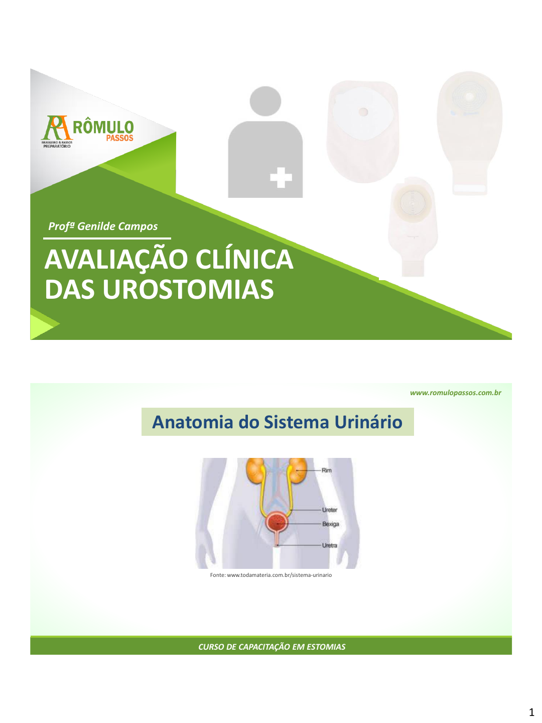 1 AVALIAÇÃO CLÍNICA DAS UROSTOMIAS Profª Genilde Campos www.romulopassos.com.br CURSO DE CAPACITAÇÃO EM ESTOMIAS Anatomia do Sistema Urinário Fonte: www.todamateria.com.br/sistema-urinario Joana Maria Rodrigues Ferreira - 075.506.766-58 2 www.romulopassos.com.br CURSO DE CAPACITAÇÃO EM ESTOMIAS Fisiologia do Sistema Urinário É responsável pela produção e eliminação da urina; Possui a função de filtrar as "impurezas" do sangue que circula no organismo. www.romulopassos.com.br CURSO DE CAPACITAÇÃO EM ESTOMIAS É uma abertura na pele denominada de estoma que permite a saída de urina drenada pelos condutos urinários; Urostomia A urina pode ser proveniente dos rins, ureteres ou bexiga. Joana Maria Rodrigues Ferreira - 075.506.766-58 3 www.romulopassos.com.br CURSO DE CAPACITAÇÃO EM ESTOMIAS Conducto ileal (urostomia de Bricker); Cistostomia; Nefrostomia; Tipos de estomias para eliminação dos efluentes urinários Ureterostomia; Colostomia úmida (conducto colónico). www.romulopassos.com.br CURSO DE CAPACITAÇÃO EM ESTOMIAS Implantação dos ureteres em segmento do íleo previamente isolado; Urostomia de Bricker os ureteres são ligados a uma porção do intestino delgado que é exteriorizado na pele; Localizada no QID da parede abdominal; Efluente urinário com eliminação contínua e ininterrupta; Indicado para prevenir a função renal. Joana Maria Rodrigues Ferreira - 075.506.766-58 4 www.romulopassos.com.br CURSO DE CAPACITAÇÃO EM ESTOMIAS O enfermeiro deve observar o aspecto do estoma; Avaliar a pele periestomal; Características e frequência de eliminação do efluente urinário; Aferir a protusão e tamanho do estoma; Assistência de Enfermagem Prescrever o dispositivo coletor e adjuvantes que se adeque melhor a pele e estilo de vida paciente. Avaliar o estado geral do paciente; www.romulopassos.com.br CURSO DE CAPACITAÇÃO EM ESTOMIAS Obrigada! www.romulopassos.com.br Joana Maria Rodrigues Ferreira - 075.506.766-58