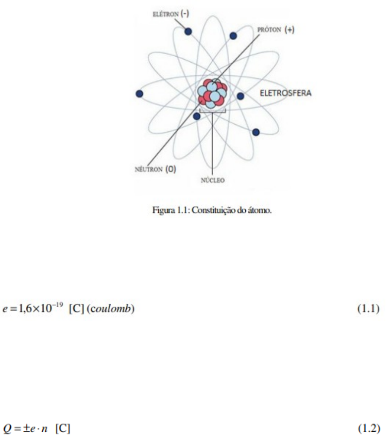 1.1 Átomos e sua estrutura A unidade fundamental da matéria é o átomo, sendo assim, constitui-se da menor partícula de um elemento. O átomo é composto de um núcleo central contendo prótons (carga positiva) e nêutrons (carga nula). A região ao redor do núcleo, chamada de eletrosfera, orbitam os elétrons (carga negativa), tal como ilustra-se na Figura 1.1 : O módulo da carga elétrica de um próton, ou de um elétron, é a menor quantidade de carga possível de se encontrar na natureza, por isso, essa carga é denominado de carga elétrica elementar, que é dada por: Como o valor da carga elétrica do próton e do elétron são diferentes apenas em polaridade (sinal), tem-se que a carga elétrica de um próton é + e e do elétron é − e . Desta forma, conhecendo-se a quantidade de prótons ou elétrons que um corpo qualquer tem em excesso, pode-se calcular o valor da carga elétrica deste corpo: sendo n a quantidade de prótons ou elétrons excedentes no corpo. EXEMPLO Um corpo que inicialmente tem carga elétrica equilibrada (carga nula) é submetido a um processo de eletrização no qual perde 5 elétrons. Calcule a carga elétrica deste corpo após a eletrização. RESPOSTA Um corpo que tem carga elétrica nula possui a mesma quantidade de prótons e elétrons. Se o corpo perdeu 5 elétrons, significa que agora ele possui 5 prótons a mais do que a quantidade de elétrons. Sendo assim, aplica-se a equação (1.2), escolhendo o sinal positivo (pois trata-se de prótons em excesso) e fazendo n = 5: 1.2 Elétrons livres Como dito anteriormente, os elétrons orbitam o núcleo atômico. Acontece que os elétrons mais afastados podem ganhar energia do meio externo e desprender-se do átomo de origem, passando –se chamar elétrons livres. E são os elétrons livres que constituem a famosa corrente elétrica, assunto a ser tratado mais adiante desta apostila. Materiais condutores possuem grande quantidade de elétrons livres. 1.3 Potencial elétrico Uma carga elétrica gera em seu redor um campo elétrico. Dá-se o nome de potencial elétrico a medida associada ao nível de energia potencial de um ponto de um campo elétrico. Colocando uma carca de prova q em um ponto P de um campo elétrico, essa carga adquire uma energia devido ao potencial elétrico deste ponto. A unidade de medida do potencial elétrico é o volt (V) Apresenta-se na Figura 1.2 uma carga elétrica e o seu potencial elétrico. 2. TENSÃO ELÉTRICA OU DIFERENÇA DE POTENCIAL ELÉTRICO (DDP) A tensão elétrica (V), que também é medida em volt (V) é a diferença de potencial elétrico entre dois pontos. A tensão elétrica indica o trabalho que deve ser feito, por unidade de carga, contra um campo elétrico para se movimentar uma carga qualquer. Separando um corpo neutro em duas regiões com cargas opostas cria-se uma tensão elétrica entre essas regiões. Toda fonte de tensão é estabelecida com a simples criação de uma separação de cargas positivas e negativas. Apresenta-se na Figura 2.1 os símbolos que de fontes de tensão, sendo (a) fontes de tensão contínua e (b) fonte de tensão alternada. Quando uma carga de prova é submetida a uma tensão elétrica, ela move-se da região de maior potencial para a região de menor potencial. A tensão elétrica é a grande responsável pelo surgimento da corrente elétrica. 3. CORRENTE ELÉTRICA O deslocamento de cargas elétricas para uma determinada direção e sentido é o que se chama de corrente elétrica. A corrente elétrica origina-se por meio de uma tensão elétrica aplicada entre dois pontos distintos no espaço. Ilustra-se na Figura 3.1 a corrente elétrica gerada por uma bateria. Normalmente utiliza-se a corrente causada pela movimentação de elétrons em um condutor, mas também é possível haver corrente de íons positivos e negativos (em soluções eletrolíticas ou gases ionizados). Em outras palavras, corrente elétrica é a quantidade de carga elétrica que atravessa a secção transversal de um condutor em um intervalo de um segundo. Portanto, o cálculo da intensidade de corrente elétrica (I) é dado por: Sendo Q a carga total que atravessa o corpo e ∆t o intervalo de tempo considerado (Obs: o tempo deve ser considerado em segundos). 4. RESISTÊNCIA ELÉTRICA A resistência elétrica está associada a oposição do fluxo de carga (corrente) em um determinado circuito. Essa oposição é chamada de resistência. Um resistor, é um componente eletroeletrônico que cuja função é adicionar resistência elétrica ao circuito. Seu símbolo é indicado na Figura 4.1 A unidade de medida de resistência elétrica é dada em ohms (Ω). Basicamente, a resistência surge devido as colisões e fricção entre os elétrons livres e outros elétrons, íons e átomos, conforme representa-se na Figura 4.2. Em (a) temse um isolante (resistência alta) e em (b) tem-se um condutor (resistência baixa). 4.1 Fatores que influenciam a resistência elétrica de um corpo - MATERIAL o Condutores: Alumínio (Al), cobre (Cu), ouro (Au), etc. o Isolantes: Madeira (seca), borracha, etc. A seguir, apresenta-se na Tabela 4.1 a resistividade de alguns materiais. COMPRIMENTO: Quanto mais comprido é o corpo, maior será a sua resistência, pois aumenta a quantidade de colisões de elétrons, tal como ilustra-se na Figura 4.3 ÁREA DO CORTE TRANSVERSAL: Quanto maior a área do corte transversal, menor será a resistência, pois isso diminui a quantidade de colisões de elétrons, tal como ilustra-se na Figura 4.4 4.2 Segunda lei de Ohm A 2ª lei de Ohm é a equação básica para o cálculo de resistência elétrica de um corpo. Ela é dada por (4.1): Sendo: ρ = a resistividade do material l = o comprimento do corpo A = a área do corte transversal. Apresenta-se na Figura 4.5 uma exemplificação da 2ª lei de Ohm. 5. 1ª LEI DE OHM, POTÊNCIA E ENERGIA ELÉTRICA 5.1 Primeira lei de OHM A 1ª lei de Ohm revela como as 3 quantidades básicas da eletricidade (te