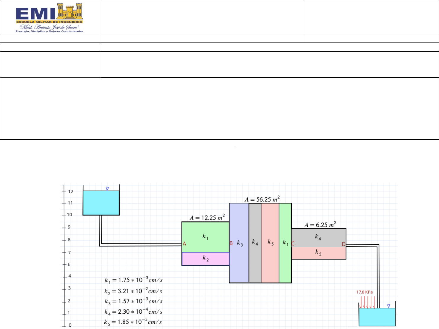 EJERCICIOS 1. El aparato de laboratorio que se muestra en la figura, mantiene una carga constante en ambos reservorios. Se pide determinar: el caudal circulante por el sistema y la velocidad de flujo para el suelo cuya área es 56.25 m2, cuya porosidad es igual a 0.7%. (2.5 Ptos.) NOTA: EL DATO QUE SE ENCUENTRA EN COLOR ROJO, CAMBIAR EL SEGUNDO DIGITO Y DECIMAL CON LOS DOS PRIMEROS NÚMERO DE SUS CODIGOS. EJEMPLO: SI EL COGIGO ES C-7985-5 => REEMPLAZAR A 17.9 KPa. HOJA DE PREGUNTAS EXAMEN 2DO PARCIAL CODIGO DE ESTUDIANTE CARRERA:ING. CIVIL ASIGNATURA: MECANICA DE SUELOS I FECHA: C-23-10-20 CURSO: 5TO DOCENTE: ING. LUCY MABEL CHACON AGUILAR UNIDADES TEMÁTICAS A EVALUAR 1.- CLASIFICACIÓN DE SUELOS 2.- HIDRÁULICA DE LOS SUELOS 3.- ESFUERZOS EFECTIVOS RECOMENDACIONES A LOS ESTUDIANTES 1. Los Estudiantes Tienen 5 (Cinco) minutos para interpretar el examen y realizar preguntas al docente. 2. Según el RAC-07 (RÉGIMEN DISCIPLINARIO), CAP IV. FALTAS Y SANCIONES, Art. 20 tipifica el FRAUDE O INTENTO DE FRAUDE EN EXÁMENES, como “CAUSAL DE SEPARACIÓN SIN DERECHO A REINCORPORACIÓN” de la EMI . 3. Mediante MOODLE el estudiante descargara el examen y subirá el examen resuelto en formato PDF 4. Mediante TEAMS el estudiante está en la obligación de permanecer conectado durante el desarrollo de la prueba. 5. Tiempo de Duración: a. “90 Minutos” para resolver el EXAMEN b. “10 Minutos” para subir el examen en formato PDF