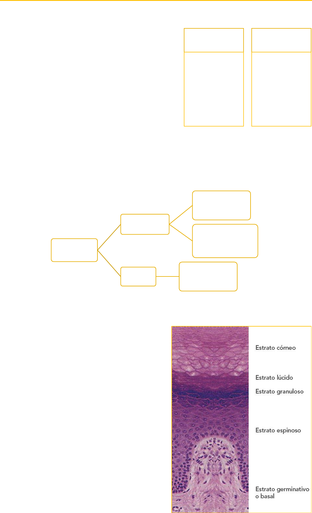 SISTEMA TEGUMENTARIO Univ. Pablo Duarte Pág. 1 1. Generalidades del sistema tegumentario Sistema tegumentario → compuesto por la piel/cutis/tegumento y sus derivados. La piel constituye el órgano más grande del cuerpo, abarcando entre el 15 al 20% de su masa total. La piel consta de dos estratos simples: epidermis y dermis; mostrados en el esquema. Hipodermis → es lo que los anatomistas llaman fascia subcutánea. Consiste en tejido adiposo separado en lobulillos por acción de tabiques de tejido conjuntivo. Es un importante sitio de almacenamiento de energía, actúa como aislante y presenta cél. musculares lisas forman los músculos erectores del pelo. Los derivados epidérmicos de la piel (anexos de la piel) son: - Folículos pilosos y pelo - Glándulas sudoríparas - Glándulas sebáceas - Uñas - Glándulas mamarias • Funciones del sistema tegumentario - Actúa como una barrera que protege contra agentes físicos, químicos y biológicos. - Provee información inmunitaria por un procesamiento de antígenos. - En la homeostasis → regula la temperatura corporal y la pérdida de agua. - Transmite información sensitiva al SN. - Realiza funciones endocrinas → secreta hormonas, factores de crecimiento, citosinas, precursor de la vitamina D3. - Realiza funciones exocrinas → por medio de sus glándulas sudoríparas, sebáceas y apocrinas. • Clasificación de la piel 2. Estratos de la piel 2.1. Epidermis Presenta epitelio plano estratificado. Presenta 4 estratos bien identificados → piel gruesa: 5 estratos. I. Estrato córneo - Compuesto por cél. queratinizadas. II. Estrato lúcido - Se encuentra en la piel gruesa. - Se considera una división del estrato lúcido. III. Estrato granuloso - Células con gránulos abundantes que se tiñen con intensidad. IV. Estrato espinoso/capa espinocítica o de cél. espinosas - Células con proyecciones cortas que se extienden de una célula a otra. V. Estrato basal/estrato germinativo - Presenta células madre de la epidermis con alta actividad mitótica. • Estrato basal Forman una capa monoestratificada apoyada sobre la lámina basal. Apariencia → cúbicas pequeñas o cilíndricas altas. Poco citoplasma y los núcleos se encuentran muy juntos. Son basófilos. Contiene melanina → se transfiere a los melanocitos vecinos de este estrato. Tipos de unión → desmosomas (célula-célula y célula- queratinocito) y hemidesmosoma (célula-lámina basal). Epidermis • Epitelio plano estratificado cornificado. • Crece continuamente, pero mantiene su espesor por procesos de descamación. • Origen ectodérmico. Dermis • Compuesta por tejido conjuntivo denso. • Brinda sostén mecánico y resistencia a la piel. • Origen mesodérmico. Tipos de piel Piel gruesa Ubicadas en las palmas de las manos y las plantas de los pies. Regiones sometidas a fricción, sin pelo y con una capa epidérmica más gruesa. Piel fina Epidermis delgada, folículos pilosos en casi toda su extensión. SISTEMA TEGUMENTARIO Univ. Pablo Duarte Pág. 2 • Estrato espinoso Presentan múltiples evaginaciones citoplasmáticas. Las evaginaciones de cada célula de este estrato se unen a otras evaginaciones por medio de desmosomas. En el MO, el sitio donde está el desmosoma → nodo de Bizzozero. • Estrato granuloso Es la capa más superficial de la porción no queratinizada. Tiene entre una a tres células de espesor. El citoplasma de los queratinocitos de este estrato presenta gránulos de queratohialina → prot. con Cys e His abundante, que son precursoras de la filagrina → la filagrina aglomera los filamentos de queratina. Basofilia intensa. • Estrato córneo Consiste en células anucleadas, aplanadas y desecadas. Pierden su núcleo y sus organelos, se llenan por completo de filamentos de queratina. El espesor de este estrato determina el tipo de piel (gruesa o fina). En la zona más profunda del estrato → la gruesa membrana plasmática de estas células presenta una capa extracelular de lípidos que forman la barrera contra el agua. 2.2. Dermis Se encuentra en estrecha adherencia con la epidermis (unión dermo-epidérmica). En los cortes perpendiculares → se puede ver que la dermis emite abundantes evaginaciones digitiformes llamadas papilas dérmicas, que se extienden hasta la profundidad de la epidermis. Las papilas se complementan con las crestas epidérmicas/interpapilares. En la piel gruesa → existen crestas dérmicas, además de las papilas dérmicas. Estas crestas presentan disposición paralela con las papilas ubicadas entre ellas. Estas crestas forman un patrón distintivo y genéticamente individual en cada individuo por la aparición de pliegues y surcos epidérmicos que se ven en la superficie cutánea. La dermis está formada por 2 capas: dermis papilar y la dermis reticular. Dermis papilar Dermis reticular - Es la capa más superficial. - Consiste en tejido conjuntivo laxo. - Fibras de colágeno tipo 1 y 3 de delgado grosor. - Fibras elásticas de aspecto filiforme. Forman una red irregular. - Contiene vasos sanguíneos que irrigan a la epidermis, pero no ingresan a ella. - Contiene terminaciones nerviosas → o terminan en la dermis o penetran la lámina basal. - Es más profunda. - Su espesor es variable, dependiendo en que parte del cuerpo se encuentre. - Contiene menos células que la dermis papilar. - Presenta gruesos haces de colágeno de disposición irregular. - Contiene fibras elásticas menos delicadas. 3. Células de la epidermis Estrato lúcido - Normalmente, sólo se observa en la piel bien gruesa. - Se tiñe poco por su aspecto refráctil (birrefringente). - Contiene cél. eosinófilas con un proceso de cornificación muy avanzado. Dermatoglifia → ciencia que estudia las huellas dactilares. Producto de las crestas dérmicas. Uniones de la epidermis con la lámina basal - Hemidesmosomas → vinculan los FI - Adhesiones focales → vinculan los FA C é lu la s d e l a e p id e rm is Queratinocitos (≈85%) - Células 