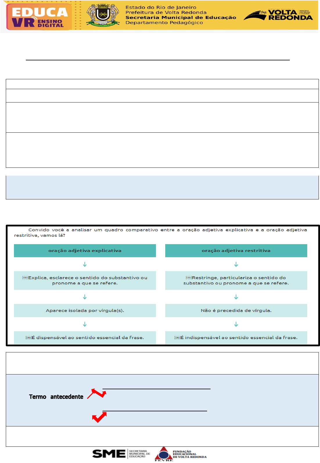 Unidade Escolar: _______________________________________________________________________ Nome:_________________________________________ Data: ___________________ Turma:________ COMPONENTE CURRICULAR: LÍNGUA PORTUGUESA / ATIVIDADE NÃO PRESENCIAL ATIVIDADE 04 9º ANO – 2º BIMESTRE Gramática Semana: 15 de junho a 19 de junho de 2020 Objeto(s) de Conhecimento: Oração Subordinada Adjetiva (Revisão) ▪ Habilidade(s) Explorada(s): ▪ Compreender o conceito de oração subordinada adjetiva; ▪ Classificar as orações subordinadas adjetivas em restritivas e explicativas; ▪ Reconhecer os efeitos de generalização e especificação criados pelo uso de orações subordinadas adjetivas; Orientações para a sua realização: As atividades serão corrigidas e avaliadas pelo seu(sua) professor(a). Você poderá imprimir esse material ou responder as atividades em seu caderno. Copiar o conteúdo explicativo no caderno. Na aula de hoje revisaremos as orações subordinadas adjetivas. Assista à videoaula , leia à explicação presente na atividade e faça os exercícios com atenção. Revisão de Oração Subordinada Adjetiva Considere as duas orações a seguir e, com base no que vimos na aula anterior , vamos analisar a diferença entre elas: 1)Os funcionários que aceitaram o acordo salarial voltaram ao trabalho. 2)Os funcionários , que aceitaram o acordo salarial , voltaram ao trabalho. Termo antecedente Na frase 1 , temos uma oração adjetiva restritiva : “ que aceitaram o acordo salarial “. Ela tem a função de restringir o substantivo “ funcionários” . Então , pode-se inferir que :nem todos os funcionários aceitaram o acordo salarial , somente alguns . Na frase 2 , temos uma oração adjetiva explicativa , note que ela está isolada por vírgulas :” que aceitaram o acordo salarial “. Ela tem a função de explicar o substantivo “ funcionários”. Nesse sentido , depreende-se que todos os funcionários aceitaram o acordo salarial e todos voltaram ao trabalho. Pronomes relativos: As orações subordinadas adjetivas são introduzidas pelos pronomes relativos : Que , onde , o qual (a qual , os quais , as quais ), cujo , cuja , cujos ,cujas). ATIVIDADES 1)Leia a tirinha a seguir: a)Copie do período expresso no primeiro quadrinho a oração subordinada adjetiva ,indicando a que termo essa oração se refere: 2)Copie a oração subordinada adjetiva presente nas tiras abaixo ,indique o termo antecedente e classifique -as em restritiva e explicativa: a)”Principalmente das coisas que ele toma da gente.” b)A matéria como rapper foi feita para os jovens que leem a revista. c) A ajuda que países mais ricos enviaram chegou com atraso para as vítimas. d)Algumas pessoas , que revelaram muita indiferença , mal compreendiam o sofrimento das vítimas. 3)Reescreva no caderno as orações a seguir , substituindo o * pelo pronome relativo adequado: a)Esta é a sala * você deverá trabalhar. b)Estudei algumas teorias * descobri quanto a vida na terra está ameaçada. c)Essa ideia * você se apoia é muito fora da realidade. d)O lugar *alguns animais do zoológico foram transferidos não é adequado. e)Estes são os livros * você deverá fazer sua pesquisa. 4)Leia este texto: A poluição causa o efeito estufa. Em primeiro lugar, efeito estufa , por si só, é uma coisa boa: sem ele , a Terra seria um picolé. O efeito estufa funciona como cobertor gases que retém calor e a luz solar perto da superficie do planeta. Seu principal causador é o dioxido de carbono , o gás que emitimos quando soltamos o ar da respiração , e que não tem efeito tóxico nenhum sobre os seres vivos . Portanto , não dá para chamá-lo de poluente. (Revista Galilei, nº 172) No texto a três orações subordinadas adjetivas. a) Identifique - as e copie -as no caderno : b) Classifique as orações em restritiva e explicativa: 5) Leia a tira e depois responda às questões propostas: a) A tirinha faz menção ao projeto de transposição de parte das águas do rio São Francisco para a região do semiárido nordestino. Por que a personagem aparece com uma boia no último quadrinho? b) A que termo antecedente se refere o pronome relativo que? c) Se a oração subordinada adjetiva que desvia rio para o sertão fosse retirada, poderíamos entender completamente o período? 6) Explique a diferença de sentido entre os pares de orações adjetivas e classifique-as em EXPLICATIVA ou RESTRITIVA: a. I. O homem , que se considera racional, muitas vezes age animalescamente. II. O homem que se considera racional muitas vezes age animalescamente . b)I. Os idosos , que gostam de dançar , se divertiram muito. II . Os idosos que gostam de dançar se divertiram muito.