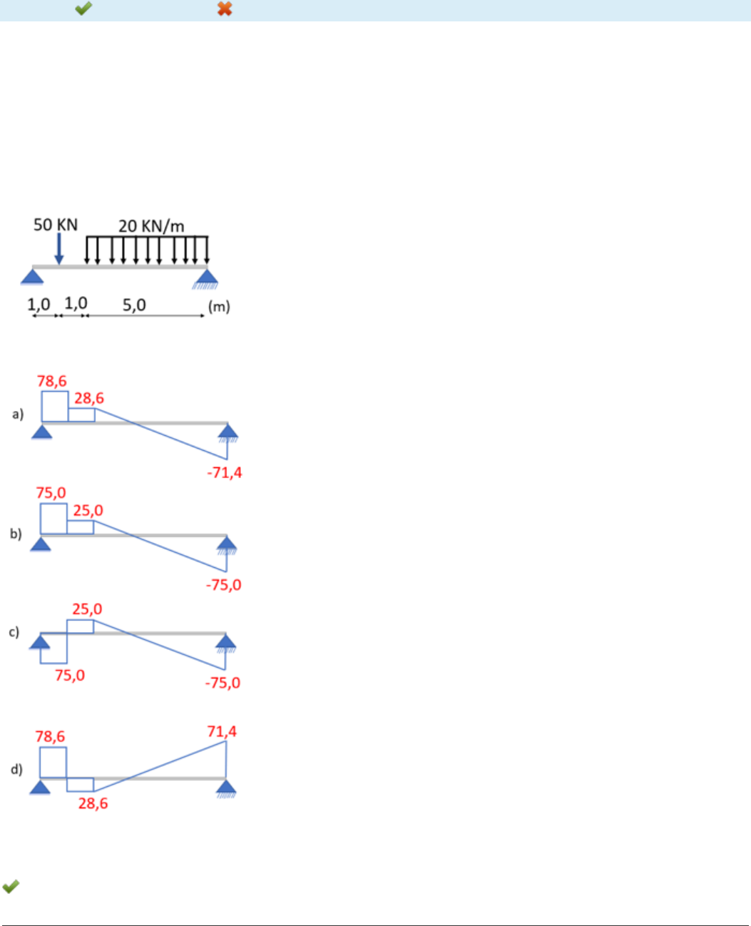 Disciplina: Introdução à Mecânica das Estruturas (EMC109) Avaliação: Avaliação Final (Objetiva) - Individual Semipresencial ( Cod.:656263) ( peso.:3,00) Prova: 24487978 Nota da Prova: 10,00 Legenda: Resposta Certa Sua Resposta Errada 1 . Esforço cortante, força cortante ou força de cisalhamento é a força interna desenvolvida em membros estruturais que atua tangencialmente sobre a área de seção transversal de uma peça (HIBBELER, 2011). Para a viga a seguir, verifique qual desenho corresponde ao diagrama de esforço cortante da viga: FONTE: HIBBELER, R. C. Resistência dos materiais. 7. ed. São Paulo: Editora Pearson, 2011. Disponível em: https://www.academia.edu/23488984/Livro_Resist%C3%AAncia_dos_Materiais_R._C._Hibbeler_7a_Edi %C3%A7%C3%A3o. Acesso em: 21 maio. 2019. a) Diagrama II. b) Diagrama III. c) Diagrama IV. d) Diagrama I. 2. Graus de liberdade de uma estrutura são o número de movimentos rígidos possíveis e independentes que https://portaldoalunoead.uniasselvi.com.br/ava/notas/request_gabarito_n2.php?action1=RUNFMDEwMA==&action2=RU1DMTA5&action3=NjU2MjYz&action4=MjAyMC8y&prova=MjQ0ODc5Nzg=#questao_1%20aria-label= https://portaldoalunoead.uniasselvi.com.br/ava/notas/request_gabarito_n2.php?action1=RUNFMDEwMA==&action2=RU1DMTA5&action3=NjU2MjYz&action4=MjAyMC8y&prova=MjQ0ODc5Nzg=#questao_1%20aria-label= https://portaldoalunoead.uniasselvi.com.br/ava/notas/request_gabarito_n2.php?action1=RUNFMDEwMA==&action2=RU1DMTA5&action3=NjU2MjYz&action4=MjAyMC8y&prova=MjQ0ODc5Nzg=#questao_2%20aria-label= um corpo pode executar. Estruturas submetidas a forças atuantes em um só plano, por exemplo x,y possuem 3 graus de liberdade pois podem apresentar 2 translações na direção dos dois eixos e 1 rotação em torno do eixo perpendicular ao plano que contém as forças externas. Sobre o que corresponde a melhor descrição de uma estrutura hiperestática, assinale a alternativa CORRETA: a) Toda estrutura, a qual a partir de conhecidas as reações de apoio, não for possível determinar os esforços das secções será externamente hiperestática e toda estrutura em que não for possível determinar todas as reações de apoio será internamente hiperestática. b) Toda estrutura, a qual a partir de conhecidas as reações de apoio, não for possível determinar os esforços das secções será de um grau hiperestático e toda estrutura em que não for possível determinar todas as reações de apoio terá mais de um grau hiperestático. c) Toda estrutura, a qual a partir de conhecidas as reações de apoio, não for possível determinar os esforços das secções será internamente hiperestática e toda estrutura em que não for possível determinar todas as reações de apoio será externamente hiperestática. d) Toda estrutura, a qual a partir de conhecidas as reações de apoio for possível determinar os esforços das secções será externamente hiperestática e toda estrutura em que for possível determinar todas as reações de apoio será internamente hiperestática. 3. A equivalência estática é uma relação de equivalência entre sistemas de forças aplicadas sobre um corpo. Dados dois sistemas de forças, diz-se que são estaticamente equivalentes se, e somente se, a força resultante e o momento resultante de ambos sistemas de forças são idênticos. Com relação ao sistema estrutural da figura, classifique V para as sentenças verdadeiras e F para as falsas: ( ) A Força resultante do sistema é de 1380 KN. ( ) O Momento resultante no ponto B é anti-horário com valor de MB = 1432,5 KN.m. ( ) A posição da força resultante para que o sistema reduzido seja mecanicamente equivalente ao sistema original, em relação ao ponto A, é de x = 7,705 m. ( ) O momento gerado por uma força é igual à soma da sua intensidade e à distância da força ao ponto analisado. Assinale a alternativa que apresenta a sequência CORRETA: a) V - F - V - F. b) F - F - V - V. c) F - V - F - V. d) F - V - V - F. 4. Uma estrutura é hiperestática quando for restringida e o número de incógnitas for superior ao número de equações de equilíbrio do sistema. Para a estrutura da figura, determine o grau de hiperestaticidade: https://portaldoalunoead.uniasselvi.com.br/ava/notas/request_gabarito_n2.php?action1=RUNFMDEwMA==&action2=RU1DMTA5&action3=NjU2MjYz&action4=MjAyMC8y&prova=MjQ0ODc5Nzg=#questao_3%20aria-label= https://portaldoalunoead.uniasselvi.com.br/ava/notas/request_gabarito_n2.php?action1=RUNFMDEwMA==&action2=RU1DMTA5&action3=NjU2MjYz&action4=MjAyMC8y&prova=MjQ0ODc5Nzg=#questao_4%20aria-label= a) gh = 1. b) gh = 0. c) gh = -1. d) gh = 2. 5. Em uma estrutura denominam-se as ações sobre a estrutura como cargas atuantes e as reações de apoio como cargas resistentes. Em atenção à viga biapoiada da figura anexa, considerando as distâncias "a" e "b" diferentes, analise as sentenças a seguir: I- A reação de apoio VA é igual a VB, com valor de [(P*L) / 2]. II- O momento fletor no ponto C equivale a [(P*a*b) / L]. III- O esforço cortante na metade da distância "a" equivale a [(P*b) / L]. Assinale a alternativa CORRETA: a) As sentenças I e II estão corretas. b) Somente a sentença II está correta. c) As sentenças II e III estão corretas. d) Somente a sentença I está correta. 6. Denominam-se estruturas hiperestáticas aquelas que exigem a consideração das deformações na determinação de suas reações de apoio e de seu estado interno de tensões. Qual desses métodos não é utilizado para análise dos esforços internos de uma estrutura hiperestática? a) Teorema de Stevin b) Método da integração direta. c) Princípio dos trabalhos virtuais. d) Teorema de Castigliano. 7. Pórtico é definido na engenharia como uma estrutura constituída por barras, geralmente horizontais e verticais (por vezes inclinadas). Com relação ao pórtico da figura anexa, classifique V para as sentenças verdadeiras e F para as falsas: ( ) O momento atuante na rótula (lo