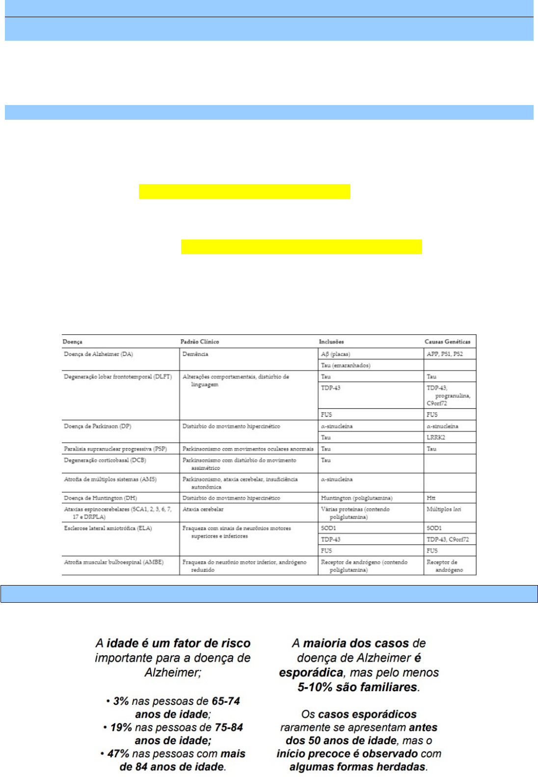 FISIOPATOLOGIA 2 Karoline Barbosa da Silva segunda-feira, 26 de outubro de 2020 DEMÊNCIAS DEMÊNCIA “É definida como déficits múltiplos persistentes e progressivos comprometendo a memória e um ou mais dos seguintes domínios: linguagem, capacidade visuoespacial, emoção, personalidade ou cognição, capazes de interferir com as atividades sociais e ocupacionais. DOENÇAS NEURODEGENERATIVAS Distúrbios caracterizados pela perda progressiva de neurônios que cursam com o acúmulo anormal de proteínas devido a uma alteração na conformação da proteína, no metabolismo e processamento dessa e a produção excessiva de proteínas. Duas abordagens: Sintomática/anatômica: baseada nas regiões anatômicas do SNC que são primariamente afetadas, o que em geral se reflete nos sintomas clínicos (p. ex., envolvimento neocortical resultando em prejuízo cognitivo e demência). Patológica: baseada nos tipos de inclusão ou de estruturas anormais observadas (p. ex., doenças com inclusões contendo tau ou contendo sinucleína); O acúmulo de proteínas é conhecido como substância tóxica e isso pode comprometer a função dos neurônios somado a infamação gerada, resultando na destruição dessas células. Com isso, a sinapse que antes ocorria é prejudicada. DOENÇA DE ALZHEIMER É a causa mais comum de demência na população idosa. Patogenia Na fisiologia as enzimas alfa e gama secretase realizam a clivagem da proteína precursor de amiloide, gerando um peptídeo que é facilmente quebrado pois é solúvel Na via patológica ao invés da alfa secretase fazer a clivagem da proteína precursora, a beta secretase atua no lugar dela. Contudo, essa enzima faz a quebra em um local diferente da proteína, gerando um peptídeo maior que não é solúvel, ou seja, o organismo não consegue utilizá-lo em outras funções. O peptídeo gerado acaba acumulando-se no espaço extracelular, esse se junta com outros peptídeos gerando agregados maiores gerando, posteriormente, as placas e emaranhados. A amiloide beta se deposita na parede dos vasos sanguíneos desenvolvendo a angiopatia amiloide cerebral eu curso com hemorragia. Características patológicas: emaranhados neurofibrilares e placas Manifestações clínicas Início insidioso • Prejuízo da função intelectual superior • Alterações de humor e comportamento. Mais tarde • Desorientação • Perda de memória e afasia (indicativos de disfunção cortical grave) • ao longo de mais 5-10 anos o paciente se torna profundamente incapacitado, mudo e imóvel. Geralmente, a morte devido a pneumonia intercorrente ou a outras infecções DEGENERAÇÃO LOBAR FRONTOTEMPORAL (DEMÊNCIA FRONTOTEMPORAL) É a segunda causa mais frequente de demência pré-senil, com idade de início geralmente entre 45 e 65 anos. Está associada à atrofia do lobo frontal e temporal, levando a uma disfunção progressiva do comportamento, personalidade e linguagem, principalmente com preservação da memória. Diferentes subgrupos são caracterizados por inclusões neuronais envolvendo as regiões afetadas. É subclassificada em três patologias distintas e não sobrepostas: -Tau (doença de Pick) (50%) -TDP ‐ 43 (45%) -FUS (5%) DOENÇA DE PARKINSON É uma doença neurodegenerativa marcada por um distúrbio de movimento hipocinético proeminente, que é causada pela perda de neurônios dopaminérgicos de substância nigra. Patogenia Aqui também há um acúmulo anormal de proteína alfa sinucleína. Fisiologicamente, ela é fundamental para a homeostase da vesícula pré-sináptica, ou seja, ela é fundamental para a transmissão de sinapses entre os neurônios. Quando ocorre esse acúmulo, o comprometimento da sinapse é geral, envolvendo a liberação de neurotransmissores. Além da inflamação dos neurônios e indução de apoptose deles. Além disso, os EROS comprometendo a proteostase. Manifestações clínicas Sinais e sintomas extrapiramidais, como bradicinesia, rigidez, tremor durante o repouso, postura encurvada e marcha com passos progressivamente encurtados e acelerados, acompanhados de face inexpressiva característica. A morte geralmente é o resultado de infecção intercorrente ou trauma decorrente das quedas frequentes provocadas pela instabilidade postural. Quando a demência surge no intervalo de um ano a partir do início dos sintomas motores, é chamada demência do corpúsculo de Lewy (DCL).