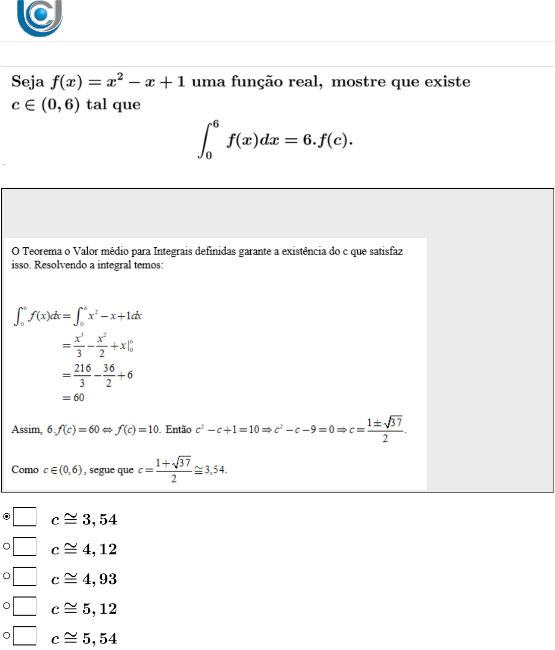 UNICESUMAR - CENTRO UNIVERSITÁRIO CESUMAR PRÉ-VISUALIZAÇÃO DE QUESTÕES QUESTÃO 01 | Objetiva Código: 28666 . Resposta esperada: BRESCANSIN, Alexandra Yatsuda Fernandes. Cálculo Diferencial e Integral I. Maringá: UniCesumar, 2016. [Unidade IV]. A B C D E UNICESUMAR - CENTRO UNIVERSITÁRIO CESUMAR PRÉ-VISUALIZAÇÃO DE QUESTÕES QUESTÃO 02 | Objetiva Código: 28956 . Resposta esperada: BRESCANSIN, Alexandra Yatsuda Fernandes. Cálculo Diferencial e Integral I. Maringá: UniCesumar, 2016. [Unidades IV e V]. UNICESUMAR - CENTRO UNIVERSITÁRIO CESUMAR PRÉ-VISUALIZAÇÃO DE QUESTÕES A B C D E QUESTÃO 03 | Objetiva Código: 28962 . Resposta esperada: BRESCANSIN, Alexandra Yatsuda Fernandes. Cálculo Diferencial e Integral I. Maringá: UniCesumar, 2016. [Unidade IV]. UNICESUMAR - CENTRO UNIVERSITÁRIO CESUMAR PRÉ-VISUALIZAÇÃO DE QUESTÕES A B C D E QUESTÃO 04 | Objetiva Código: 176252 As técnicas de integração são procedimentos analíticos utilizados para encontrar antiderivadas de funções e tem função de facilitar os procedimentos para tal. Algumas das técnicas mais conhecidas são as de integração por substituição, partes e frações parciais. Usando uma das técnicas, assinale a alternativa que indica a resposta correta da integral . Resposta esperada: Resposta presente no tópico "Integração por Substituição e Integração por Partes", na página 203, da unidade IV do livro BRESCANSIN, Alexandra Yatsuda Fernandes. Cálculo Diferencial e Integral. Alexandra Yatsuda Fernandes Brescansin. Reimpressão. Maringá-Pr.: UniCesumar, 2017. 307 p. Utilizando-se da tecnica de integral por substituição, temos: . A 0. B 1. C ln(2). D ln(3). E ln(5). UNICESUMAR - CENTRO UNIVERSITÁRIO CESUMAR PRÉ-VISUALIZAÇÃO DE QUESTÕES QUESTÃO 05 | Objetiva Código: 176256 Com relação ao conceito de integrais definidas, analise as afirmativas seguintes. É correto o que se afirma em: Resposta esperada: Resposta presente no tópico "Área e a Integral Definida", na página 209, da unidade IV do livro BRESCANSIN, Alexandra Yatsuda Fernandes. Cálculo Diferencial e Integral. Alexandra Yatsuda Fernandes Brescansin. Reimpressão. Maringá-Pr.: UniCesumar, 2017. 307 p. . A II, apenas. B I e III, apenas. C II e III, apenas. D I, III e IV, apenas. E I, II, III e IV. UNICESUMAR - CENTRO UNIVERSITÁRIO CESUMAR PRÉ-VISUALIZAÇÃO DE QUESTÕES QUESTÃO 06 | Objetiva Código: 253787 Sobre os conceitos de derivadas, analise cada uma das sentenças abaixo. . É correto o que se afirma em: Resposta esperada: Resposta presente no tópico "Regras de Derivação", na página 156, da unidade III do livro BRESCANSIN, Alexandra Yatsuda Fernandes. Cálculo Diferencial e Integral. Alexandra Yatsuda Fernandes Brescansin. Reimpressão. Maringá-Pr.: UniCesumar, 2017. 307 p. . A I, apenas. B II, apenas. C I e III apenas. D II e III, apenas. E I, II e III. UNICESUMAR - CENTRO UNIVERSITÁRIO CESUMAR PRÉ-VISUALIZAÇÃO DE QUESTÕES QUESTÃO 07 | Objetiva Código: 253790 Seja f: R → R, sendo R o conjunto dos numeros reais, uma função bijetiva definida por y = f(x). Resolvendo y = f(x) para x em função de y, temos determinado uma função x = g(y) . Esta função é a função inversa de f e a indicamos por f -1. Considere a função f(x) e sua inversa, a f -1(x): Assinale a alternativa que indica o valor da soma a + b + c. Resposta esperada: Resposta presente no tópico "Funções Inversas", na página 60, da unidade I do livro BRESCANSIN, Alexandra Yatsuda Fernandes. Cálculo Diferencial e Integral. Alexandra Yatsuda Fernandes Brescansin. Reimpressão. Maringá-Pr.: UniCesumar, 2017. 307 p. Para se obter a inversa fazemos a substituição de x por y e y por x, em seguida isolamos o valor de y . . Assim temos a = 5, b = 3 e c = 2. Logo, a + b + c = 10. A 8. B 9. C 10. D 11. E 12. UNICESUMAR - CENTRO UNIVERSITÁRIO CESUMAR PRÉ-VISUALIZAÇÃO DE QUESTÕES QUESTÃO 08 | Objetiva Código: 253967 Se f e g são funções diferenciáveis, então, , a qual é chamada de fórmula de integração por partes. Usando esta fórmula, em várias situações podemos tornar um problema de integração mais simples. Considere a função F(x) definida abaixo: , na qual F(0) = 5. Neste sentido, analise as afirmativas seguintes com relação ao termo independente de F. I. ímpar. II. primo. III. quadrado perfeito. IV. múltiplo de 3. É correto o que se afirma em: Resposta esperada: Resposta presente no tópico "Integração por Substituição e Integração por Partes", na página 203, da unidade IV do livro BRESCANSIN, Alexandra Yatsuda Fernandes. Cálculo Diferencial e Integral. Alexandra Yatsuda Fernandes Brescansin. Reimpressão. Maringá-Pr.: UniCesumar, 2017. 307 p. . A I e II, apenas. B II e III, apenas. C III e IV, apenas. D I, II e IV, apenas. E I, II, III e IV. UNICESUMAR - CENTRO UNIVERSITÁRIO CESUMAR PRÉ-VISUALIZAÇÃO DE QUESTÕES QUESTÃO 09 | Objetiva Código: 254048 Se o grau de P for estritamente menor que o grau do denominador (grau de P < 2), então, com x diferente de α ou β, podemos escrever . e assim, . Com base nestas informações temos: . Analise os itens abaixo: I. O valor de A é um número primo. II. O valor de B é múltiplo de 3. III. Se f(2) = 0 então k = -3.ln(4). É correto o que se afirma em: Resposta esperada: Resposta presente no tópico "Tópicos Adicionais de Integração", na página 225, da unidade IV do livro BRESCANSIN, Alexandra Yatsuda Fernandes. Cálculo Diferencial e Integral. Alexandra Yatsuda Fernandes Brescansin. Reimpressão. Maringá-Pr.: UniCesumar, 2017. 307 p. . Pois, 5x=Ax+Bx => 5x=(A+B)x => 5=A+B e 1=2A-B => B=2A-1. I. CORRETO, pois A = 2 é um número primo. II. CORRETO, pois B = 3 é um múltiplo de 3. III. CORRETO. . A I apenas. B II apenas. C I e III apenas. D II e III apenas. E I, II e III. UNICESUMAR - CENTRO UNIVERSITÁRIO CESUMAR PRÉ-VISUALIZAÇÃO DE QUESTÕES QUESTÃO 10 | Objetiva Código: 254055 Considere as funções polinomiais f,g: R → R d