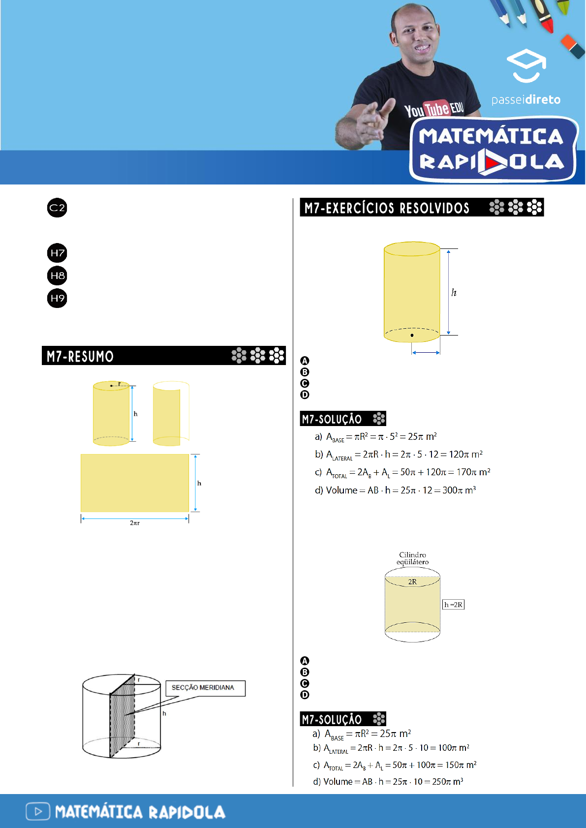 CILINDRO Utilizar o conhecimento geométrico para realizar a leitura e a representação da realidade e agir sobre ela. Identificar características de figuras planas ou espaci- ais. Resolver situação-problema que envolva conhecimen- tos geométricos de espaço e forma. Utilizar conhecimentos geométricos de espaço e forma na seleção de argumentos propostos como solução de problemas do cotidiano. 1. CILINDRO CIRCULAR RETO 𝐴𝑏𝑎𝑠𝑒 = 𝜋. 𝑟 2 𝐴𝐿 = 2. 𝜋. 𝑟. ℎ 𝑉 = 𝐴𝐵𝑎𝑠𝑒 . ℎ OBSERVAÇÕES: - CILINDRO EQUILÁTERO – são cilindros cuja seção meridiana é um quadrado, ou seja, h = 2.r. 1. Se um cilindro circular reto tem 10m de diâmetro da base e 12m de altura, determine: área da base área lateral área total volume 2. Se um cilindro circular equilátero tem 10m de diâmetro da base, determine: área da base área lateral área total volume 1. Qual o volume desta peça de cilindro. 112,5π cm3 132,5π cm3 212,5π cm3 116,5π cm3 312,5π cm3 2. (UFRN) Um copo cilíndrico, cujo diâmetro interno mede 6cm e cuja a altura interna mede 10 cm contem certo volume de água. Inclinando o máximo possível esse copo, sem derramar água, obtemos a medida descrita na figura ao lado. Qual o volume de água contida no copo? 81cm3 91cm3 101cm3 71cm3 21cm3 3. (CESUPA) A quantidade de vinho depositada em um tonel de forma cilíndrica ocupa 1/3 da capacidade total do tonel. Ao serem retirados 30 litros de vinho desse tonel, a altura do nível do vinho baixa 30%. A capacidade total desse tonel é, em litros, igual a 900 650 300 150 4. (CESUPA) Uma doceira utiliza duas embalagens, X e Y, para acondicionar seus produtos. A primeira embalagem (X) tem formato de um cilindro reto cujas medidas da altura e do diâmetro da base medem, cada uma, 20 cm, e a segunda (Y) tem a forma de um cubo com 18 cm de aresta. Assim sendo, podemos afirmar que a capacidade de X é menor que a de Y. X e Y têm mesma capacidade. a capacidade de X é maior que a de Y. as capacidades de X e Y não podem ser comparadas pois as formas são diferentes. 5. (CESUPA) Para as comemorações de um torneio, a equipe campeã reservou um barril de chopp para ser servido em tulipas. O barril tem a forma de um cilindro circular reto com 15 cm de raio e 40 cm de altura, e a tulipa tem formato de um cone reto com 3cm de raio e 10cm de altura. A quantidade de tulipas que podem ser servidas com o chopp de um barril é 100 200 300 400 6. (CESUPA) Sete cubos de gelo, com 4cm de aresta cada um, derretem dentro de um copo cilíndrico, inicialmente vazio, e cujo raio da base também é igual a 4 cm. Depois de ter o gelo derretido completamente, a altura do nível da água no copo será de aproximadamente: (Use π = 3,14) 7,5 cm 8 cm 8,5 cm 9 cm 5 7. (ENEM) Uma artesã confecciona dois diferentes tipos de vela ornamental a partir de moldes feitos com cartões de papel retangulares de 20 cm x 10 cm (conforme ilus- tram as figuras abaixo). Unindo dois lados opostos do cartão, de duas maneiras, a artesã forma cilindros e, em seguida, os preenche completamente com parafina. Supondo-se que o custo da vela seja diretamente pro- porcional ao volume de parafina empregado, o custo da vela do tipo I, em relação ao custo da vela do tipo II, será o triplo. o dobro. igual a metade. a terça parte. 08. (ENEM) A figura ao lado mostra um reservatório de água na forma de um cilindro circular reto, com 6 m de altura. Quando está completamente cheio, o reservatório é suficiente para abastecer, por um dia, 900 casas cujo consumo médio diário é de 500 litros de água. Suponha que, um certo dia, após uma campanha de conscientização do uso da água, os moradores das 900 casas abastecidas por esse reservatório tenham feito economia de 10% no consumo de água. Nessa situação a quantidade de água economizada foi de 4,5 m3. a altura do nível da água que sobrou no reservatório, no final do dia, foi igual a 60 cm. a quantidade de água economizada seria suficiente para abastecer, no máximo, 90 casas cujo consumo diário fosse de 450 litros. os moradores dessas casas economizariam mais de R$ 200,00, se o custo de 1 m3 de água para o con- sumidor fosse igual a R$ 2,50. um reservatório de mesma forma e altura, mas com raio da base 10% menor que o representado, teria água suficiente para abastecer todas as casas. 9. (ENEM) Dona Maria, diarista na casa da família Teixeira, precisa fazer café para servir as vinte pessoas que se encontram numa reunião na sala. Para fazer o café, Dona Maria dispõe de uma leiteira cilíndrica e copinhos plásticos, também cilíndricos. Com o objetivo de não desperdiçar café, a diarista de- seja colocar a quantidade mínima de água na leiteira para encher os vinte copinhos pela metade. Para que isso ocorra, Dona Maria deverá Encher a leiteira ate a metade, pois ela tem um vo- lume 20 vezes maior que o volume do copo. Encher a leiteira toda de água, pois ela tem um vo- lume 20 vezes maior que o volume do copo. Encher a leiteira toda de água, pois ela tem um vo- lume 10 vezes maior que o volume do copo. Encher duas leiteiras de água, pois ela tem um vo- lume 10 vezes maior que o volume do copo. Encher cinco leiteiras de água, pois ela tem um vo- lume 10 vezes maior que o volume do copo. 10. (ENEM) Para construir uma manilha de esgoto, um cilindro com 2 m de diâmetro e 4 m de altura (de espessura desprezível), foi envolvido homogeneamente por uma camada de concreto, contendo 20 cm de espessura. Supondo que cada metro cúbico de concreto custe R$ 10,00 e tomando 3,1 como valor aproximado de π, então o preço dessa manilha e igual a R$ 230,40. R$ 124,00. R$104,16. R$ 54,56. R$ 49,60. 11. (ENEM), em três tamanhos, com medidas indicadas nas figuras. O preço do tanque e diretamente proporcional a medida da área da superfície lateral do tanque. O dono de um posto de combustível deseja encomendar um tanque com menor custo por metro cúbico de capacidade de armazenam