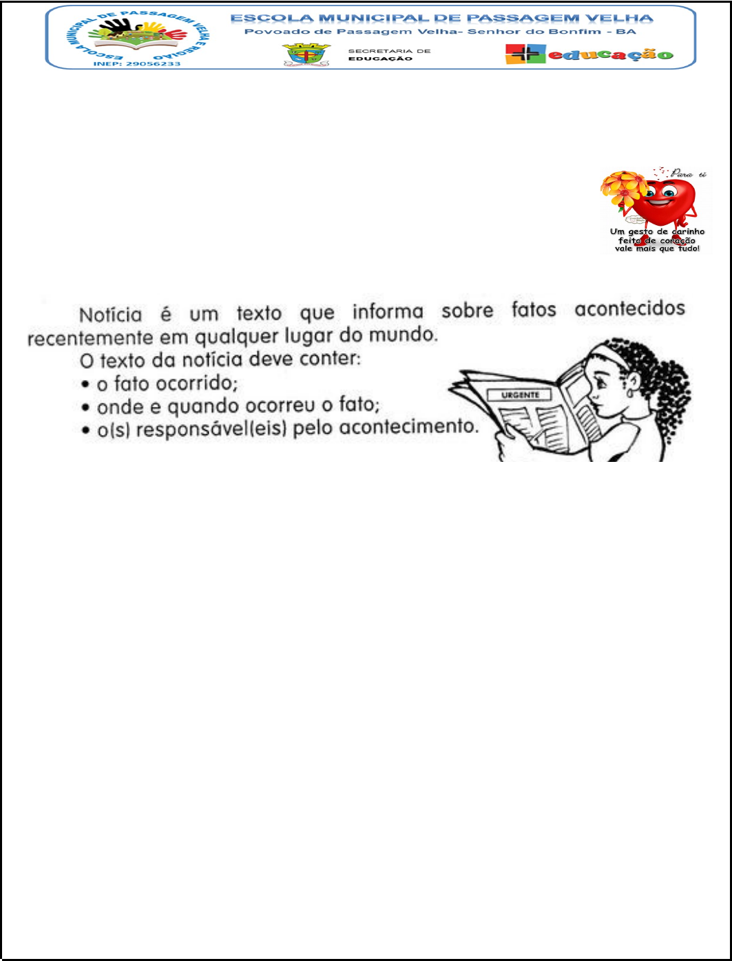 NOME____________________________________________________DATA______/_____/2020 PROFESSOR(A):______________________ ______ANO ATIVIDADE REMOTA DE PORTUGUÊS- 5º Bloco “Família e escola: união que faz a diferença” I- LEIA, abaixo, sobre o gênero textual: NOTÍCIA. CARACTERÍSTICAS GÊNERO NOTÍCIA: · Narrativa curta oral ou escrita: de jornais, revistas, TV ou rádio. · Acontecimento atual: relata fatos verdadeiros e recentes, de interesse geral · A notícia contém sempre uma novidade. Narrativa (significado) - é maneira de narrar, de contar alguma coisa. II - AGORA, RESPONDA. a) Marque com um (X) onde podemos ler uma NOTÍCIA: No conto de fadas Nos jornais Na história em quadrinhos b) Assinale a alternativa com características do gênero Noticia: ( ) narrativa curta de jornais, TV ou rádio. ( ) faz um pedido para o leitor. III- LEIA A NOTÍCIA ABAIXO: Responda: a) Sobre o que nos fala esse texto? _____________________________________________________________________ b) Dê as informações sobre o golfinho: apelido_________ peso_____________ comprimento______________ idade____________ cor____________ c) Que “gênero” é esse texto? a) Recado - ( ) b) Notícia ( de jornal)- ( ) c) Cartaz - ( ) IV-AGORA, VAMOS APRENDER SOBRE SUBSTANTIVOS. LEIA! SUBSTANTIVOS SÃO AS PALAVRAS QUE DÃO NOME AOS SERES, SENTIMENTOS, LUGARES, QUALIDADES, ETC. · SUBSTANTIVO PRÓPRIO: DÁ NOME A UM SER ESPECIFICO E É ESCRITO COM A PRIMEIRA LETRA MAIÚSCULA. EX.: CAMILA; · SUBSTANTIVO COMUM: DÁ NOME AOS SERES DA MESMA ESPÉCIE. EX.: CACHORRO, MENINO, ARVORE. · RESPONDA: .