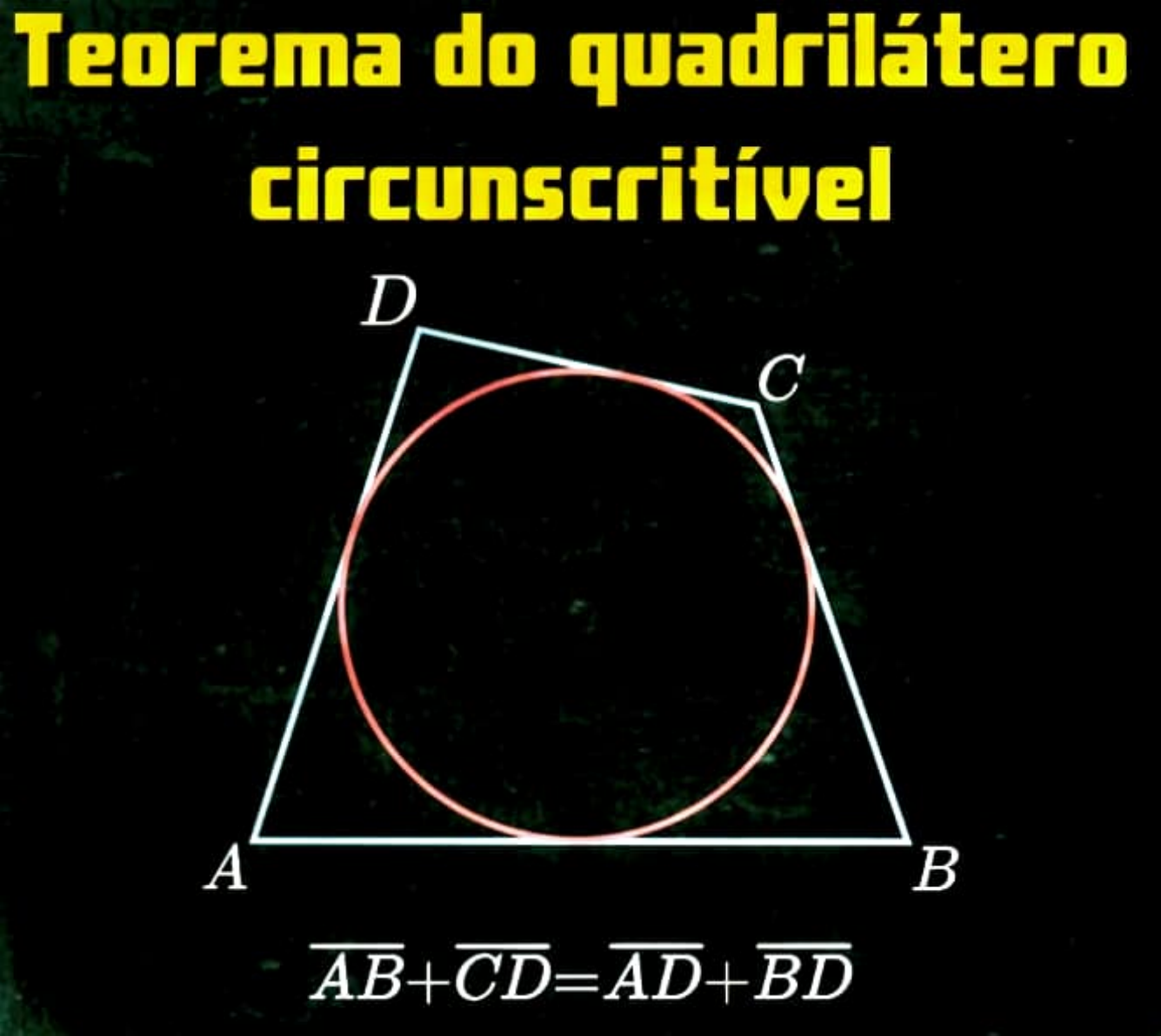 Teorema do quadrilátero cirlc:unscritíue:I D AB+CD---=AD+BD Um quadrilátero convexo é circunscrito a uma circunferência se, e somente se, seus quatro lados são tangentes à circunferência. Se um quadrilátero convexo é circunscrito a uma circunferência, então a soma de dois lados opostos é igual à soma dos outros dois. Dado um quadrilátero ABCD circunscrito à uma circunferência, então: AB+CD=AD+BD Exemplo: Vamos calcular os lados e o perímetro do quadrilátero abaixo circunscrito à circunferência: 3p+ 1 Primeiro, descobrimos o valor de p: ( 3p + 1) + (p + 1) = 3p + 2p 4p + 2 = 5p p = 2 Depois as medidas dos lados: AB 3p+l 7 BC 2p ·4 CD -· p+l 3 DA 3p 6 E, por fim, o perímetro: P = 7 + 4 + 3 + 6 = 20