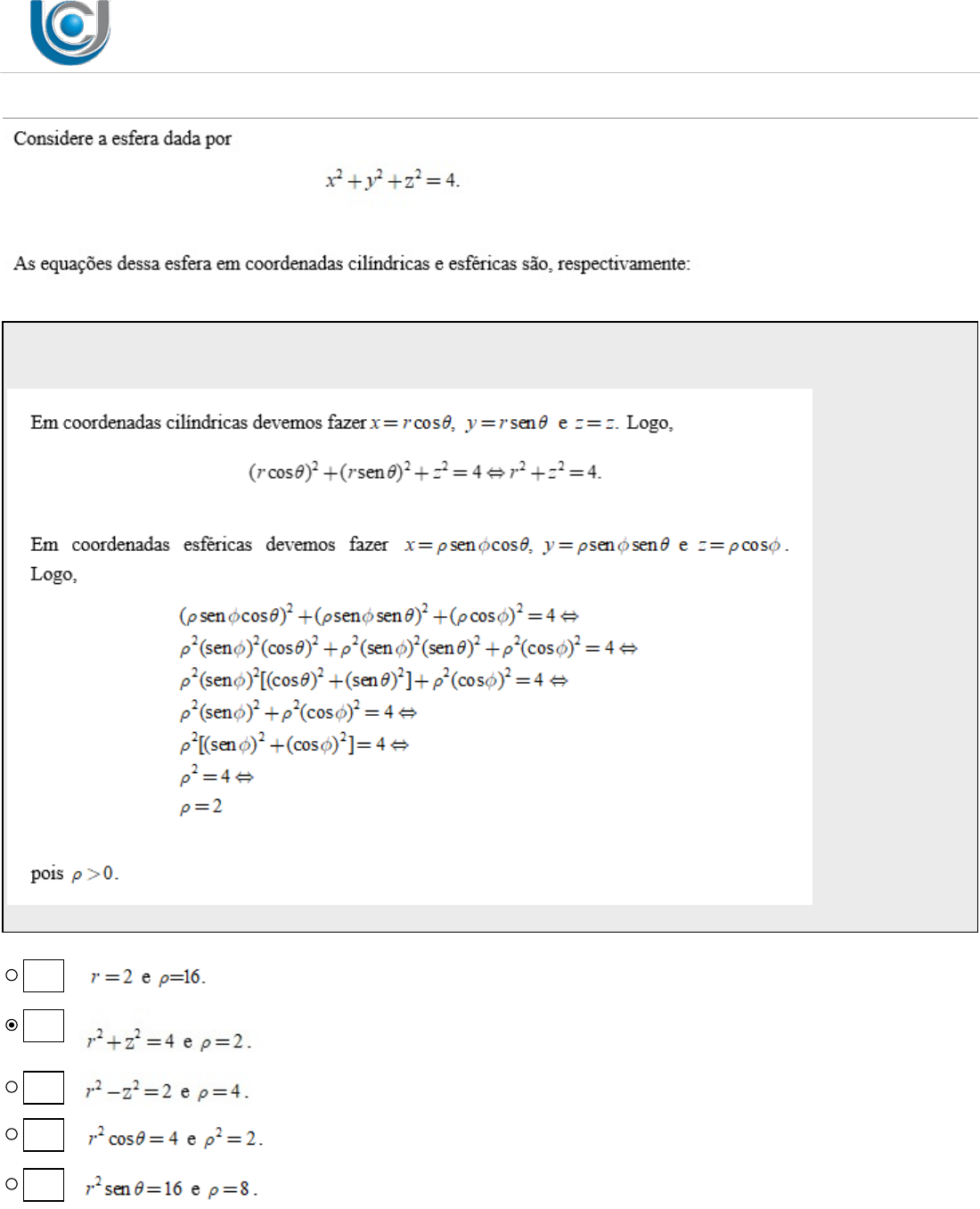 UNICESUMAR - CENTRO UNIVERSITÁRIO CESUMAR PRÉ-VISUALIZAÇÃO DE QUESTÕES QUESTÃO 01 | Objetiva Código: 178301 . Resposta esperada: ANDRADE, Doherty. Cálculo Diferencial e Integral II. Maringá: UniCesumar, 2016. [Unidade I]. A B C D E UNICESUMAR - CENTRO UNIVERSITÁRIO CESUMAR PRÉ-VISUALIZAÇÃO DE QUESTÕES QUESTÃO 02 | Objetiva Código: 178302 . Resposta esperada: ANDRADE, Doherty. Cálculo Diferencial e Integral II. Maringá: UniCesumar, 2016. [Unidade II]. A -2. B -1. C 0. D 1. E 2. UNICESUMAR - CENTRO UNIVERSITÁRIO CESUMAR PRÉ-VISUALIZAÇÃO DE QUESTÕES QUESTÃO 03 | Objetiva Código: 259165 O índice I de temperatura-umidade (ou simplesmente humidex) é a temperatura aparente do ar quando a temperatura real é T e a umidade é h, de modo que podemos escrever I = f (T,h). A tabela seguinte com valores de I foi extraída de uma tabela do Environment Canadá. Neste sentido, analise as afirmativas seguintes. I. f (20,20) = 20 quer dizer que quando a temperatura real T é igual a 20°C e a umidade relativa do ar é de 20%, a temperatura aparente é de 20°. II. Para f (35,h) = 45 temos h = 50%. III. Para f (T,40) = 26 temos T = 25°C. É correto o que se afirma em: Resposta esperada: Resposta presente no tópico "Funções Reais de Variáveis Reais", na página 29, da unidade I do livro Cálculo Diferencial e Integral II. Doherty Andrade. Maringá-Pr.: UniCesumar, 2016. 257 p. Análise da tabela e da relação entre as variáveis independentes e dependentes e de fato temos que f (20,20) = 20 quer dizer que quando a temperatura real T é igual a 20°C e a umidade relativa do ar é de 20%, a temperatura aparente é de 20°, para f (35,h) = 45 temos h = 50% e para f (T,40) = 26 temos T = 25°C. A I apenas. B II apenas. C I e II apenas. D I e III apenas. E I, II e III. UNICESUMAR - CENTRO UNIVERSITÁRIO CESUMAR PRÉ-VISUALIZAÇÃO DE QUESTÕES QUESTÃO 04 | Objetiva Código: 259169 Assinale a alternativa que apresenta a associação correta. Resposta esperada: Resposta presente no tópico "Funções Reais de Variáveis Reais", na página 29, da unidade I do livro Cálculo Diferencial e Integral II. Doherty Andrade. Maringá-Pr.: UniCesumar, 2016. 257 p. - Função I possui domínio y - x2 > 0 e 2x - y > 0. Logo, y > x2 e y < 2x, que é a região delimitada pela parábola de concavidade para cima centrada na origem e pela reta y = 2x. Pontanto, gráfico S. - Função II possui domínio 16 - x2 - y2 > 0. Logo, x2 + y2 < 16, que é a região interna da circunferência de rai 4 centrada na origem. Portanto, gráfico R. - Funçao III possui domínio y - x2 > 0 e 1 - x2 ≠ 0. Logo, y > x2 e x ≠ 1 e x ≠ -1, que é a região delimitada pela parábola de concavidade para cima centrada na origem exceto nos pontos em que x = 1 e x = -1. Pontanto, gráfico Q. A I-Q, II-R, III-P B I-R, II-P, III-S C I-S, II-R, III-Q D I-P, II-S, III-R E I-P, II-Q, III-R UNICESUMAR - CENTRO UNIVERSITÁRIO CESUMAR PRÉ-VISUALIZAÇÃO DE QUESTÕES QUESTÃO 05 | Objetiva Código: 259533 É correto o que se afirma em: Resposta esperada: Resposta presente no tópico "Derivadas Parciais", na página 85, da unidade III do livro Cálculo Diferencial e Integral II. Doherty Andrade. Maringá-Pr.: UniCesumar, 2016. 257 p. A I apenas. B II apenas. C I e II apenas. D II e III apenas. E I, II e III. UNICESUMAR - CENTRO UNIVERSITÁRIO CESUMAR PRÉ-VISUALIZAÇÃO DE QUESTÕES QUESTÃO 06 | Objetiva Código: 259541 É correto o que se afirma em: Resposta esperada: Resposta presente no tópico "Limites e Continuidade", na página 65, da unidade II do livro Cálculo Diferencial e Integral II. Doherty Andrade. Maringá-Pr.: UniCesumar, 2016. 257 p. A I apenas. B III apenas. C I e III apenas. D II e III apenas. E I, II e III. UNICESUMAR - CENTRO UNIVERSITÁRIO CESUMAR PRÉ-VISUALIZAÇÃO DE QUESTÕES QUESTÃO 07 | Objetiva Código: 259584 Uma caixa de papelão sem tampa deve ter um volume de 32000 cm3. Determine as dimensões que minimizem a quantidade de papelão utilizado. Resposta esperada: Resposta presente no tópico "Máximos e Mínimos de Funções Reais de Várias Variáveis Reais", na página 102, da unidade III do livro Cálculo Diferencial e Integral II. Doherty Andrade. Maringá-Pr.: UniCesumar, 2016. 257 p. OBS: Multiplicando a primeira equação por x, a segunda por y e a terceira por z, obtemos (2xz+xy)=k(xyz), (2yz+xy)=k(xyz) e (2xz+2yz)=k(xyz). Note que, se k = 0, então o volume seria nulo e portanto, a área f seria nula, o que não queremos. Logo, k≠0. Do mesmo modo, x≠0, y≠0 e z≠0. Como as três equações acima são iguais, por exemplo, 2xz+xy = 2yz+xy segue que x = y. Do mesmo modo, como 2yz+xy = 2xz+2yz segue que y = 2z. De onde segue x = y = 2z. Como xyz=32000, temos que 2z.2z.z = 32000 => 4z³=3200 => z=20. Portanto, x = y = 40. A 40, 40 e 20 cm B 10, 40 e 80 cm C 20, 20 e 80 cm D 10, 10 e 320 cm E 10, 20 e 160 cm UNICESUMAR - CENTRO UNIVERSITÁRIO CESUMAR PRÉ-VISUALIZAÇÃO DE QUESTÕES QUESTÃO 08 | Objetiva Código: 69237 O conceito de limite está vinculado ao interesse de estudar o comportamento de uma função f(x, y) ao se aproximar de um L quando (x, y) do domínio de f se aproxima de (x0, y0). Neste sentido, determine: Resposta esperada: Resposta presente no tópico "Limites e Continuidade", na página 65, da unidade II do livro Cálculo Diferencial e Integral II. Doherty Andrade. Maringá-Pr.: UniCesumar, 2016. 257 p. A 0. B 5. C 6. D 12. E -12. UNICESUMAR - CENTRO UNIVERSITÁRIO CESUMAR PRÉ-VISUALIZAÇÃO DE QUESTÕES QUESTÃO 09 | Objetiva Código: 118829 Dado o limite de duas variáveis Podemos afirmar que: Resposta esperada: Resposta presente no tópico "Limites e Continuidade", na página 65, da unidade V do livro Cálculo Diferencial e Integral II. Doherty Andrade. Maringá-Pr.: UniCesumar, 2016. 257 p. A O limite é igual a 0. B O limite é igual a 2. C O limite é igual a 8. D O limite é igual a 12. E O limite não existe. UNICESUMAR - CENTRO UNIVERSITÁRIO CESUMAR PRÉ-V