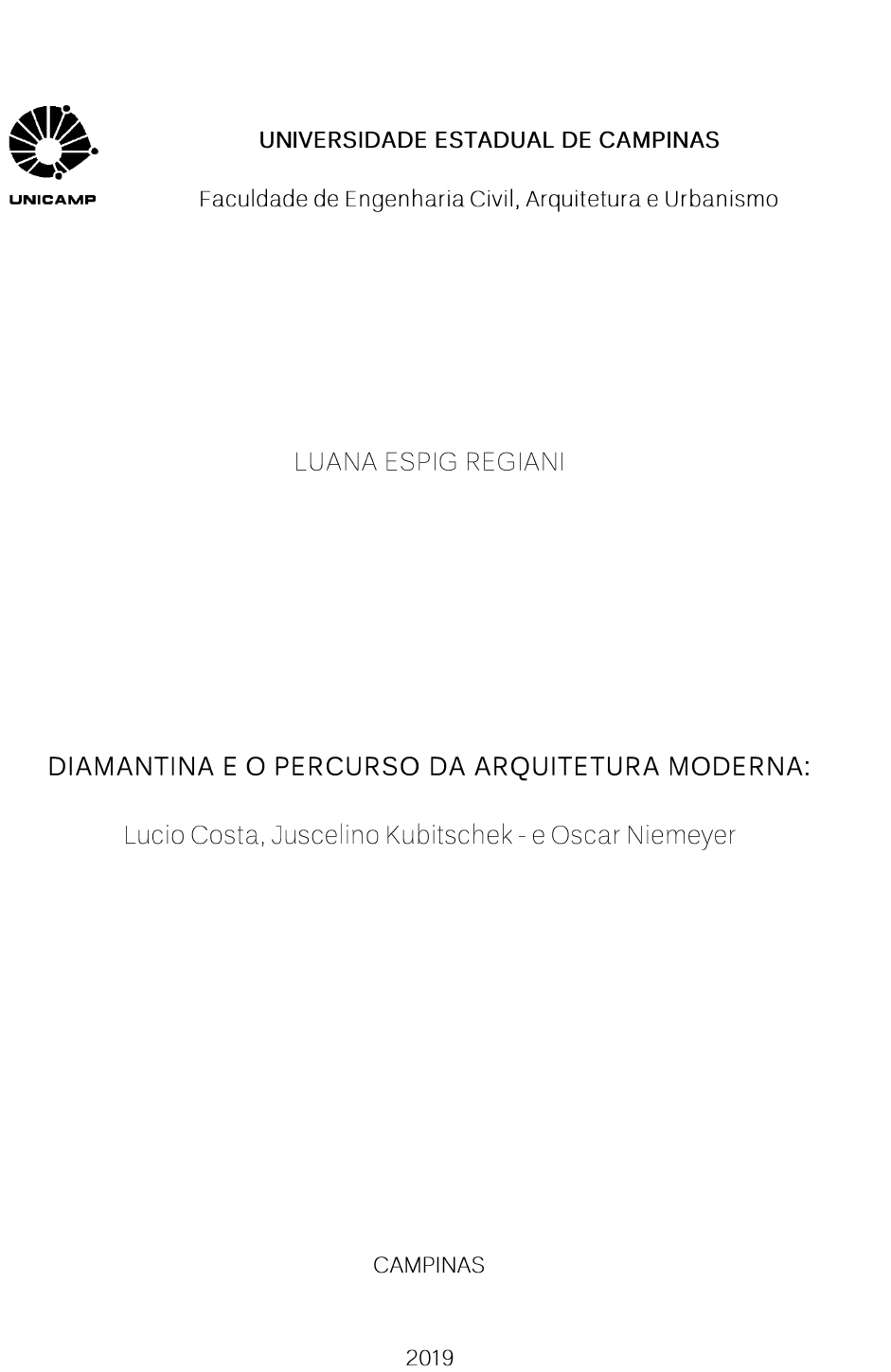 Ficha catalográfica Universidade Estadual de Campinas Biblioteca da Área de Engenharia e Arquitetura Luciana Pietrosanto Milla - CRB 8/8129 Regiani, Luana Espig, 1992- R263d RegDiamantina e o percurso da arquitetura moderna : Lucio Costa, Juscelino Kubitschek - e Oscar Niemeyer / Luana Espig Regiani. – Campinas, SP : [s.n.], 2019. RegOrientador: Rafael Augusto Urano de Carvalho Frajndlich. RegDissertação (mestrado) – Universidade Estadual de Campinas, Faculdade de Engenharia Civil, Arquitetura e Urbanismo. Reg1. Arquitetura moderna - Brasil. 2. Patrimônio histórico - Brasil. 3. Arquitetura colonial - Diamantina (MG) - Obras ilustradas. 4. Oscar Niemeyer. 5. Movimento moderno (Arquitetura) - Brasil. I. Frajndlich, Rafael Augusto Urano de Carvalho, 1982-. II. Universidade Estadual de Campinas. Faculdade de Engenharia Civil, Arquitetura e Urbanismo. III. Título. Informações para Biblioteca Digital Título em outro idioma: Diamantina and the Brazilian modern architecture route: Lucio Costa, Juscelino Kubitschek - and Oscar Niemeyer Palavras-chave em inglês: Architecture, Modern - 20th century - Brazil Architecture, Colonial - Brazil Architects - Brazil World Heritage areas - Conservation and restoration Modern movement (Architecture) - Brazil Área de concentração: Arquitetura, Tecnologia e Cidade Titulação: Mestra em Arquitetura, Tecnologia e Cidade Banca examinadora: Rafael Augusto Urano de Carvalho Frajndlich [Orientador] Guilherme Teixeira Wisnik Silvana Barbosa Rubino Data de defesa: 15-07-2019 Programa de Pós-Graduação: Arquitetura, Tecnologia e Cidade Identificação e informações acadêmicas do(a) aluno(a) - ORCID do autor: https://orcid.og/0000-0002-3950-0454 - Currículo Lattes do autor: http://lattes.cnpq.br/3110818847848603 Powered by TCPDF (www.tcpdf.org) Agradeço ao professor Dr. Rafael Urano Frajndlich pelos horizontes de pesquisa que foram abertos com sua chegada na pós-graduação. Obrigada pelas orientações instigantes e revisões atentas. Agradeço à professora Dra. Regina Tirello pelo importante papel para o ingresso no mestrado. Meus agradecimentos aos professores da banca de qualificação: Dr. Eduardo Rossetti e Dra. Silvana Rubino. À professora Silvana, agradeço especialmente pelas preciosas observações desde a Iniciação Científica, essenciais para todas as viagens que se seguiram. Agradeço também ao professor Dr. Guilherme Wisnik pelos pertinentes e atenciosos comentários na banca de defesa. Obrigada, in memoriam, aos Professores Alexandre Eulálio e José Cláudio Gomes, cujas coleções doadas, respectivamente, às bibliotecas da Unicamp e da USP, possibilitaram o início deste trabalho. Agradeço às instituições que disponibilizaram seus arquivos. No Rio de Janeiro, ao Arquivo Central do IPHAN, fundamental para a pesquisa, e agradeço, em particular, à Tatiana Lopes Salciotto e sua atenção em cada pedido. Na mesma cidade, à Fundação Oscar Niemeyer. Em Brasília, ao Memorial JK. Em Belo Horizonte, ao IEPHA e ao fortuito encontro com Bruno Fioravante e André Miranda. Em Diamantina, muitos foram os lugares que, ao preservarem a memória da cidade, colaboraram profundamente com este trabalho. Devo agradecimentos ao Arquivo Público Municipal pela disponibilidade ao abrir o acervo de projetos. Ao Arquivo Eclesiástico da Arquidiocese, à Verônica de Mendonça Motta, pelo auxílio com os jornais “A Estrela Polar”. À Biblioteca Antônio Torres. Ao Escritório Técnico do IPHAN e à Vanessa de Pádua Mello por compartilharem as bases que possibilitaram a confecção dos mapas. Também ao Instituto Casa da Gloria, que permitiu que utilizasse sua biblioteca para escrever parte da dissertação. Especialmente, agradeço ao Museu Tipografia Pão de Santo Antônio e ao seu secretário, Emanoel Ricardo Maria, pela generosidade ao compartilharem o rico acervo da instituição com os exemplares da Voz de Diamantina, essenciais para recuperar fatos e datas dos eventos narrados. Agradeço também, imensamente, à Casa de Juscelino. Ao Serafim Jardim, pela incansável disponibilidade para contar e manter a história do ex-presidente em sua cidade natal. Ao Rômulo Barbosa, que também abraçou essa missão. Obrigada por abrirem, sem restrições, a biblioteca e os arquivos. Ainda no antigo Arraial, agradeço ao Hotel Tijuco e toda a sua equipe pela recepção nas duas estadias. Em momentos cruciais para a pesquisa, foi um privilégio estar ali e ser tão bem recebida. Especialmente, agradeço ao Rony Odlanier Silva, gerente do hotel, um dos grandes responsáveis por preservar o edifício e sua história e que com muita dedicação atende aos pesquisadores e turistas que se interessam pelo Tijuco. Agradeço ao Professor Dr. Marcos Lobato Martins pela disponibilidade em conversar e compartilhar seus textos. Sua vasta produção sobre a região foi primordial para o trabalho. Muito obrigada ao Professor Erildo Nascimento de Jesus que prontamente, seja numa conversa no Beco do Mota ou por e-mail, esclarecia qualquer dúvida sobre a cidade. Além de emprestar o livro com os desenhos do Lucio Costa. Agradeço excepcionalmente ao Michel Becheleni pela disponibilidade, generosidade e atenção ao realizar as fotos aéreas, fazendo registros atuais expressivos que ajudarão a documentar a cidade pela história. Obrigada também à Telma Pio, pelos materiais compartilhados. À Fernanda Valim, pela gentileza e pelos encontros proporcionados, incluindo a tarde de aquarela. À Dalva, Maria Dalva Aquino, e o seu Cantinho na Rua do Amparo onde encontrava não só a comida mais gostosa, mas também muito carinho. Agradeço ao diamantinense Manuel Dimitri de Almeida Gomes pelas caminhadas e conversas que tanto colaboraram com o mestrado. Obrigada pelo amparo incondicional, sem o qual este trabalho não teria sido feito da mesma forma. Também à Larissa Doalla, pela importante ajuda com o livro esquecido. Em Minas, agradeço ainda ao Paulo T. G. 