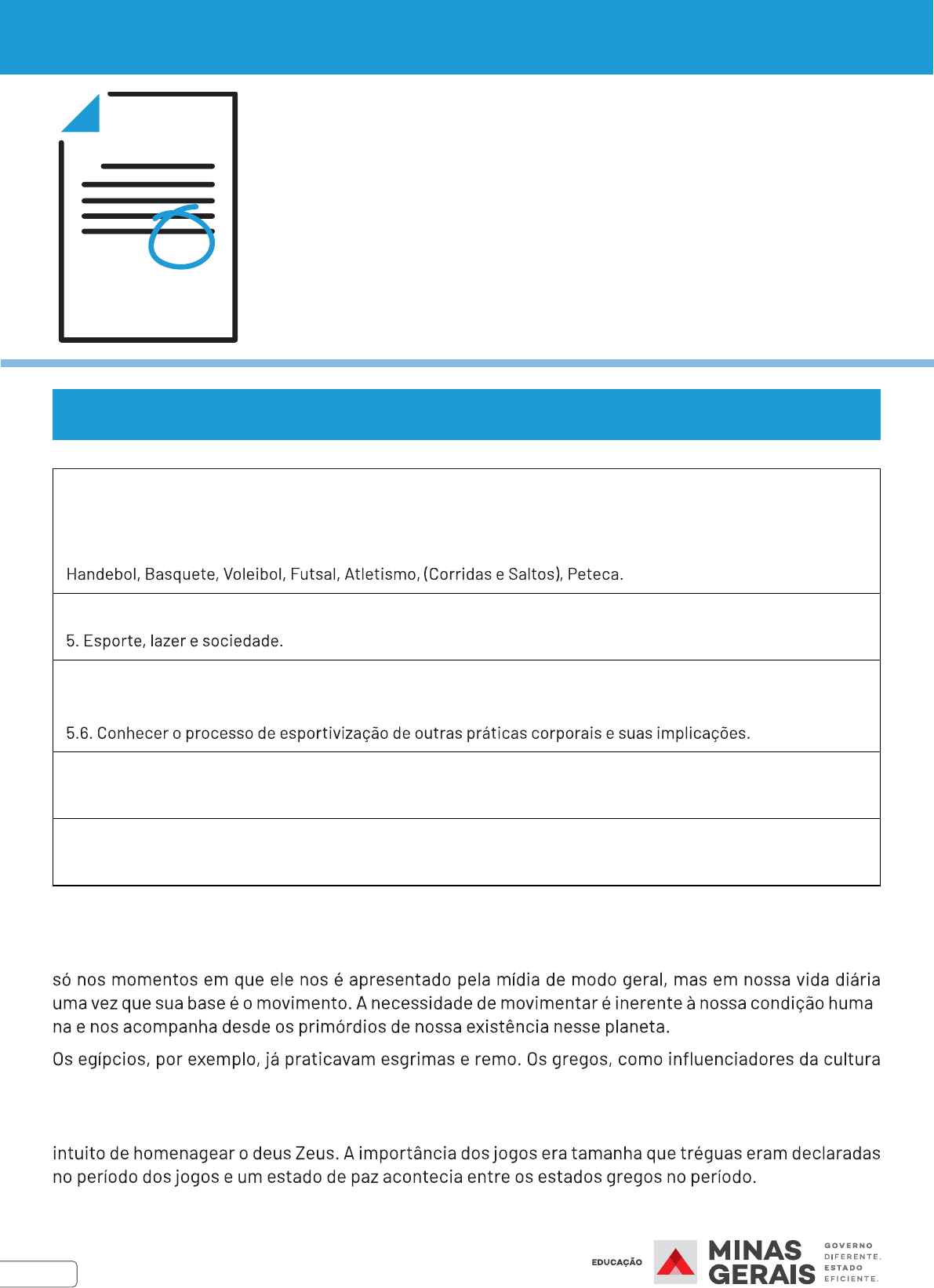 155 PLANO DE ESTUDO TUTORADO SECRETARIA DE ESTADO DE EDUCAÇÃO DE MINAS GERAIS TURNO: TOTAL DE SEMANAS: 04 NÚMERO DE AULAS POR MÊS: 08 COMPONENTE CURRICULAR: EDUCAÇÃO FÍSICA ANO DE ESCOLARIDADE: 3º ANO – EM NOME DA ESCOLA: ESTUDANTE: TURMA: MÊS: NÚMERO DE AULAS POR SEMANA: 02 SEMANA 1 EIXO TEMÁTICO: Esporte. TEMAS: TÓPICO: HABILIDADE(S): 5.5. Relacionar os princípios da competição esportiva com a competição na sociedade capitalista. CONTEÚDOS RELACIONADOS: História das olimpíadas. INTERDISCIPLINARIDADE: Todas as disciplinas. O ESPORTE COMO FENÔMENO SOCIAL, CULTURAL E POLÍTICO Em todo momento de nossa vida, mesmo que involuntariamente, nos defrontamos com o esporte. Não - e do corpo, tinha o esporte como uma forma de educar suas crianças iniciando a prática do mesmo aos 6 anos de idade. Dada a importância que as atividades corporais tinham, os gregos criaram os jogos olímpicos, que recebiam esse nome por acontecer em olímpia, aconteciam a cada 4 anos e tinham o 156 Com a dominação grega pelos romanos os jogos foram proibidos e o esporte era usado pelos romanos começam a ganhar regras específicas e universais, buscam igualdades entre os praticantes, campos específicos de prática. Berço da revolução industrial a Inglaterra desenvolve seu esporte nas escolas - vinda do orgulho dos atletas em empunhar a bandeira de seus países nas vitórias conquistadas foram atraindo a atenção dos governos e assim os mesmos começaram a ganhar os contornos políticos. O primeiro país a tentar tirar proveito disso foi a Alemanha com os jogos de 36, onde a ideia de Hitler era mostrar a superioridade da raça ariana, o que ele não contava era que um atleta negro, Jesse Owens, fosse o grande nome daqueles jogos, vencedor de 4 medalhas e ofuscando os atletas alemães. Uma - esporte onde nas olimpíadas de moscou 80 os EUA lideram um boicote do bloco capitalista, ocorrendo uma retaliação do bloco comunista em Los Angeles 84. Assim a performance começa a ser a tônica da - países sempre há o temor e uma preocupação maior com a segurança, visto que os mesmos são inimi- gos históricos. influenciando diretamente na seleção brasileira e usando a mesma como veículo de propaganda para Percebe-se que desde os primórdios da humanidade o esporte esteve inerente ao nosso desenvolvi- torna um praticante. 157 ATIVIDADES Vamos refletir... 01 – cidade se preparou, mudando radicalmente toda as suas estruturas, após os jogos a cidade se tornou moderna e um importante polo turístico da Espanha. No período de 2 anos tivemos em nosso país os dois maiores eventos esportivos do mundo, a copa do mundo e os jogos olímpicos em 2014 e 2016 respectivamente. Na sua opinião assim como Barcelona o Brasil soube aproveitar esse 02 – 03 – do mundo. Sendo o futebol como uma chance importante de ascensão social, muitos depositam toda sua energia no intuito de se tornar jogador profissional. Alguns especialistas consideram que vem daí a força do futebol nacional. Apresente uma justificativa para que tantas crianças e jovens sonham em ser jogadores de futebol. 158 ATIVIDADE 2: Responda as questões. 01 – o sentido trágico das arenas que sacrificavam pessoas, como a noção da integração dos povos a partir das competições esportivas. A cada quatro anos, os gregos das mais diversas cidades Estado por isso chamado de Jogos Olímpicos ou Olimpíadas. Os jogos funcionavam como uma celebração em honra a Zeus, o mais importante deus grego. O evento incluía provas de diversas modalidades esportivas, muitas delas ainda hoje praticadas em todo o mundo, como corridas, saltos, arremessos Numa comparação entre as competições atuais e as antigas Olimpíadas, assinale a alternativa que apresenta uma informação INCORRETA. a. b. Quase sempre, os campeões das cidades-Estado tinham regalias para o resto de suas vidas, já que ira dos deuses do Olimpo. c. Atualmente, os Jogos Olímpicos se dividem em Olimpíadas de Verão e Olimpíadas de Inverno. As de Verão ocorrem em uma grande cidade e as de Inverno em uma área montanhosa coberta de neve. d. Quando os romanos incorporaram à sua cultura as tradições gregas, os jogos mudaram de cenário. - sição para correr e arremessar discos, mesmo que não fosse uma campeã. e. empurrão daqueles que os cercavam. Acesso em 11 de agosto de 2020. 02 – velocista jamaicano Usain Bolt. 159 Considerando os dados apresentados na tabela, avalie as afirmações a seguir. I. II. A velocidade de reação foi o fator determinante para que Usain Bolt alcançasse sua melhor marca. III. IV. entre 20 e 40 metros. É correto apenas o que se afirma em (C) II e III. (E) II, III e IV. https://www.aprovaconcursos.com.br/questoes-de-concurso/questao/637021 acesso em 15/08/2020 ATIVIDADE 3: A partir da análise dos gráficos responda: acesso em 11/08/2020 - - justificativa para essa diminuição. podem ser definidos para o sucesso dos atletas nesta prova. 160 ATIVIDADE 4: e 37 no levantamento de peso. Apresente argumentos que na sua opinião houve mais casos nestas duas modalidades. (B) Argumente a favor ou contra o uso de substâncias proibidas por atletas. Justifique sua resposta. (C) A partir de seus conhecimentos escreva os problemas de saúde que podem acontecer por pessoas que abusam de substância proibidas. acesso em 11/08/2020 161 SEMANA 2 EIXO TEMÁTICO: Esporte. TEMAS: TÓPICO : 6. Esporte, consumo e mídia. HABILIDADE(S): 6.1. Compreender a relação entre mídia, indústria esportiva e consumo. CONTEÚDOS RELACIONADOS: Esporte e mídia. INTERDISCIPLINARIDADE: Todas as disciplinas. A mídia tornou-se um veículo de comunicação que tem como objetivo divulgar de forma massificada inúmeros produtos em larga escala, de forma a atingir um público numeroso e indistinto sem levar em consideração sua individualidade. Podemos citar como mídia a televisão, rádio, jornal, outdoors e etc. - los de comunicação, mas não abrange a totalidade que el