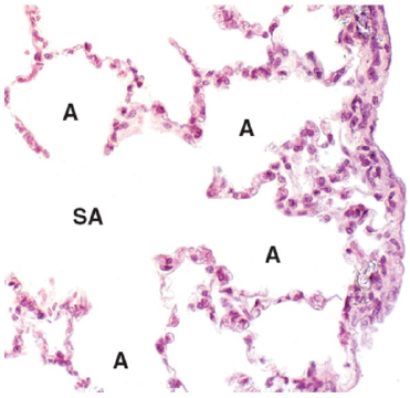 Alvéolos Os alvéolos são os espaços aéreos terminais do sistema respiratório e constituem os verdadeiros locais de troca gasosa entre o ar e o sangue. Cada alvéolo é circundado por uma rede de capilares que coloca o sangue em grande proximidade com o ar inalado dentro do alvéolo. Os ductos alveolares são vias respiratórias alongadas, cujas paredes são formadas quase exclusivamente por alvéolos. Observa-se a existências de anéis de m. liso nos septos interalveolares semelhantes a maçanetas. Os sacos alveolares são espaços circundados por grupos de alvéolos. Os alvéolos circundantes abrem-se nesses espaços. Os alvéolos são circundados e separados uns dos outros por uma camada de tecido conjuntivo extremamente fina, contendo capilares sanguíneos. O tecido entre os espaços aéreos alveolares adjacentes é denominado septo alveolar ou parede septal. O epitélio alveolar é composto de várias células especializadas e seus produtos: · As células alveolares tipo I (pneumócitos do tipo I) – células pavimentosas extremamente finas, que revestem a maior parte da superfície dos alvéolos. Essas células são unidas entre si e com outras células do epitélio alveolar por zônulas de oclusão. As junções formam uma barreira efetiva entre os espaços aéreo e os componentes da parede septal. · As células alveolares do tipo II (pneumócitos tipo II ou células septais) – células secretoras que tem formato cuboide e estão intercaladas com as células do tipo I, mas tende a se concentrar nas junções septais. São ricas em uma mistura de fosfolipídios, lipídios neutros e proteínas, que é secretada por exocitose, formando um agente tensoativo de revestimento alveolar, denominado surfactante. São progenitoras das células alveolares do tipo I. Após lesão pulmonar, elas proliferam e restauram ambos tipos de células alveolares. · As células em escova – presentes em pequeno número. Podem atuar como receptores que monitoram a qualidade do ar no pulmão. A barreira hematoaérea refere-se as células e a produtos celulares através dos quais os gases devem se difundir entre os compartimentos alveolares e capilares. A barreira hematoaérea mais delgada consiste em uma fina camada de surfactante, uma célula epitelial do tipo I e sua lâmina basal e uma célula endotelial capilar e sua lâmina basal. As células e fibras do tecido conjuntivo que podem estar presentes entre as duas lâminas basais ampliam a barreira hematoaérea. Acredita-se que a maior parte da troca gasosa ocorra através da porção delgada da barreira e que a porção espessa constitua um local em que o líquido tecidual pode acumular-se e até mesmo atravessar o alvéolo. Os vasos linfáticos no tecido conjuntivo dos bronquíolos terminais drenam o líquido que se acumula na porção espessa do septo. Os macrófagos alveolares são especiais, pois atuam tanto no tecido conjuntivo do septo quanto no espaço aéreo do alvéolo. Macrófagos denominados células de poeira, nos espaços aéreos, varrem a superfície e removem o material particulado inalado. Os macrófagos alveolares fagocitam os eritrócitos que podem entrar nos alvéolos em situação de insuficiência cardíaca. Aberturas nos septos interalveolares possibilitam a circulação de um alvéolo para outro. Esses poros alveolares (de Kohn) podem ser de grande importância em algumas condições patológicas, nas quais a doença pulmonar obstrutiva bloqueia a via normal do ar para os alvéolos. Os alvéolos localizados distalmente ao bloqueio podem continuar a ser arejados através dos poros de um lóbulo ou acino adjacente. Histologia – Paula Toneli lâmina r-3: Pulmão Roxo – saco alveolar Azul – septo interalveolar lâmina r-3: Pulmão Vermelho – pneumócito I Azul – pneumócito II Roxo – septo alveolar lâmina r-3: Pulmão Vermelho – bronquíolo terminal Azul – ducto alveolar