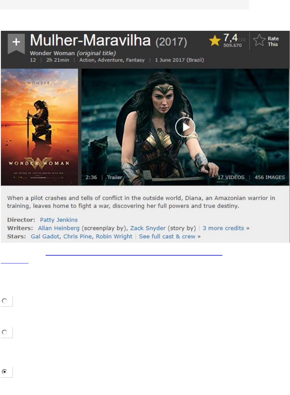 Pergunta 1 Nas fichas técnicas e nas sinopses é possível perceber o gênero/estilo que faz parte a obra. Veja o texto a seguir: Diponível em: https://www.imdb.com/title/tt0451279/ (Links para um site externo.) O filme é considerado como: suspense, terror, drama comédia, ação, aventura Você respondeu ação, aventura, fantasia https://www.imdb.com/title/tt0451279/ https://www.imdb.com/title/tt0451279/ suspense, terror, aventura policial, ação, fantasia Correta. No inicio do texto é apresentado as seguintes informações: action, adventure, fantasy. Assim, a alternativa correta é: ação, aventura, fantasia. Pergunta 2 Nas fichas técnicas é possível perceber uma marca atemporal do texto. Mas o que isto quer dizer? Quer dizer que a escrita não possui uma marca do tempo, sendo sempre o presente/neste momento. Veja o texto abaixo: When a pilot crashes and tells of conflict in the outside world, Diana, an Amazonian warrior in training, leaves home to fight a war, discovering her full powers and true destiny. Os verbos crashes/tells/leaves estão no simple present. Os verbos quando estão no simple present, para as formas interrogativas e negativas, necessitam de auxiliar. O auxiliar no simple present é: will to did Você respondeu do/does Correto. A alternativa correta é: do/does Did - é auxliar para verbos no passado Will - é auxiliar para verbos no futuro to - é auxiliar para verbos no infinitivo going to - verbo modal going to Pergunta 3 Leia o trecho a seguir: The film received largely positive reviews, with praise for its direction, acting, visuals, action sequences, and musical score. The film set several box office records, and became the fifth highest-grossing superhero film domestically and 20th highest-grossing film in the United States overall. It grossed over $821 million worldwide, making it the tenth highest-grossing film of 2017. Adjectives - Diferentemente do que acontece no português, na língua inglesa os adjetivos geralmente aparecem antes do substantivo. Considerando as informações disponibilizadas sobre adjectives, qual das alternativas corresponde a formação mencionada. Você respondeu positive reviews Correto. A alternativa correta é positive reviews. film received film in the United States the film It grossed Pergunta 4 Leia o trecho a seguir: Wonder Woman is a 2017 American superhero film based on the DC Comics character of the same name, produced by DC Entertainment in association with RatPac Entertainment and Chinese company Tencent Pictures, and distributed by Warner Bros. A partir do excerto disponibilizado, qual das afirmações a seguir faz parte do trecho: Mulher Maravilha é um filme americano produzido pelo Warner Bros. Mulher Maravilha é um filme de entretenimento produzido pela DC Entertainment. Mulher Maravilha é um filme americano baseado na personagem de mesmo nome da DC Comics, distribuído pela DC Entertainment. Mulher Maravilha é um filme criado peça Warner Bros, e distribuído pela DC Entertainment. Você respondeu Mulher Maravilha é um filme de super-herói americano de 2017 baseado no personagem de mesmo nome da DC Comics. Correto. A tradução do trecho ficaria desta forma: Wonder Woman é um filme de super-herói americano de 2017 baseado no personagem de mesmo nome da DC Comics, produzido pela DC Entertainment em associação com a RatPac Entertainment e a empresa chinesa Tencent Pictures, e distribuído pela Warner Bros.