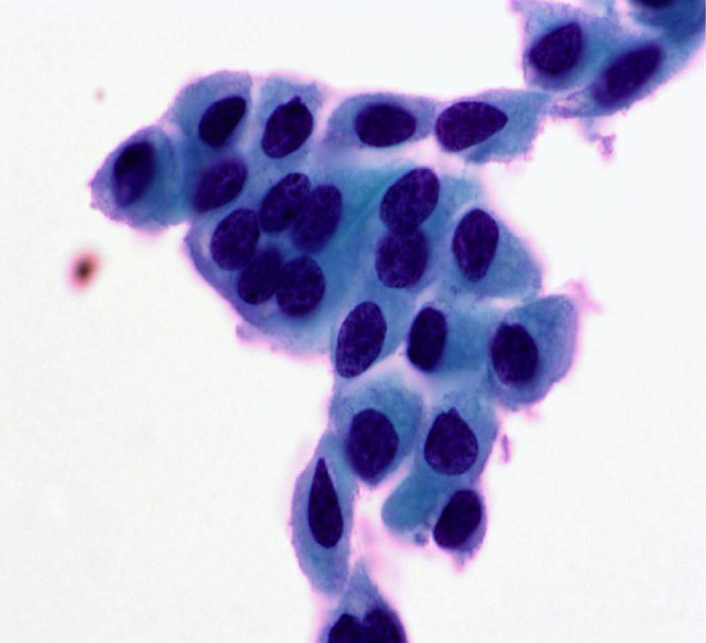 3) Esfregaço cérvico-vaginal mostra grupamentos de células grandes, com citoplasma