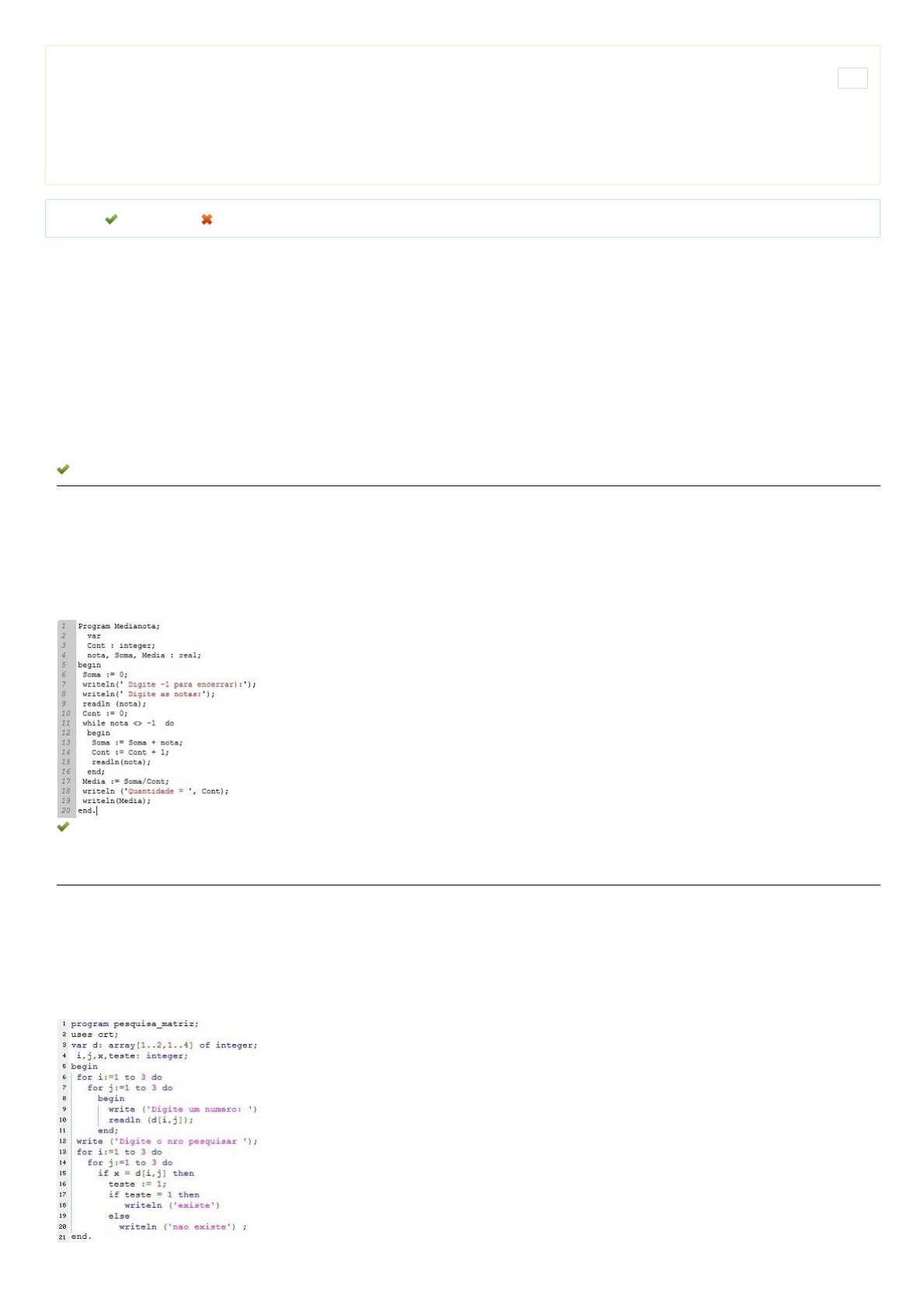 01/11/2020 UNIASSELVI - Centro Universitário Leonardo Da Vinci - Portal do Aluno - Portal do Aluno - Grupo UNIASSELVI https://portaldoalunoead.uniasselvi.com.br/ava/avaliacao/avaliacao_lista.php 1/4 Acadêmico: Valter de Jesus Mendes Serra (1656273) Disciplina: Algoritmo e Lógica de Programação (EEA02) Avaliação: Avaliação Final (Objetiva) - Individual Semipresencial ( Cod.:656379) ( peso.:3,00) Prova: 25117505 Nota da Prova: 10,00 Legenda: Resposta Certa Sua Resposta Errada 1. Os operadores são aplicados dentro dos algoritmos sempre que se quer fazer uma operação matemática, relacional ou lógica entre duas ou mais informações. Apesar de cada linguagem de programação empregar sua própria sintaxe para representar os operadores, a operação que eles repre o resultado obtido não muda, o que facilita sua representação através dos algoritmos. Com relação aos operadores matemáticos, relacionais e lógi classifique V para as sentenças verdadeiras e F para as falsas: ( ) O operador DIV nos traz a parte inteira do resultado de uma divisão. ( ) Para x=5 e y=10, x MOD y retorna o valor 0. ( ) Em uma operação do tipo E, todos os operandos devem ser verdadeiros para que o resultado seja verdadeiro. ( ) A expressão "(4<=10) ou (5>8)" tem como resultado o valor FALSO. ( ) O operador <> serve para verificar se dois valores são diferentes. Assinale a alternativa que apresenta a sequência CORRETA: a) V - V - F - V - V. b) V - F - V - F - F. c) F - V - F - V - F. d) V - F - V - F - V. 2. Foi solicitado um algoritmo em Pascal, para calcular a média e apresentar a quantidade de registros digitados. Analise o código apresentado e clas para as sentenças verdadeiras e F para as falsas: ( ) As variáveis são inicializadas nas linhas 6 e 10. ( ) O programa vai encerrar a execução quando a nota digitada for zero. ( ) O comando While executa o teste somente no final da execução. ( ) A média calculada na linha 17 deveria ser calculada dentro do laço de repetição (Loop), antes da linha 16. Assinale a alternativa que apresenta a sequência CORRETA: a) V - F - F - F. b) V - F - F - V. c) F - V - V - F. d) V - F - V - V. 3. Para a avaliação final, o professor da disciplina de programação solicitou que os alunos desenvolvessem um programa com os seguinte itens: pesq valor armazenado em uma matriz de 3 X 3. Baseado na solicitação e no algoritmo anexo, analise as sentenças a seguir: I- A definição da matriz está com divergência. II- O comando de execução de pesquisa está incompleto (linha 12). III- O preenchimento do vetor (linha 6 até 11) está incorreto. IV- O programa foi desenvolvido conforme a solicitação. Assinale a alternativa CORRETA: a) As sentenças III e IV estão corretas. 01/11/2020 UNIASSELVI - Centro Universitário Leonardo Da Vinci - Portal do Aluno - Portal do Aluno - Grupo UNIASSELVI https://portaldoalunoead.uniasselvi.com.br/ava/avaliacao/avaliacao_lista.php 2/4 b) Somente a sentença III está correta. c) As sentenças I e II estão corretas. d) As sentenças I, II e IV estão corretas. 4. Diante da crescente necessidade de armazenar a informação, é importante que esta seja armazenada de forma ordenada, seja por ordem alfabétic idade, localidade ou outro item sobre o qual é necessário trabalhar. No que tange aos modelos de ordenação, analise as sentenças a seguir: I- No método de ordenação Bubble Sort, a ideia é percorrer um vetor diversas vezes, realizando a comparação entre dois elementos, até que os el de maior valor fiquem alocados no final do vetor. II- O método Quicksort vasculha repetidamente o vetor, selecionando um elemento de cada vez e colocando-o na posição correta da sequência. III- O método Quicksort utiliza um elemento chamando pivô. IV- O método Selection Sort utiliza o conceito de selecionar o elemento mais apto para cada posição. V- O método Bubble Sort é adequado para aplicações comerciais em que há uma grande quantidade de dados. Assinale a alternativa CORRETA: a) As sentenças I, II e V estão corretas. b) As sentenças I, II e IV estão corretas. c) As sentenças III e V estão corretas. d) As sentenças I, III e IV estão corretas. 5. Poderão existir situações em que será necessário o agrupamento de várias estruturas de seleções, formando, assim, uma seleção encadeada. Tal ocorre quando há a necessidade de se verificar mais de duas condições. Com base nessa informação, analise o algoritmo a seguir e assinale a alt CORRETA: a) O Comando4 sempre será executado, uma vez que a condição na linha 14 é sempre falsa. b) Se a condição da linha 14 for verdadeira, somente o Comando3 será executado. c) Se a condição da linha 9 for falsa, o Comando3 e o Comando4 serão executados. d) O Comando5 sempre será executado. 6. Na construção de um algoritmo, uma das suas principais fases é o processamento dos dados informados pelo usuário, em que poderão ser realiza diversas operações aritméticas sobre as variáveis declaradas ou valores previamente especificados, a fim de obter o resultado final desejado. Nest analise o código apresentado e assinale a alternativa CORRETA que apresenta o conteúdo para as variáveis VA, VB, VC, VD, VE: a) VA=2, VB=72, VC=10, VD=2, VE=178. b) VA=12, VB=4, VC=0, VD=1, VE=16. c) VA=72, VB=7, VC=0, VD=2, VE=79. d) VA=72, VB=7, VC=10, VD=2, VE=178. 7. A sequência de Fibonacci foi descrita no final do século XII pelo italiano Leonardo Fibonacci. Essa sequência é infinita e começa com 0 e 1. Os núm seguintes são sempre a soma dos dois números anteriores. Portanto, depois de 0 e 1 vem 1, 2, 3, 5, 8, 13, 21, 34... O algoritmo a seguir apresenta uma solução desse algoritmo desenvolvido em Pascal, em que é solicitada a quantidade de elementos, e o program apresenta o resultado. Assinale a alternativa CORRETA: FONTE: Disponível em: <http://mundoestranho.abril.com.br/ciencia/o-que-e-a-sequencia-de-fibonacci/>. Acesso em: 21 jul. 2017. 01/11/2020