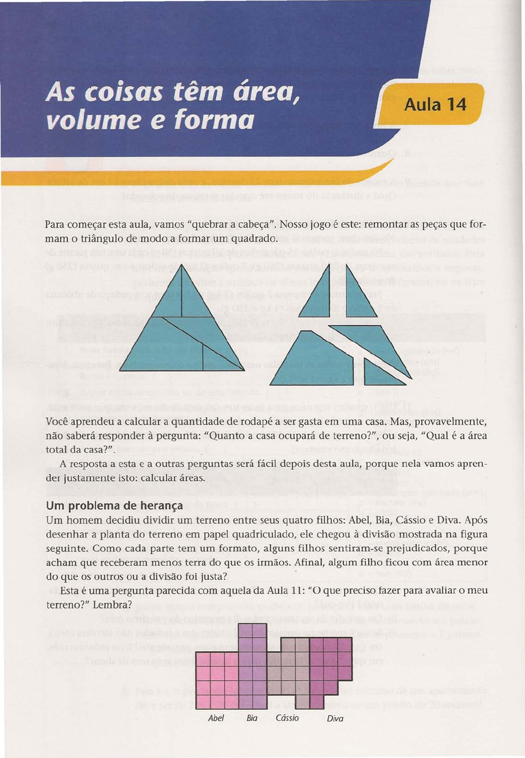 Para começar esta aula, vamos "quebrar a cabeça". Nosso jogo é este: remontar as peças que for- mam o triângulo de modo a formar um quadrado. Você aprendeu a calcular a quantidade de rodapé a ser gasta em uma casa. Mas, provavelmente, não saberá responder à pergunta: "Quanto a casa ocupará de terreno?", ou seja, "Qual é a área total da casa?". A resposta a esta e a outras perguntas será fácil depois desta aula, porque nela vamos apren- der justamente isto: calcular áreas. Um problema de herança Um homem decidiu dividir um terreno entre seus quatro filhos: Abel, Bia, Cássio e Diva. Após desenhar a planta do terreno em papel quadriculado, ele chegou à divisão mostrada na figura seguinte. Como cada parte tem um formato, alguns filhos sentiram-se prejudicados, porque acham que receberam menos terra do que os irmãos. Afinal, algum filho ficou com área menor do que os outros ou a divisão foi justa? . Esta é uma pergunta parecida com aquela da Aula 11: "O que preciso fazer para avaliar o meu terreno?" Lembra? Abel DivaBia Cássio MATEMÁTICA 101 o que esse pai precisa fazer para provar a seus filhos que a todos coube o mesmo tanto de terra? Medir a área de cada parte. E como se mede a área de um terreno? Como em qualquer medida, contando quantas unidades de área cabem dentro do terreno. Nessa planta feita em papel quadriculado, podemos considerar cada quadradinho como uma uni- dade de área. Contando os quadradinhos da parte que coube, por exemplo, a Abel, temos 12 uni- dades de área. Fazendo o mesmo com cada uma das outras partes, também temos 12 unidades. Sendo assim, houve justiça na divisão do terreno, pois todos receberam a mesma área. Como medir áreas Na Aula 12, vimos alguns dos instrumentos usados para medir comprimentos: a régua, a fita métrica, a trena. E para medir áreas, existe algum instrumento? Não. Costumamos medir a área de uma figura comparando-a com a de uma figura mais sim- ples, como o quadrado ou o retângulo. Sabemos que um quadrado cujo lado mede 1 metro (1 m) tem área de 1 metro quadrado (1 m-). 7 m Se o lado do quadrado tiver 1 quilômetro (1 krn), a sua área será de 1 quilômetro quadrado (1 km-). Se tiver 1 centímetro (1 em), a área será de 1 centímetro quadrado (1 cm-), e assim por diante. Sabemos também que em 1 centímetro cabem 10 milímetros. Quantos milímetros quadrados cabem em 1 centímetro quadrado? Vamos descobrir isso observando a figura: o quadrado todo vale 1 centímetro quadrado. Cada quadradinho vale 1 milímetro quadrado. 7 em 7 mmI ~I ~~~~~~~~~~~ 7 em 102 AULA 14 Fica claro q).le cabem 100 milímetros quadrados dentro de 1 centímetro quadrado, ou seja: 1 em- = 10 mm x 10 mm = 100 mm- Temos ainda: 1 m- = 100 cm x 100 cm = 10000 em- 1 km2 = 1 000 m x 1000 m = 1 000000 m- (1 milhão de metros quadrados) Área de retângulos No problema da herança, para calcular a área de terreno que coube a cada filho, contamos quan- tos quadradinhos (unidades de área) cabem em cada terreno. Chegamos a 12 unidades, em todos os casos. I....- Abel Bia Cássio Diva Nos casos de Abel e Bia, não era necessário contar os quadradinhos um por um. É fácil obser- var que: o terreno de Abel tem: O terreno de Bia tem: 3 x 4 = 12 unidades de área. 2 x 6 = 12 unidades de área. Se imaginarmos que os quadradinhos podem mudar de lugar, não será difícil transformar os outros dois terrenos em retângulos e, depois, calcular a área. Portanto: a área de um retângulo é igual ao produto dos seus lados. Área do retângulo = comprimento x largura Agora você pode voltar à Aula 13 e calcular a área da casa ou de qualquer um dos cômodos que ela possui. Como as áreas se somam Existe uma regra muito simples para somar duas áreas: MATEMÁTICA 103 Quando juntamos duas figuras (sem que um pedaço de uma figura fique por cima da outra), a área da figura total é a soma das áreas das duas partes. Observe com atenção esta figura: 6 4 3 2 A área do retângulo maior é: A área do retângulo menor é: Então, a área total é: 6 x 3 = 18 unidades de área. 4 x 2 = 8 unidades de área. 18 + 8 = 26 unidades de área. Mudando a forma de uma figura Vimos que a área de um terreno é a superfície que ele ocupa. No exemplo da herança, Abel inicialmente protestou que a sua parte de terreno era menor do que a de Bia, porque o terreno dela era mais comprido. Mas, como já vimos na aula passada, dois terrenos de formatos diferentes podem ter a mesma área. Aconteceu que Abel não sabia disso. É por isso que dizemos que a área de um terreno é a superfície que ele ocupa, sem falar nada da forma do terreno. A forma não é importante para determinar a área. Nem sempre um terreno tem a forma de um retângulo. Vamos mostrar agora um exemplo em que duas pessoas, que chamaremos de senhor Y e senhor Z, possuem terrenos com formas dife- rentes. Eles querem saber quem tem o maior terreno. 20m E O() Terreno do senhor Z Terreno do senhor Y 22 m Já que o terreno do senhor Y é retangular, o cálculo da área fica fácil: 26m 22 m x 20 m = 440 m- 104 AULA 14 Se soubermos transformar o terreno do senhor Z num retângulo, calcularemos a área da mesma forma. Podemos fazer isso cortando um pedaço da parte de baixo e colocando em cima. Veja: 20m 20m 3m \E00 E00 1----- 26m ----lI 1-1--- 26m __ ...:...f-rr>--,~ 1----23m----l Note que podemos dividir o terreno do SI. Z em duas "peças" e, com elas, formar um retângulo (à direita). A área do terreno, então, é igual à do retângulo: 18 m x 23 m = 414 m- Logo, o terreno do SI. Y (440 m-) é maior do que o do SI. Z (414 m"). A idéia de transformar a figura num retângulo é muito útil, pois nos permite calcular a sua área. Ela também nos ensina a criar quebra-cabeças, como aquele que foi colocado no início desta aula. Voltaremos a essa idéia no final da aula. E quanto ao volume? Assim como as aparências enganam em relação à área (como aconteceu com Abel), também enga- nam quanto ao volume.
