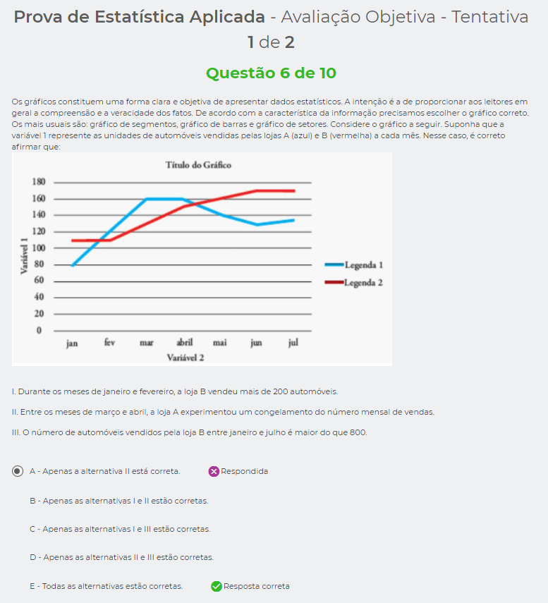 Os gráficos constituem uma forma clara e objetiva de apresentar dados estatísticos. A intenção é a de proporcionar aos leitores em geral a compreensão e a veracidade dos dados. De acordo com a característica da informação, precisamos escolher o gráfico correto. Os mais comuns são: gráfico de segmentos, gráfico de barras e gráfico de linhas. Considere o gráfico a seguir. Suponha que a variável 1 represente as unidades de automóveis vendidas pelas lojas A (azul) e B (vermelha) a cada mês. Nesse contexto, é correto afirmar que: I. Durante os meses de janeiro e fevereiro, a loja B vendeu mais de 200 unidades. II. Entre os meses de março e abril, a loja A experimentou um congelamento do número mensal de vendas. III. O número total de automóveis vendidos pela loja B entre janeiro e julho é maior do que 800. A - Apenas a alternativa II está correta. B - Apenas as alternativas I e II estão corretas. C - Apenas as alternativas I e III estão corretas. D - Apenas as alternativas II e III estão corretas. E - Todas as alternativas estão corretas.
