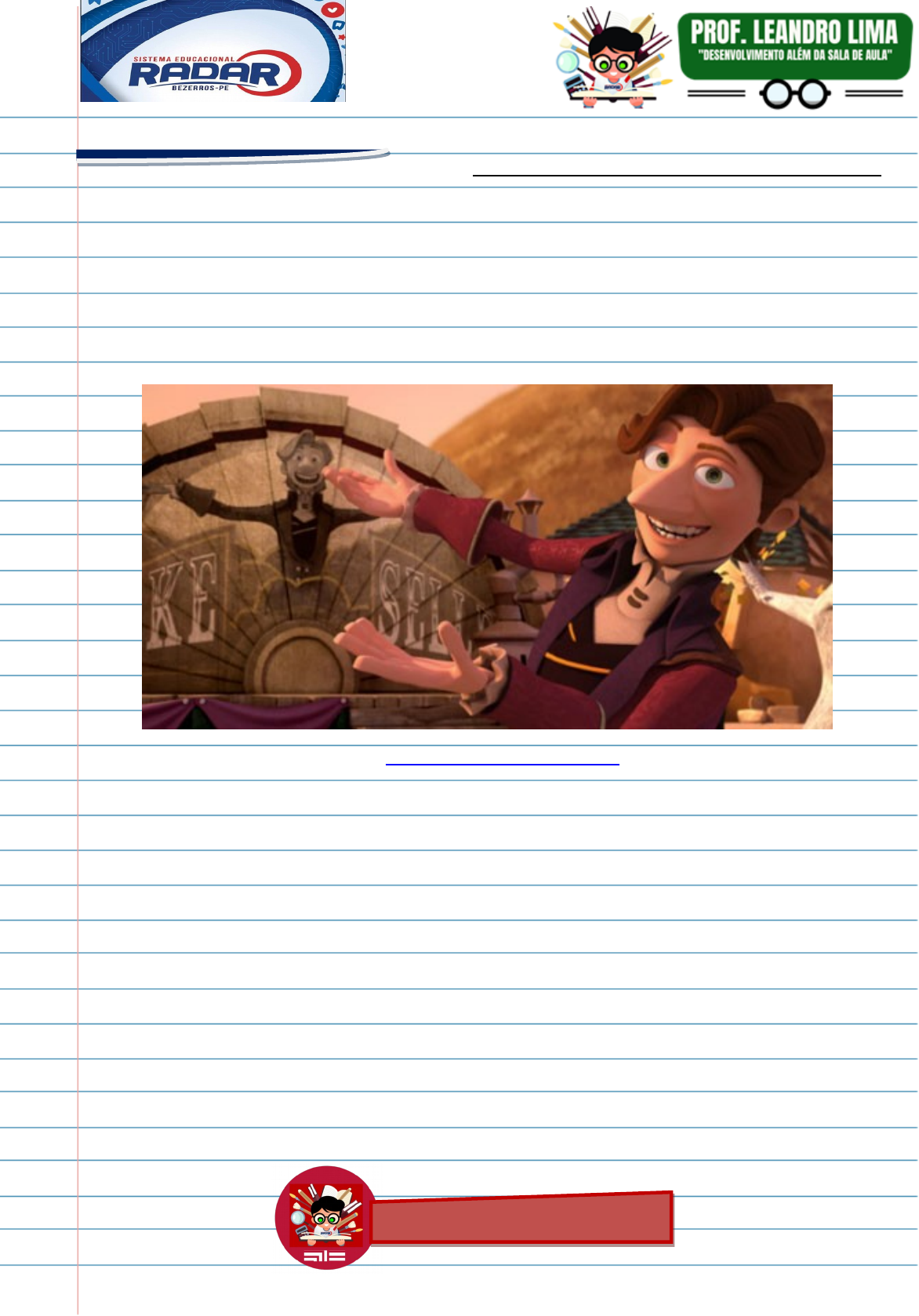 GRAMÁTICA: MORFOLOGIA AULA ASSÍNCRONA – Interpretação Textual ANIMAÇÃO: “O VENDEDOR DE FUMAÇA” - Clique na imagem ou hiperlink para ter acesso ao link do vídeo animado: “O vendedor de fumaça” e assista com bastante atenção. Link: https://youtu.be/hkNhuGfbceI - Após assistir o vídeo, escreva e responda às questões em seu caderno. INTERPRETAÇÃO TEXTUAL 01. Escolha quatro personagens da animação e descreva suas características. 02. Quando o vendedor chegou ao vilarejo, não havia nenhuma plateia o esperando. Qual foi a primeira mágica que ele fez para atrair o público? Isso deu certo? Justifique. 03. Descreva as outras duas manobras que o vendedor fez para atrair o público. 04. Quem foi o primeiro personagem que se interessou pelas mágicas do vendedor de fumaça? Explique como isso aconteceu. 05. Por que o vendedor de fumaça não pisa numa poça de água aos 2:19 min do vídeo? 06. Qual a reação dos moradores do vilarejo quando o vendedor de fumaça se despede deles? Eles tinham noção do que iria acontecer após a partida do mágico? 07. O que aconteceu depois que o vendedor saiu do vilarejo? José Leandro de Lima Professor de Língua Portuguesa www.profleandrolima.com.br