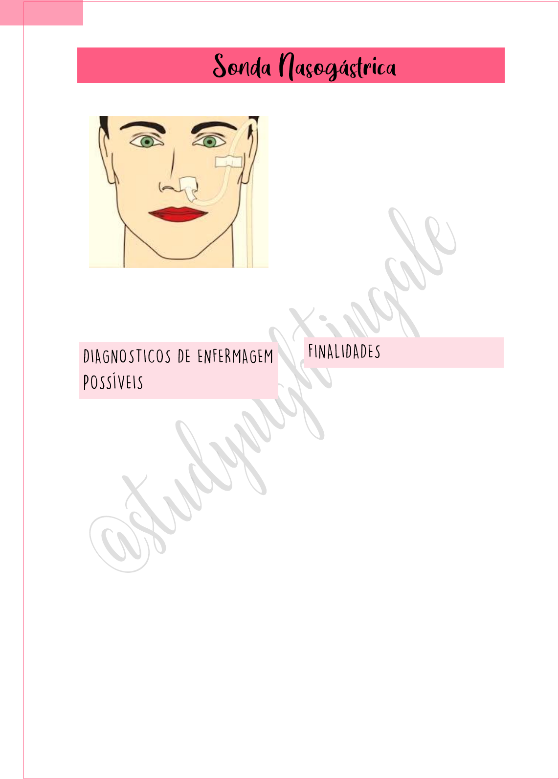 1 @studynightingale A sonda nasogástrica consiste na introdução de uma sonda através do nariz (SNG) ou da boca (SOG) até a cavidade gástrica. MAS, recomenda-se pausa alimentar, por cerca de 4 h, antes do procedimento, pois alimentos no estômago reduzem os movimentos gástricos, importantes para o posicionamento da sonda e favorece a ocorrência de náuseas e vômitos. ́ Nutrição desequilibrada: inferior às necessidades do corpo; Deglutição prejudicada; Risco de aspiração; Risco de diarreia; Mucosa oral prejudicada; Risco para volume deficiente de fluidos; Dor aguda; Integridade da pele prejudicada; Favorecer a alimentação; Drenagem; Coleta de material para exames; Administração de medicação; OBS: Após a introdução, a sonda permanece: − Aberta: para drenar a secreção gástrica, controle do débito drenado − Fechada: para alimentação, medicação. 2 @studynightingale Intubação Hemorragia digestiva Preparo pré-operatório de algumas cirurgias Lavagem gástrica Coleta de material para exame de suco gástrico Alívio das distensões abdominais Alimentação e medicação nos pacientes impossibilitados de deglutir. ✓ Sonda de Levine: em geral, nos 14 a 16 nas mulheres e nos 16 a 18 ✓ nos homens ✓ Lubrificante spray, gel hidrossolúvel ou água para umedecer a ✓ Sonda ✓ Gaze, esparadrapo ✓ Toalha de rosto ✓ Luvas de procedimento ✓ Estetoscópio. ✓ Seringa com ponta de cateter ou adaptador, 50 mL Orientar e colocar o paciente na posição de Fowler; Avaliar previamente a integridade da narina, observando desvio de septo e definindo o lado adequado para inserção da sonda; Oferecer lenço de papel ao paciente para limpeza nasal, se necessário; Colocar a toalha sobre o tórax do paciente; Abrir o material na bandeja e colocar lubrificante na gaze; Calçar as luvas e enrolar a sonda na mão Medir o comprimento da sonda: desde o lóbulo da orelha até a ponta do nariz, descendo até o 3 @studynightingale final do esterno com cuidado para não tocar a sonda no paciente; Marcar com uma tira de esparadrapo; Manter a sonda enrolada, lubrificar e introduzir delicadamente na narina; Solicitar ao paciente que flexione o pescoço e aproxime o queixo do tórax. Orientar para deglutir, durante a passagem da sonda pelo esôfago: após cada deglutição, a sonda progride, espontaneamente, na mão do profissional e não há dúvida de que a sonda esta ́ se posicionando corretamente no esôfago.; Avance o tubo por vários centímetros de cada vez, conforme o cliente engole. Se o reflexo de ânsia estiver presente, peça ao cliente que beba água ou sorva cubos de gelo enquanto o tubo avança; A movimentação peristáltica do esôfago e ́ voluntária no terço superior e involuntária nos dois terços distais, o que não ocorre nas vias respiratórias; observar se não saiu na boca; Introduzir a sonda até a marca do esparadrapo Testar se a sonda está na cavidade gástrica, utilizando um dos métodos: − Raio X (método mais confiável) − Aspirar o conteúdo gástrico com uma seringa; é possível medir o pH da secreção gástrica, confirmado pela indicação ácida; Um nível de pH inferior a 5 indica que a sonda esta ́ no estômago. − Colocar o diafragma do estetoscópio no abdome do paciente e injetar rapidamente cerca de 10 ml de ar com a seringa. Se ouvir o ruído, esta ́ no local correto 4 @studynightingale Fixar a sonda com esparadrapo; Durante o procedimento, observar reações do paciente: dispneia, tosse, cianose; ao término, retirar a luva, deixar a unidade em ordem e anotar Na SNG aberta, a sonda deverá ser conectada a uma extensão e frasco coletor; controlar o volume e características (cor, presença de resíduos, sangue) Manter o paciente em posição de Fowler, se não houver contraindicação, para evitar esofagite de refluxo; Trocar a fixação de esparadrapo, quando necessário; A Sonda Enteral é um procedimento, em que o alimento líquido (fórmula) é administrado diretamente no estômago ou no intestino delgado, usando uma sonda. Ela também pode ser chamada de gavagem gástrica. Normalmente, os pacientes que recebem esse tipo de procedimento, são pacientes que não devem ou podem comer por via oral. A alimentação por sonda enteral mantém a integridade estrutural e funcional do trato gastrointestinal, aprimora a utilização dos nutrientes e promove um método econômico e seguro de alimentação. Peritonite difusa.; Obstrução intestinal que impede o funcionamento normal do intestino; Vômitos incoercíveis, íleo paralítico; Diarreia grave. A nutrição enteral é usada nos seguintes clientes enfermos: Pancreatite grave; Isquemia gastrointestinal.; Fístula enterocutânea; 5 @studynightingale Indicadas para administração de dieta; Administração de medicamentos, principalmente aos pacientes idosos e acamados, com reflexos diminuídos. Alimentar um paciente por sonda ou via ostomia, necessita de cooperação do paciente e familiar, principalmente quando existe indicação da terapia em domicílio. ́ Risco de desequilíbrio no volume de fluidos: além das exigências do corpo; Risco de volume de fluidos deficiente. Risco de broncoaspiração; Risco de comprometimento da integridade da pele; Comprometimento da membrana da mucosa ora Seringa de 20 a 50 ml; Bacia para êmese; Toalha limpa; Bolsa para gavagem descartável e equipo; Fórmula. Bomba de infusão para a sonda, para alimentação (se necessário). Água após a alimentação; Luvas sem látex e não estéreis; Revise o prontuário médico do cliente para ver fórmula, quantidade e tempo; Explique o procedimento ao cliente enfermo.; Se estiver usando uma bolsa para gavagem, encha com a quantidade prescrita de fórmula (Figura 29.29.1). Dependendo da política institucional, a dieta já vem em recipiente próprio (manipulado pela 6 @studynightingale nutrição) para ser administrado conforme prescrição médica; Coloque o cliente enfermo sobre o lado direi