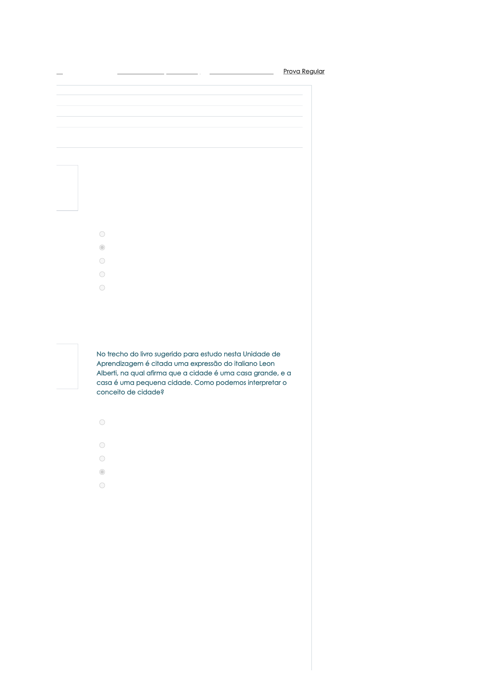 15/06/2020 Prova Regular https://graduacao.unisuam.edu.br/mod/quiz/review.php?attempt=141519&cmid=42800 1/8 Página inicial / Meus cursos / História da Arte [GARQ1150] / Atividades Avaliativas / Prova Regular Questão 1 Correto Atingiu 0,30 de 0,30 Questão 2 Correto Atingiu 0,30 de 0,30 Iniciado em segunda, 1 Jun 2020, 20:32 Estado Finalizada Concluída em segunda, 1 Jun 2020, 21:35 Tempo empregado 1 hora 2 minutos Avaliar 3,90 de um máximo de 5,50(71%) De acordo com o que Pereira afirma, esta arquitetura tem forte presença no mundo contemporâneo, é interessada no minimalismo e na engenharia e sempre utiliza tecnologia de ponta. De que estilo arquitetônico estamos falando? Escolha uma: a. Regionalismo crítico b. High-tech c. Neo-organicismo d. Empirismo e. Estruturalismo A resposta correta é: High-tech. No trecho do livro sugerido para estudo nesta Unidade de Aprendizagem é citada uma expressão do italiano Leon Alberti, na qual afirma que a cidade é uma casa grande, e a casa é uma pequena cidade. Como podemos interpretar o conceito de cidade? Escolha uma: a. Através das ideias de cidade oriundas do Ocidente e do Oriente b. Através da dicotomia entre contemporâneo e antigo c. De uma única forma d. O conceito admite múltiplas leituras e. Através da diferenciação entre cidades do primeiro mundo (desenvolvido) e do terceiro mundo (em desenvolvimento) A resposta correta é: O conceito admite múltiplas leituras. PÁGINA INICIAL CURSOS CALENDÁRIO NOTAS BUSCA https://graduacao.unisuam.edu.br/ https://graduacao.unisuam.edu.br/ https://graduacao.unisuam.edu.br/course/view.php?id=1779 https://graduacao.unisuam.edu.br/course/view.php?id=1779§ionid=13393 https://graduacao.unisuam.edu.br/mod/quiz/view.php?id=42800 https://graduacao.unisuam.edu.br/ https://graduacao.unisuam.edu.br/course/index.php https://graduacao.unisuam.edu.br/calendar/view.php?view=month https://graduacao.unisuam.edu.br/grade/report/overview/index.php https://graduacao.unisuam.edu.br/search 15/06/2020 Prova Regular https://graduacao.unisuam.edu.br/mod/quiz/review.php?attempt=141519&cmid=42800 2/8 Questão 3 Correto Atingiu 0,30 de 0,30 Questão 4 Correto Atingiu 0,30 de 0,30 Questão 5 Correto Atingiu 0,30 de 0,30 Para a apreciação da arte, é necessário observá-la, refletir e criticá-la a ponto de emitir opiniões fundamentadas sobre gostos, estilos, materiais e modos diferentes de fazer arte. Ou seja, a arte é uma experiência humana de conhecimento estético, que expressa ideias e emoções. Segundo o pensamento do filósofo grego Aristóteles, pode-se dizer também que: Escolha uma: a. A Arte é imitação da natureza b. A Arte não pode abordar a estética de forma ambígua e questionável c. O belo está desligado da figura humana d. A proporção não é desejável na beleza da arte e. Arte e beleza estão sempre juntas A resposta correta é: A Arte é imitação da natureza. Há diversos sentidos atribuídos à palavra IMAGEM. Assinale a alternativa abaixo que aponte corretamente a definição atribuída pela semiótica: Escolha uma: a. A imagem é o objeto perceptível diretamente b. A imagem é o mesmo que televisão c. A imagem é cópia de um objeto segundo d. A imagem é um signo visual e. A imagem é semelhança e perfeição A resposta correta é: A imagem é um signo visual. Antes das palavras surgirem, os homens das cavernas se expressavam por meio de registros visuais. Marque a alternativa correta a respeito da imagem: Escolha uma: a. A imagem é uma forma de expressão do homem, tendo sua origem na Revolução Óptica b. A imagem é uma forma de expressão do homem, tendo sua origem desde a Pré-história c. Os estudos da imagem e da palavra têm sido programados igualmente pela História d. Os estudos da imagem se restringem ao campo de pesquisa da História da Arte e. Os estudos da imagem avançaram no passado a partir da supervalorização da escrita A resposta correta é: A imagem é uma forma de expressão do homem, tendo sua origem desde a Pré-história. PÁGINA INICIAL CURSOS CALENDÁRIO NOTAS BUSCA https://graduacao.unisuam.edu.br/ https://graduacao.unisuam.edu.br/course/index.php https://graduacao.unisuam.edu.br/calendar/view.php?view=month https://graduacao.unisuam.edu.br/grade/report/overview/index.php https://graduacao.unisuam.edu.br/search 15/06/2020 Prova Regular https://graduacao.unisuam.edu.br/mod/quiz/review.php?attempt=141519&cmid=42800 3/8 Questão 6 Incorreto Atingiu 0,00 de 0,30 Questão 7 Incorreto Atingiu 0,00 de 0,30 Um índice se caracteriza por apresentar uma relação de casualidade com o objeto que representa, como o chão molhado sendo um indício de que choveu. Marque a alternativa correta que mencione a caraterização dos signos feita por Peirce: Escolha uma: a. Um índice se caracteriza por apresentar uma relação de convencionalidade com o objeto que representa b. Um ícone se caracteriza por apresentar uma relação arbitrária com o objeto que representa c. Um ícone se caracteriza por apresentar uma relação de casualidade com o objeto que se apresenta d. Um índice se caracteriza por apresentar uma relação de causalidade com o objeto que se apresenta e. Um símbolo se caracteriza por apresentar uma relação de semelhança com o objeto que se apresenta A resposta correta é: Um índice se caracteriza por apresentar uma relação de causalidade com o objeto que se apresenta. Marque a alternativa CORRETA a respeito da imagem como ideia. Escolha uma: a. Para Aristóteles a imagem era tomada como sinônimo de imitação b. Para Platão as imagens surgem como um objeto primeiro c. Para Aristóteles as imagens surgem como um objeto segundo. d. Para Platão a imagem era vista como condução do conhecimento e. Para Aristóteles, o nosso pensamento se operava por imagens A resposta correta é: Para Aristóteles, o nosso pensamento se operava por imagens. PÁGINA INICIAL CURSOS CALENDÁRIO NOTAS BUSCA https://graduacao.unisuam.edu.br/ https://graduac