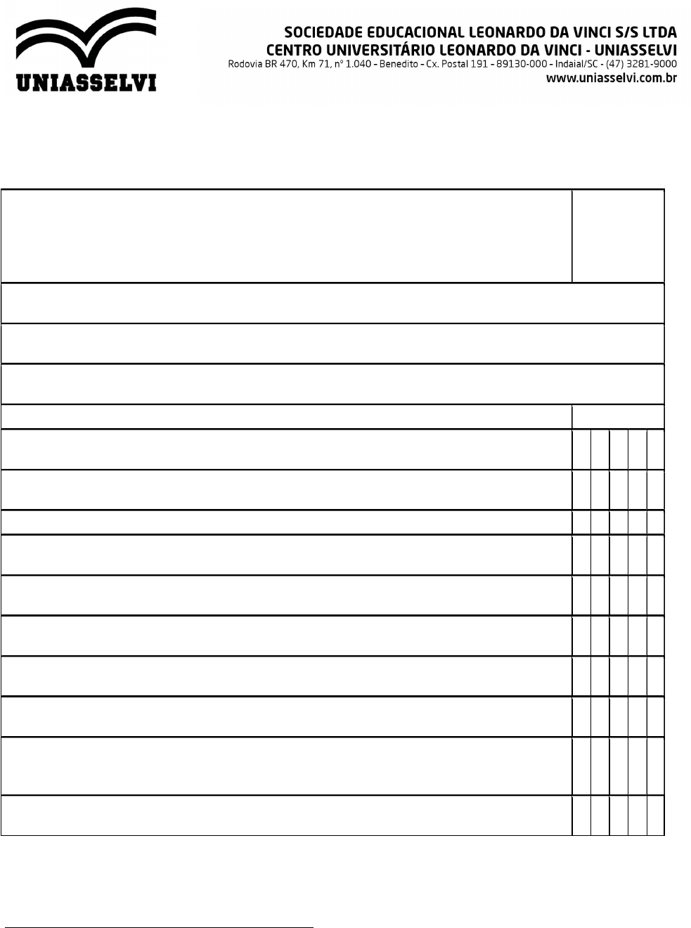 FICHA DE AVALIAÇÃO – DIAGNÓSTICO EMPRESARIAL (Preenchida pelo responsável da empresa pelo atendimento aos acadêmicos) Acadêmicos/matrícula: Turma: Nome da Empresa Participante: CNPJ: Responsável na empresa / cargo (quem respondeu o questionário) Para cada um dos itens a seguir, atribuir uma nota na escala de 1 a 5, sendo: 1 - Não atendeu as expectativas e 5 - Atendeu completamente as expectativas. ASPECTOS A CONSIDERAR NOTA 1 Planejamento/Organização: Os acadêmicos fizeram contato com a empresa com antecedência para explicar a atividade e agendar horários para a realização da entrevista. 1 2 3 4 5 2 Assiduidade: Os acadêmicos compareceram no dia, horário e local agendados para a realização da entrevista. 1 2 3 4 5 3 Disciplina: Os acadêmicos observaram as normas e regulamentos da empresa. 1 2 3 4 5 4 Apresentação Pessoal: Os acadêmicos tiveram uma apresentação pessoal adequada (trajes, aparência) durante os momentos de condução da entrevista. 1 2 3 4 5 5 Cooperação: Os acadêmicos souberam cooperar com os envolvidos na entrevista, e tiveram a capacidade de entender eventuais imprevistos. 1 2 3 4 5 6 Zelo: Os acadêmicos tiveram cuidado no uso das instalações e eventual manuseio de equipamentos/máquinas, bem como no tratamento com colaboradores da empresa. 1 2 3 4 5 7 Interesse: Os acadêmicos demonstraram interesse em conhecer a realidade da empresa e coletar os dados. 1 2 3 4 5 8 Conhecimento: Os acadêmicos demonstraram possuir conhecimento sobre os itens do questionário aplicado. 1 2 3 4 5 9 Iniciativa: Os acadêmicos demonstraram capacidade de pensar e agir, assim como de apresentar sugestões ao aperfeiçoamento das atividades, fazendo uso do bom senso e respeitando a hierarquia e as normas da empresa. 1 2 3 4 5 10 Capacidade de relacionamento: Os acadêmicos integraram-se à realidade da empresa, favorecendo um clima de solidariedade, colaboração, respeito e polidez. 1 2 3 4 5 Cidade: dd / mm / aaaa Nome responsável na empresa Setor Carimbo