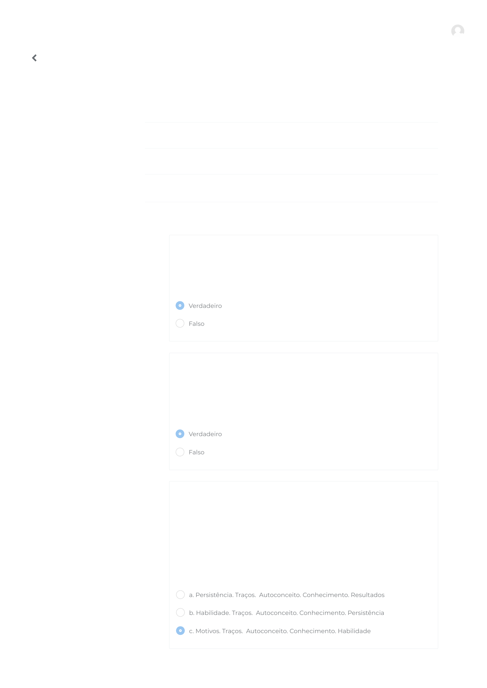 07/11/2020 Atividade 03 https://ava.politecnicabr.com.br/mod/quiz/review.php?attempt=806413 1/2 Painel / Minhas Disciplinas / 15A124 / Aula 03 - Modelo de competências empreendedoras / Atividade 03 Empreendedorismo Questão 1 Correto Atingiu 2,00 de 2,00 Questão 2 Correto Atingiu 2,00 de 2,00 Questão 3 Correto Atingiu 2,00 de 2,00 Iniciado em sábado, 7 Nov 2020, 04:04 Estado Finalizada Concluída em sábado, 7 Nov 2020, 04:05 Tempo empregado 1 minuto 12 segundos Avaliar 10,00 de um máximo de 10,00(100%) De acordo com as leituras complementares, pode-se aferir que competência signi�ca o conjunto de quali�cações que a pessoa tem para executar um trabalho com nível superior de performance. Escolha uma opção: O reconhecimento de oportunidades é uma etapa-chave no processo empreendedor, pois a essência do reconhecimento de oportunidades está no maior acesso às informações, seu uso e�caz e maior habilidade de utilizar as informações relacionadas com oportunidades Escolha uma opção: Spencer e Spencer (1993), que trabalharam em conjunto com McClelland na formulação de uma metodologia para a identi�cação de competências, dividem-nas em cinco níveis. Quais são eles: Escolha uma: Verdadeiro Falso Verdadeiro Falso a. Persistência. Traços. Autoconceito. Conhecimento. Resultados b. Habilidade. Traços. Autoconceito. Conhecimento. Persistência c. Motivos. Traços. Autoconceito. Conhecimento. Habilidade BIBLIOTECA SIRIUS Jefferson Leonardo Cruz https://ava.politecnicabr.com.br/my/ https://ava.politecnicabr.com.br/course/view.php?id=883 https://ava.politecnicabr.com.br/course/view.php?id=883#section-4 https://ava.politecnicabr.com.br/mod/quiz/view.php?id=29031 https://ava.politecnicabr.com.br/course/view.php?id=883 javascript:void(0) javascript:void(0) javascript:void(0) javascript:void(0) javascript:void(0) javascript:void(0) javascript:void(0) javascript:void(0) javascript:void(0) javascript:void(0) javascript:void(0) javascript:void(0) javascript:void(0) https://ava.politecnicabr.com.br/course/index.php https://ava.politecnicabr.com.br/ https://biblioteca.politecnicabr.com.br/student http://sirius.politecnicabr.com.br/ javascript:void(0) javascript:void(0) 07/11/2020 Atividade 03 https://ava.politecnicabr.com.br/mod/quiz/review.php?attempt=806413 2/2 © 2020 - Escola Politécnica Brasileira Questão 4 Correto Atingiu 2,00 de 2,00 Questão 5 Correto Atingiu 2,00 de 2,00 De acordo com Spencer e Spencer (1993) Autoconceito é uma competência no nível de traço das característica que os gerentes bem- sucedidos, devem ter. Escolha uma opção: O insucesso empresarial de uma forma ou de outra está associado as decisões e ao comportamento que este indivíduo tem na condução de seu empreendimento. Dessa forma, as características empreendedoras que in�uenciam o comportamento e as competências necessárias para o empreendedor parecem estar intimamente relacionadas. Escolha uma opção: Verdadeiro Falso Verdadeiro Falso Entre em Contato https://www.politecnicabr.com.br 0800 084 2627 indisponível devido a pandemia de COVID-19, use outro canal! 0800 084 2627 comercial@politecnicabr.com.br Links Úteis Declaração de Matrícula Orientações do AVA Abertura de Ticket Fale com o Tutor Cronograma de Estudos Solicitação de Diploma Manual de Estágio Manual de Competência Siga-nos nas redes sociais BIBLIOTECA SIRIUS Jefferson Leonardo Cruz https://ava.politecnicabr.com.br/mod/quiz/0 https://www.politecnicabr.com.br/ mailto:comercial@politecnicabr.com.br https://storage.googleapis.com/sirius-pubstore/declaracao_matricula.pdf https://storage.googleapis.com/sirius-pubstore/orientacoes_ava.pdf https://storage.googleapis.com/sirius-pubstore/abertura_ticket.pdf https://storage.googleapis.com/sirius-pubstore/fale_com_tutor.pdf https://storage.googleapis.com/sirius-pubstore/cronograma_estudos.pdf https://storage.googleapis.com/sirius-pubstore/solicitacao_diploma.pdf https://storage.googleapis.com/sirius-pubstore/manual_estagio.pdf https://storage.googleapis.com/sirius-pubstore/manual_competencia.pdf https://www.facebook.com/politecnicabr https://www.instagram.com/politecnicabr_oficial https://ava.politecnicabr.com.br/course/view.php?id=883 javascript:void(0) javascript:void(0) javascript:void(0) javascript:void(0) javascript:void(0) javascript:void(0) javascript:void(0) javascript:void(0) javascript:void(0) javascript:void(0) javascript:void(0) javascript:void(0) javascript:void(0) https://ava.politecnicabr.com.br/course/index.php https://ava.politecnicabr.com.br/ https://biblioteca.politecnicabr.com.br/student http://sirius.politecnicabr.com.br/ javascript:void(0) javascript:void(0)