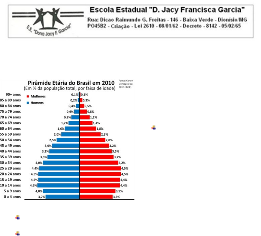 Avalição parcial de Geografia Data: 06/11/2019 Nome: ___________________________________________ Valor 6,00 Nota: ________ Assunto: A população da terra. 3º ano Médio 1. Observe a pirâmide e responda:1,0 a) Quais partes compõem uma pirâmide etária. E o que cada uma delas representa? · _________________________________ _________________________________ · _________________________________ _________________________________ · _________________________________ __________________________________ 2 Conforme dados da Organização das Nações Unidas (ONU), em 1950, existiam 250 milhões de indivíduos com mais de 60 anos no planeta. Esse número quase triplicou até o ano 2000, somando 606 milhões de pessoas. Esse aumento contínuo e expressivo do número de idosos no mundo deve-se a vários fatores, exceto:0,5 a) Hábitos de vida mais saudáveis, como a prática de atividade física. b) Melhoria na qualidade de vida da população idosa. c) Avanços da medicina e da produção de medicamentos. d) Acompanhamento médico e cuidados com a alimentação. e) Diminuição da expectativa de vida. 3. . Embora o Brasil esteja colocado entre os países mais populosos do mundo, quando se relaciona sua população total com a área do país obtém-se um número relativamente baixo. A essa relação de população x área, damos o nome de: 0,5 a) Taxa de crescimento. b) Índice de desenvolvimento. c) Densidade demográfica. d) Taxa de natalidade. e) Taxa de fertilidade. 4. De acordo com dados divulgados em 2009 pelo Fundo de População das Nações Unidas (FNUAP), o planeta Terra é habitado por 6,826 bilhões de pessoas. Essa população está distribuída de forma desigual pelos continentes. Nesse sentido, marque a alternativa que corresponde ao continente mais populoso.0,5 a) África. b) América. c) Ásia. d) Europa. e) América do Norte. 5. Sobre os aspectos da população mundial marque (V) para as alternativas verdadeiras e (F) para as falsas.1,0 ( ) O continente africano possui elevadas taxas de crescimento populacional, entretanto, seu contingente só não é maior em razão das baixas taxas de expectativa de vida. ( ) O crescimento vegetativo da população latino-americana é, de uma maneira geral, muito baixo, pois as taxas de mortalidade infantil são elevadíssimas. ( ) O rápido crescimento populacional intensifica os problemas ambientais de um determinado local. ( ) A população da Europa tem aumentado a cada ano, consequência da elevada expectativa de vida e das altas taxas de natalidade. ( ) Quanto maior o nível de desenvolvimento de um país, maior é a expectativa de vida de seus habitantes. Marque a sequencia correta: a) F, F, V, V, F b) V, F, V, F, V c) F, V, F, V, F d) V, V, F, F, V 6. O envelhecimento da população está mudando radicalmente as características da população da Europa, onde o número de pessoas com mais de 60 anos deverá chegar, nas próximas décadas, a 30% da população total. Graças aos avanços da medicina e da ciência, a população está cada vez mais velha. Isso ocorre em função do:0,5 a) Declínio da taxa de natalidade e aumento da longevidade. b) Aumento da natalidade e diminuição da longevidade. c) Crescimento vegetativo e aumento da taxa de natalidade. d) Aumento da longevidade e do crescimento vegetativo. e) Declínio da taxa de mortalidade e diminuição da longevidade. 7. Analise a tabela abaixo e marque (V) para as alternativas verdadeiras e (F) para as falsas.1,0 a)( ) Com mais de 1,3 bilhão de habitantes, a China é o país mais populoso e mais povoado. b)( ) O Afeganistão é a nação que apresenta o maior crescimento demográfico e a menor expectativa de vida. c)( ) Entre os países analisados, o Brasil é o terceiro mais populoso, além de ser o menos povoado. d)( ) Com aproximadamente 33 mil habitantes, Mônaco possui a maior expectativa de vida, além de ser o mais povoado. e)( ) Estados Unidos é menos populoso que a China e mais povoado que o Afeganistão, além de possuir crescimento demográfico superior a Mônaco. 8. Faça a correta correlação entre os conceitos e as definições a respeito da Teoria Neomalthusiana e as teorias que a criticam. Em seguida, assinale a alternativa com a sequência correta:1,0 1. Teoria Malthusiana 2. Teoria Neomalthusiana 3. Teoria Reformista ( ) Acreditava que o aumento das taxas de natalidade era resultado do subdesenvolvimento, não sua causa. Que a população cresceria em ritmo geométrico e a produção de alimentos em progressão aritmética. ( ) Era a favor do uso de anticoncepcionais e afirmava que, se o crescimento populacional não fosse contido, os recursos naturais seriam esgotados. ( ) Acreditava que o crescimento populacional superaria a oferta de alimentos, gerando fome e miséria no mundo todo. a) 1,3,2 b) 2,1,3 c) 3,2,1 d )3,1,2 Ass.: ________________________________________________________________ Avalição parcial de Geografia Data: 06/11/2019 2º ano médio Nome: ___________________________________________ Valor 6,00 Nota: ________ Assunto: Recursos minerais e fontes de energia. 1. Atualmente, existem aqueles recursos naturais que são de maior utilidade e, portanto, de maior importância para as atividades socioeconômicas. Um deles é um recurso não renovável que se encontra cada vez mais escasso na natureza, podendo acabar nos próximos anos. Tal recurso demanda muitos gastos e técnicas avançadas na sua extração, mas é muito utilizado na produção de materiais (como o plástico) e também é visto como uma fonte de energia. O trecho acima fala do seguinte elemento retirado da natureza:0,5 a) Alumínio b) Petróleo c) Ouro d) Biomassa e) Carvão Mineral 2. Observe os gráficos a seguir e assinale a alternativa correta:1,0 a) A maior parte dos principais consumidores de petróleo são países desenvolvidos ou emergentes, enquanto as maiores reservas encontram-se no mundo subdesenvolvido. b) As maiores reservas correspondem também aos maiores prod