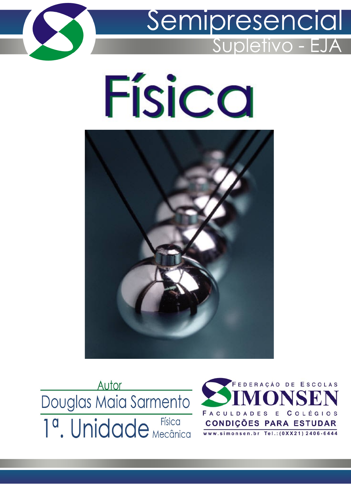 1 1º Unidade Capítulo I Medidas de Comprimento__________________________________________________________3 Questões do ENEM______________________________________________________________12 Capítulo II Leis de Newton__________________________________________________________________14 Questões do ENEM______________________________________________________________28 Capítulo III Energia_________________________________________________________________________30 Questões do ENEM______________________________________________________________37 Capítulo IV Hidrostática_____________________________________________________________________39 Questões do ENEM______________________________________________________________48 2 Organização: Apoio: O metro é um padrão de medida usado apenas para medidas não muito extensas. Para medidas muito menores foi preciso criar outras unidades derivadas do metro, como mostra a tabela abaixo: UNIDADE SÌMBOLO EQUIVALÊNCIA Metro m --- Quilometro km 1 km = 10³ m Centímetro cm 1 cm = 10ˉ² m Milímetro mm 1 mm = 10ˉ³ m Micrometro µm 1 µm = m ÅngstrÖn Å 1 Å = 10ˉ¹º m Medidas de Massa Na tabela a seguir, temos algumas unidades de massa: UNIDADE SÍMBOLO EQUIVALÊNCIA Tonelada t 1 t = 10³ kg Quilograma kg --- Grama g 1 g = 10ˉ³ kg Miligrama mg 1 mg = kg 3 Capítulo I Medidas de Intervalos de Tempo Na tabela a seguir, temos algumas unidades de tempo: UNIDADE SÍMBOLO EQUIVALÊNCIA Segundo s --- Minuto m 1min = 60s Hora h 1h = 3600s Conceitos Básicos de Cinemática A mecânica é a parte da física que estuda o movimento e a cinemática e uma divisão da mecânica que estuda os movimentos sem se referir as causas que os produzem. Repouso, Movimento e Referencial Analise a seguinte afirmação: quando estamos dentro de um veículo, a paisagem que no cerca e fundamental para estabelecermos os conceitos de movimento e repouso. Neste caso, percebemos que o movimento e observado a partir de um referencial: a paisagem é o referencial do carro. Trajetória Podemos concluir que a trajetória: • É a linha descrita ou percorrida pelo corpo em movimento; • Depende do referencial. Espaço Espaço (s) é um numero real que permite a localização do móvel em sua trajetória. 4 Atualmente a medida padrão internacional da grandeza massa é um cilindro de um quilograma, que se encontra no Museu Internacional de Pesos e Medidas, na cidade de Sèveres, próximo de Paris. No SI, o metro (m) e a unidade de medida de espaço. Nas rodovias, por exemplo, a unidade mais usada e o quilometro (Km). Capítulo I Deslocamento Escalar O deslocamento escalar (Δs) mede a variação de espaço realizada pelo móvel em um determinado intervalo de tempo (Δt). Velocidade Escalar Media Se o motorista de uma automóvel percorre 140 Km em 2h, dizemos que em media, ele se deslocou 70 km em cada hora. Esse resultado expressa a velocidade escalar media (Vm) e pode ser escrito da seguinte forma: Vm = Vm = Vm = 70 km/h Como é sempre positivo, o sinal da velocidade escalar media coincide com o sinal do deslocamento escalar: > 0 Vm > 0 (o móvel se desloca a favor da trajetória: movimento progressivo) < 0 Vm < 0 (o móvel se desloca contra a trajetória: movimento retrogrado) No SI, a velocidade escalar medida em metros por segundo (m/s). na pratica, a mais usada é quilômetro por hora (k/m). Como em muitos problemas e importante colocar as unidades de medida num mesmo sistema, passando-as de k/m para m/s ou vice-versa, convém lembrar que: Movimento Uniforme Movimento uniforme é aquele que se dá com velocidade constante. Escrevemos: 5 Busque mais sobre deslocamento. Capítulo I http://www.infoescola.com/fisica/deslocamento-escalar/ http://www.infoescola.com/fisica/deslocamento-escalar/ No movimento uniforme, o móvel percorre distâncias iguais em intervalos de tempo iguais. Esta é a forma de verificar, experimentalmente, se um objeto se move com velocidade constante. Função Horária do Espaço A expressão que obtivemos é a função horária dos espaços para o movimento uniforme. Aceleração Escalar Média Considerando o motociclista em movimento numa rodovia, de tal forma que em um intervalo de tempo , a sua velocidade tenha sofrido uma variação . Definimos como aceleração escalar média: Função Horária dos Espaços A função horária dos espaços para o movimento uniformemente variado é representado por uma equação do 2º grau, como indicamos a seguir: 6 Movimento Uniformemente Variado Para um movimento seja denominado MUV (movimento uniformemente variado) ele tem que possuir uma aceleração escalar é constante e diferente de zero. Capítulo I Função Horária da Velocidade Determinação da função horária da velocidade para o movimento uniformemente variado. v = v0 + a . t Essas expressões fornecem a velocidade escalar v num instante t qualquer do movimento. Ela é, por isso, denominada função horária da velocidade escalar instantânea. A função obtida é de primeiro grau em t. Exemplo 1. Duas cidades A e B, distam 200km entre si. Simultaneamente, um carro parte de A para B a 60km/h, e outro de B para A com rapidez de 40km/h, seguindo pela mesma estrada. a) Depois de quanto tempo irão se encontrar? b) A que distância de A lês se encontrarão? Existem Duas Formas de Resolver o Problema Acima 1. Por rapidez relativa: Carro A: Carro B: (o sinal negativo indica um sentido de movimento oposto ao do carro A) Como os movimentos possuem a mesma direção e sentidos opostos, a rapidez relativa será: 7 Capítulo I Trata-se de um MRU, pois não há nada que indique variação na rapidez (módulo da velocidade), logo: 2. Usando a equação horária da posição do MU: X = X0 + V . t Para o carro A: Para o carro B: XA = 0 + 60 . t XB = 200 – 40 . t No momento do encontro: Equação de Torricelli Em algumas circunstâncias, quando por exemplo não sabemos a variação da velocidade em função do tempo, será conveniente utilizarmos a equação de 