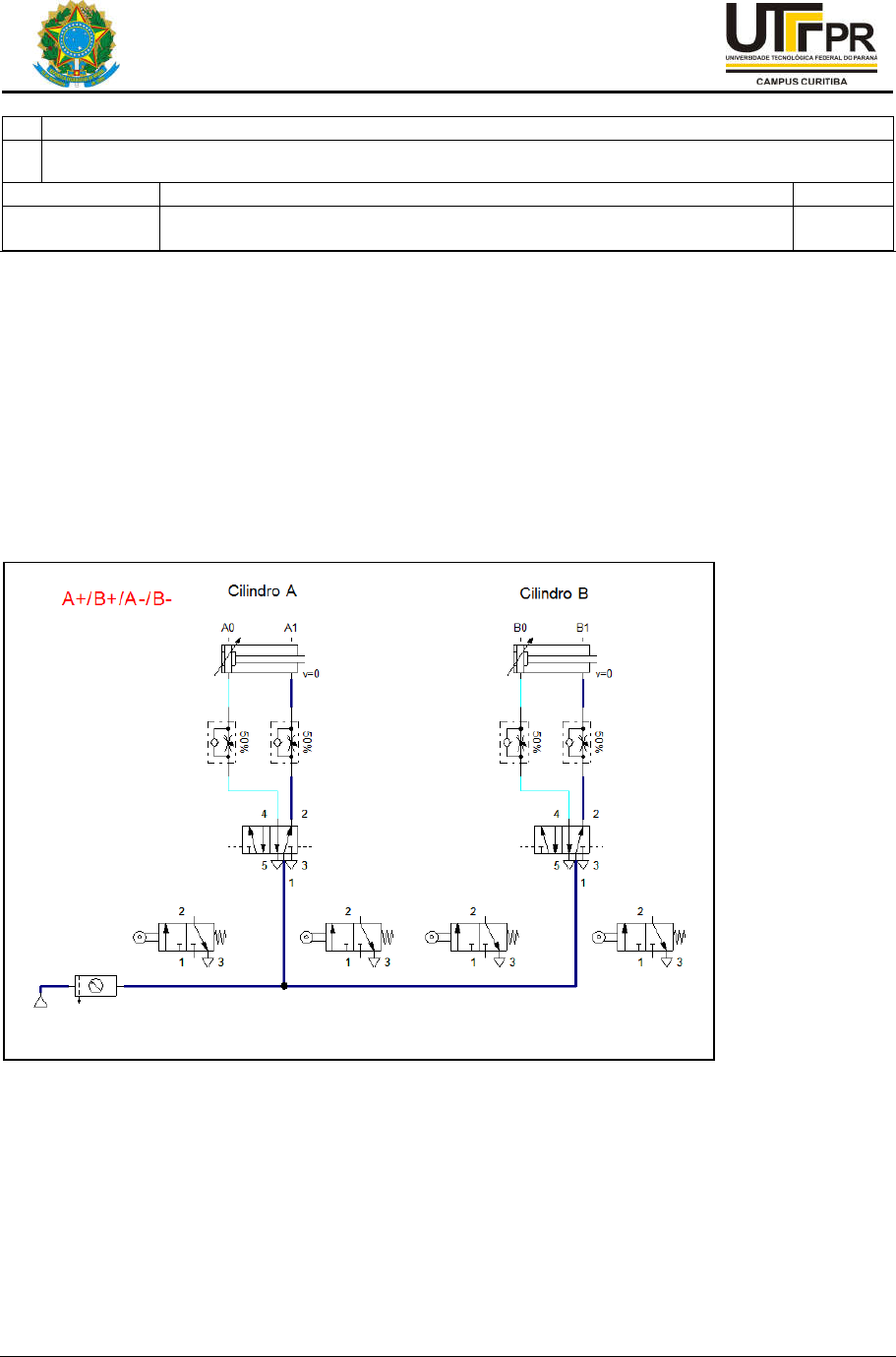 Ministério da Educação UNIVERSIDADE TECNOLÓGICA FEDERAL DO PARANÁ Campus Curitiba 01 AULA 5 + LISTA DE EXERCÍCIOS 2 PROF. RUY NAKAYAMA Código Nome Turma ME66H SISTEMAS HIDRO PNEUMÁTICOS S41 Aula 05 1 CIRCUITAÇÃO DE LÓGICAS PNEUMÁTICAS SEQUENCIAIS 1.1 MÉTODO INTUITIVO Este método consiste em montar o circuito por tentativas e erros. Apesar de poder ser utilizada pode trazer grandes dificuldades ou perdas de tempo em algumas situações. Vejamos o exemplo de um circuito com dois cilindros A e B onde queremos realizar a seguinte sequência: A+/B+/A-/B- ilustrada na Fig. 1. Neste circuito temos o circuito principal de força, realçado em azul, que é por onde a potência do ar comprimido é transmitida aos atuadores lineares (cilindros). Sendo este circuito responsável por conduzir a potência, a bitola das mangueiras deste circuito também deverá ser compatível com a vazão do ar que fluirá por ela. Neste método intuitivo utilizamos as válvulas de fim de curso A0, A1, B0 e B1 para acionar os respectivos pilotos das válvulas direcionais 5/2 vias que acionam os cilindros A e B. Este circuito formado pelas válvulas fim de curso tem a função apenas de transmitir informações e processar a lógica. Por conseguinte, este circuito é chamado de circuito de comando ou de lógica. Como a função deste circuito é de apenas conduzir informação e não de potência, o consumo de ar deve ser o menor possível e por isso as bitolas das mangueiras neste circuito são reduzidas. Intuitivamente podemos usar a válvula fim de curso A1 para acionar o avanço do cilindro B, a válvula B1 para acionar o retorno do cilindro A, a válvula A0 para acionar o retorno do cilindro B e a válvula B0 para reiniciar o ciclo acionando o avanço de A como mostra a Fig. 2. Simulando este circuito no FluidSIM-P vemos que funciona perfeitamente. Fig. 1 - Circuito A+/B+/A-/B- Ministério da Educação UNIVERSIDADE TECNOLÓGICA FEDERAL DO PARANÁ Campus Curitiba Aparentemente, parece ser possível aplicar esta regra para qualquer outra sequência de movimentos, mas se propusermos a realizar a seguinte sequência apenas alterando a ordem de um movimento para A+/B+/B-/A- e tentarmos intuitivamente já percebemos que nem sempre a circuitação é tão simples assim como mostra a Fig. 3. Nela vemos que o a Válvula A0 é incapaz de iniciar o ciclo comutando a válvula 5/2 vias para avançar o cilindro A porque a válvula B0 já se encontra acionada. Fig. 2 - Circuito A+/B+/A-/B- implementado Fig. 3 - Circuito A+/B+/B-/A- Ministério da Educação UNIVERSIDADE TECNOLÓGICA FEDERAL DO PARANÁ Campus Curitiba Deste ponto em diante pode-se implementar algumas tentativas acrescentando-se algumas válvulas, mas já será perceptível o quanto o método intuitivo pode se tornar difícil diante de um mero desafio como este. 1.2 MÉTODO CASCATA Para resolvermos estes problemas de maneira sistemática foi desenvolvido o método cascata. Veja no exemplo anterior que o último movimento que faz com que o cilindro A recue impede agora que o cilindro A avance. No método cascata, o que se propõe é dividir a sequência de movimentos em grupos de maneiras que movimentos antagônicos de um mesmo cilindro não fiquem no mesmo grupo. Assim, a sequência anterior deveria ser separada em dois subgrupos de sequencias: Grupo I (A+/B+) e Grupo II (B-/A-). Estes dois grupos teriam linhas de pressurização independentes, em que jamais ambas as linhas seriam pressurizadas simultaneamente. Para isso, desenhamos duas linhas de pressurização: I e II e criamos uma lógica de comutação para a pressurização destes grupos (Fig. 4). Note que os grupos são separados de maneira que no mesmo grupo não há movimentos opostos do mesmo cilindro. A comutação dos grupos é feita através dos sinais que representam a conclusão da última ação do grupo. No caso, a última tarefa do grupo I é B+, consequentemente o sinal que representa a finalização do Grupo I é o sinal b1. Da mesma maneira, o sinal que representa a finalização do Grupo II é a0. Dentro dos grupos a sequencialização também é feita através de sinais. No caso, a inicialização do movimento A+ dentro do Grupo I será feita através do botão de inciar Bi, e concluído este movimento o próximo movimento B+ é disparado pelo sinal a1. Concluído o movimento B+, terá sido concluída a última tarefa do Grupo I e por isso, o sinal b1 comutará para o Grupo II. Dentro do Grupo II, o primeiro movimento B- já poderá ser imediato, independente de qualquer sinal. Após concluído este primeiro movimento dentro do Grupo II, o próximo movimento A- é disparado pelo sinal de b0. A lógica de comutação de grupos é mostrada na Fig. 5 com 2 grupos e na Fig. 6 com 3 grupos. Fig. 4 - Separação em Grupos Fig. 5 - Lógica de comutação de grupos com 2 grupos Ministério da Educação UNIVERSIDADE TECNOLÓGICA FEDERAL DO PARANÁ Campus Curitiba Na Fig. 7 estão representadas as três situações de pressurização do grupo onde mostra-se que apenas um grupo é pressurizado por vez. Nesta lógica é utilizada uma válvula 4/2 vias de duplo piloto, biestável para comutação de grupos. Os sinais que comutam para o grupo I e grupo II serão respectivamente a0 e b1 no caso do exercício exemplo. Os movimentos executados dentro do grupo são acionados através de Fig. 7 - Comutação de Grupos - 3 Grupos (pressuriza somente um grupo por vez) Fig. 6 - Lógica de Comutação de Grupos - 3 grupo Ministério da Educação UNIVERSIDADE TECNOLÓGICA FEDERAL DO PARANÁ Campus Curitiba sinais que recebem a pressurização correspondente ao grupo pois assim garantiremos que dois grupos jamais estarão pressurizados simultaneamente e como dois movimentos opostos não pertencerão ao mesmo grupo, jamais teremos o problema de não se conseguir acionar um movimento como na Fig. 3. Este acionamento é mostrado na Fig. 8. O método de circuitação cascata é um método funcional, e r
