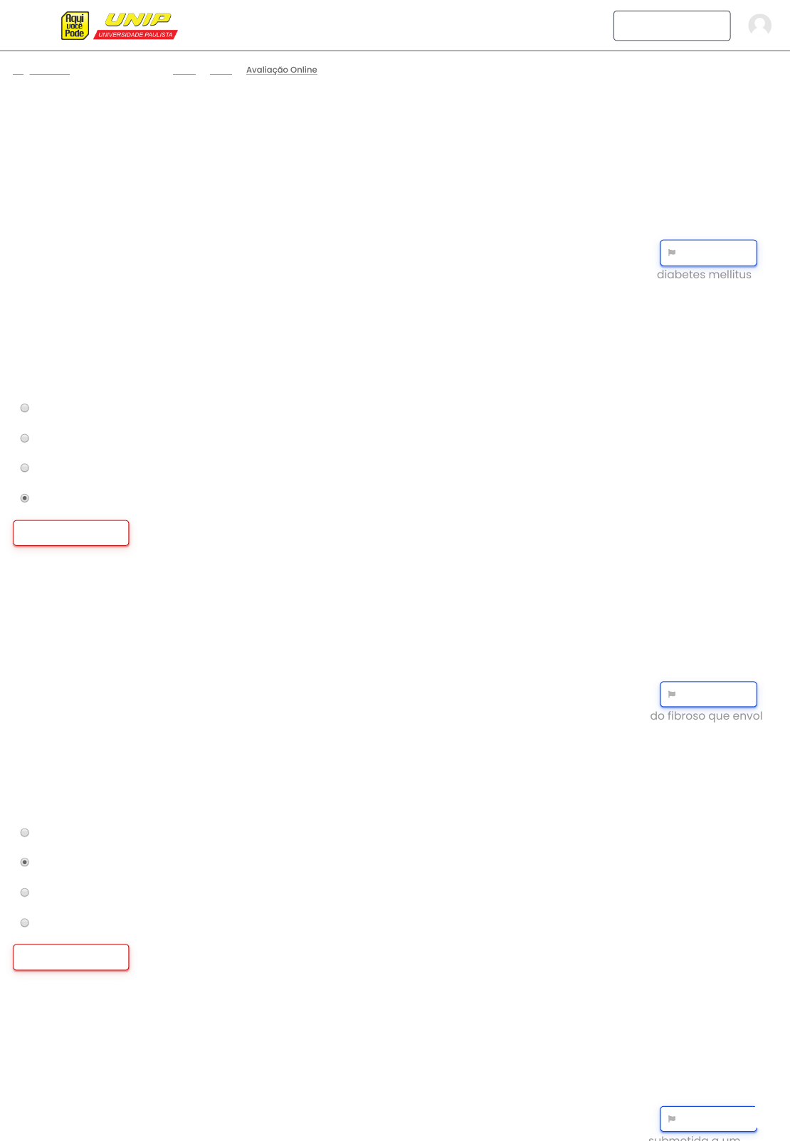 - Minhas disciplinas - - - Bibliotecas Virtuais Página inicial R2201 Geral Avaliação Online Desde o século XVIII, o exercício vem sendo defendido como instrumento benéfico no tratamento de pacientes com diabetes mellitus (DM). Como ocorre em indivíduos sem diabetes, pacientes com DM apresentam um aumento na utilização periférica da glicose associada a um aumento na sensibilidade periférica à ação da insulina que persiste por 12 horas ou mais após o final do exercício. O pâncreas, além da função de secretar insulina, também participa efetivamente na digestão dos carboidratos, proteínas e triglicerídeos (gorduras), portanto com várias funções importantes dentro do nosso organismo. Anatomicamente, este órgão está dividido em quantas partes e quais são elas? Escolha uma: a. Duas partes: cabeça e corpo b. Duas partes: cabeça e cauda c. Três partes: cabeça, cauda e ducto pancreático d. Três partes: cabeça, corpo e cauda Limpar minha escolha "Fratura de pênis (FP) é definida como trauma peniano fechado, com ruptura da túnica albugínea, camada de tecido fibroso que envolve os corpos eréteis, localizada logo abaixo da pele do pênis. Esta ruptura é consequente do aumento de pressão sob a albugínea, em geral durante atividade sexual, quando sua espessura se reduz em até 75%, tornando-se mais frágil e suscetível ao rompimento. Este ocorre, na maioria das vezes, na região da base do pênis e permite a saída, sob grande pressão, do volume sanguíneo acumulado no pênis." Segundo o texto e seus conhecimentos, assinale a alternativa correta: Escolha uma: a. O pênis é constituído por 1 corpo esponjoso, ocorrendo neste a maior incidência de fraturas b. O pênis é constituído por 2 corpos cavernosos, ocorrendo nestes a maior incidência de fraturas c. O pênis é constituído por 2 corpos esponjosos, ocorrendo nestes a maior incidência de fraturas d. O pênis é constituído por 1 corpo cavernoso, ocorrendo neste a maior incidência de fraturas Limpar minha escolha Ao matricular se nas aulas de alongamento de um projeto social da prefeitura de sua cidade Ana de 45 anos foi submetida a um Marcar questão Questão 1 Ainda não respondida Vale 1,00 ponto(s). Marcar questão Questão 2 Ainda não respondida Vale 1,00 ponto(s). Marcar questão Questão 3 Ainda não respondida Vale 1,00 ponto(s). http://www.unipvirtual.com.br/avaunip http://www.unipvirtual.com.br/avaunip/ http://www.unipvirtual.com.br/avaunip/course/view.php?id=1460 http://www.unipvirtual.com.br/avaunip/course/view.php?id=1460#section-0 http://www.unipvirtual.com.br/avaunip/mod/quiz/view.php?id=57345 http://www.unipvirtual.com.br/avaunip/mod/quiz/attempt.php?attempt=3492458&cmid=57345 http://www.unipvirtual.com.br/avaunip/mod/quiz/attempt.php?attempt=3492458&cmid=57345 Ao matricular-se nas aulas de alongamento de um projeto social da prefeitura de sua cidade, Ana, de 45 anos, foi submetida a um processo de avaliação inicial, inclusive cardíaca. Sobre o sistema cardiovascular, é INCORRETO afirmar: Escolha uma: a. As veias são mais superficiais b. Na grande maioria, nas artérias circulam sangue oxigenado c. Para palpar o pulso carotídeo, basta localizar a região da cartilagem tireoidea com os dedos indicador e médio e então deslocá- lo 1,5 cm para a direita ou esquerda e, então, há a percepção do pulso d. As artérias pulsam menos e são superficiais Limpar minha escolha Natação: o desporto mais completo que alguém possa praticar e para a criança também o será. Exige coordenação de braços e pernas e está aconselhado para crianças a partir dos 3 anos, embora ainda antes, por volta dos seis meses, o bebê já possa praticá-lo, na vertente mais lúdica. Além de fortalecer o sistema cardiorrespiratório, também permite que a criança corrija a sua postura. Ao interpretar o texto, podemos melhorá-lo em função do sistema ao qual ele se refere. Assinale a alternativa mais correta para a complementação deste: Escolha uma: a. Natação: o desporto mais completo que alguém possa praticar e para a criança também o será. Exige coordenação de braços e pernas e está aconselhado para crianças a partir dos 3 anos, embora ainda antes, por volta dos seis meses, o bebê já possa praticá- lo, na vertente mais lúdica. Além de fortalecer o sistema cardiorrespiratório, fazendo com que o coração direcione mais sangue para o corpo através da válvula aorta b. Além de fortalecer o sistema cardiorrespiratório, fazendo com que os pulmões trabalhem mais, sendo o pulmão esquerdo composto por dois lobos e três fissuras, permite que a criança corrija a sua postura c. Além de fortalecer o sistema cardiorrespiratório, “bombeando” sangue para os pulmões através das veias pulmonares, permite que a criança corrija a sua postura d. Natação: o desporto mais completo que alguém possa praticar e para a criança também o será. Exige coordenação de braços e pernas e está aconselhado para crianças a partir dos 3 anos, embora ainda antes, por volta dos seis meses, o bebe já possa praticá- lo, na vertente mais lúdica. Fortalece o sistema cardiorrespiratório, fazendo com que o coração direcione mais sangue para o corpo através do átrio esquerdo para o ventrículo esquerdo Limpar minha escolha Morte súbita cardíaca: essas mortes foram mais frequentes no futebol e basquete. A incidência de cardiopatias benignas ou de potencial maligno, catalogada em mais de trinta anos de avaliações de atletas de variadas modalidades esportivas, desde adolescentes a veteranos idosos, no Instituto Dante Pazzanese de Cardiologia, de iniciantes da prática esportiva até 14 anos de clubes sociais paulistas e de garotos de até 18 anos que necessitavam de “exame médico” para habilitar-se a treinar futebol profissional nos clubes da divisão principal de São Paulo, nos mostra um retrato que poderia explicar os eventos fatais no esporte. Independente da patologia ca