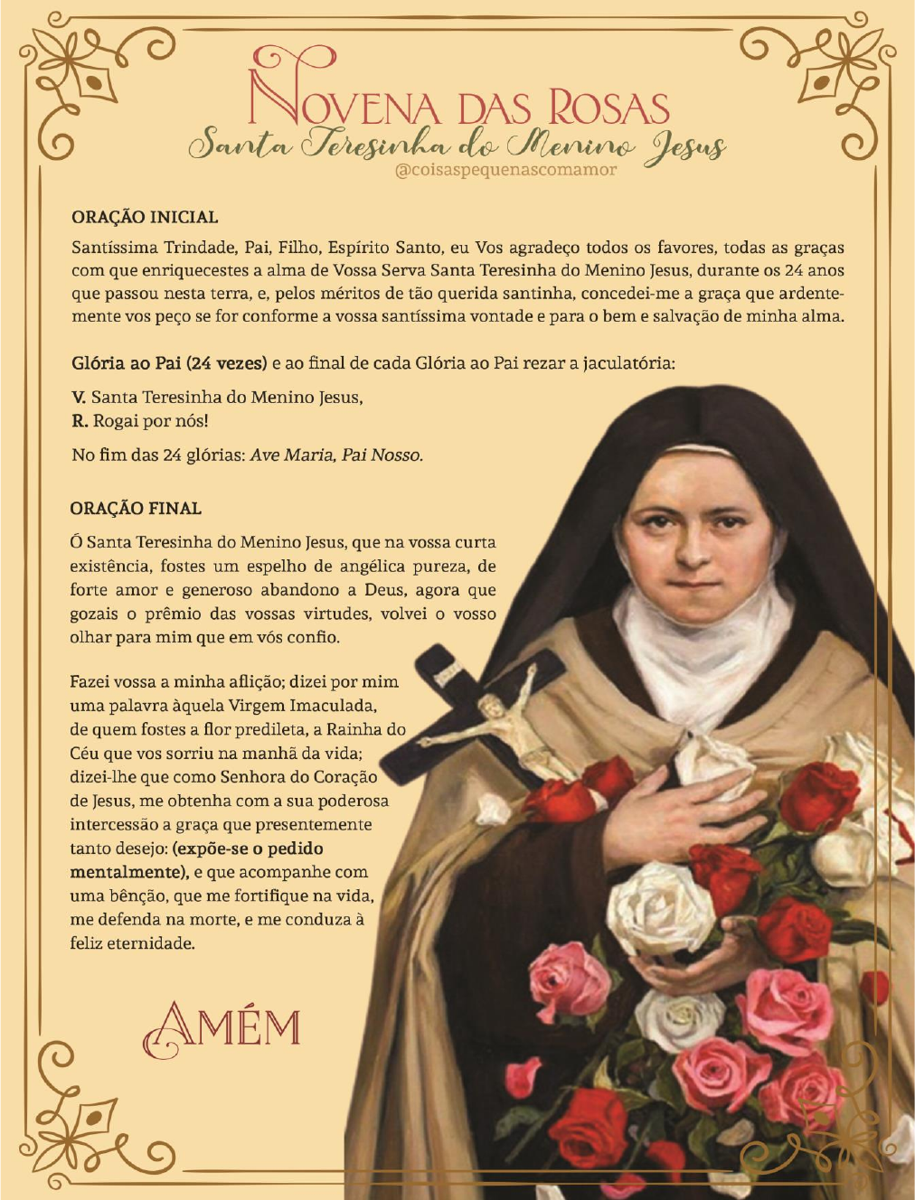 (meditações retiradas do site do padre Paulo Ricardo, se quiser rezar com elas) 1.º DIA — Fé ardente de S. Teresinha Meditação — Compenetrados de humildade, consideremos e admiremos em S. Teresinha do Menino Jesus o dom de misericórdia, concedido por Deus aos nossos dias, nos quais o triunfo da matéria ameaça sufocar e apagar nas almas o sublime dom da fé. Esta santinha viveu uma vida de fé, no pensamento e nas obras, respirou o sobrenatural, alimentou-se de Deus e a Ele ofereceu todas as suas penas interiores, a fim de reparar os pecados de incredulidade cometidos pelos homens. Oração. — Ó S. Teresinha, flor puríssima do Carmelo, dada por Deus às almas para ensinar a todos o caminho certo e rápido do Céu, prostrados diante do vosso altar, abrimos o nosso coração à gratidão para com Deus pelos inúmeros dons que vos concedeu, sobretudo pelo dom da fé, que estabeleceu entre vós e o Céu uma relação contínua de ternura e de amor. Ó pequena esposa de Jesus, ensinai-nos, com o vosso admirável exemplo, as nossas relações para com Deus; lembrai-nos sempre que Ele está sobre nós e conosco por meio da sua santa graça; fazei com que O tenhamos sempre presente, quer na alegria, quer na dor, através do piedoso véu da fé, até que O possamos contemplar, face a face, convosco no pleno meio-dia da visão beatífica. — Pai- nosso, Ave-Maria, Glória. 2.º DIA — Esperança de S. Teresinha Meditação. — Consideremos em S. Teresinha a sublime esperança na misericordiosa bondade de Deus, que nela se efetuava na mais sincera e incondicionada confiança. Com efeito, reconhecendo-se ela pequenina e fraca, quis permanecer sempre tal, entre os braços amorosos de Deus, a fim de ser guiada e levada por Ele, através do caminho da perfeição, ao Céu; na alegria e na dor, na aridez e nas tentações, confiou sempre em Deus, que para ela foi a riqueza da sua pobreza, o sol nas suas trevas, o tudo do seu nada; e o Senhor a levou ao Céu. Oração. — Ó S. Teresinha, pequena filha de Deus, que vivestes de esperança e confiança, apoiando-vos unicamente na palavra infalível e nas promessas indefectíveis de Deus, e sempre esperastes contra todas as esperanças humanas, e sorristes nas penas e nas tentações, ensinai-nos o vosso sublime segredo da felicidade, fazendo-nos viver no esquecimento e na desconfiança de nós mesmos, confiando somente em Deus. Abri sobre todos o Céu, dilatai os horizontes da divina misericórdia sobre todos os pecadores, fazei com que a nossa confiança em Deus nos garanta o seu poderoso auxílio em todas as nossas necessidades, e possamos saborear a vossa inefável alegria e paz abundante. — Pai-nosso, Ave-Maria, Glória. 3.º DIA — Amor de S. Teresinha para com Deus Meditação. — Consideremos outra característica da santidade de Teresinha: o seu grande amor para com Deus. Digna filha da Serafina d’Ávila, ela compreendeu que o amor, assim como é a essência da bem-aventurança eterna, é também a alma e o fastígio da santidade na Terra. Amar a Deus foi para Teresinha o trabalho, a ocupação e a alma do seu espírito. Tudo quanto ela teve, fez vibrar no amor: sua alma, seu coração, seu pensamento, sua palavra, toda a flor do seu ser, foi abrasada pelo amor. Ela soube oferecer e padecer desfolhando aos pés de Deus as rosas da sua caridade até a morte. Oração. — Ó S. Teresinha, hóstia puríssima, imolada ao amor misericordioso de Deus, vós que tudo quanto fostes e possuístes, inflamastes de amor e aniquilastes na voragem da divina caridade. Ó rosa perfumada do Carmelo, ensinai-nos a amar a Deus, concedei- nos as intuições do vosso amor que foi a medida das vossas obras, desvelai-nos o grande segredo de engrandecer as pequeninas ações com o fogo da caridade; fazei com que o amor de Deus seja a única norma das nossas ações e o único título pelo qual nos tornemos dignos da glória eterna. — Pai-nosso, Ave-Maria, Glória. 4.º DIA — Amor de S. Teresinha para com o próximo Meditação. — Consideremos como o amor de Deus em Teresinha foi maravilhoso em seus efeitos de caridade para com o próximo. Quem ama deveras a Deus, ama necessariamente as suas criaturas, as quais, sendo sua viva imagem, são outrossim obras da sua criação, termo da sua Redenção, objeto do seu grande amor. E S. Teresinha amou em seus irmãos a Deus, esquecendo-lhes os defeitos e as culpas; ela não viu nem quis ver no próximo senão a imagem viva de Jesus, por cujo amor proporcionava a todos caridade, compaixão e perdão generoso. Oração. — Ó S. Teresinha, que espalhastes generosamente sobre todos os vossos sorrisos e alegrastes com o vosso amor todos aqueles que vos rodearam sobre a Terra; vós, que no próximo vistes e amastes a Deus, e tanto mais o amastes quanto mais sabíeis que precisava da vossa caridade, concedei-nos a fineza e a doçura do vosso amor para com os nossos irmãos e fazei com que, compadecendo e perdoando as fraquezas do nosso próximo, mereçamos da divina clemência o perdão dos nossos pecados. — Pai- nosso, Ave-Maria, Glória. 5.º DIA — Zelo de S. Teresinha pela salvação das almas Meditação. — Consideremos o ardente zelo que consumiu o espírito de S. Teresinha em desejar a salvação das almas. Atormentada pela sede do Crucificado, Teresinha apaixonou-se para cooperar, com todos os meios que estavam ao seu alcance, com a grande obra da Redenção. E o seu apostolado foi tão prodigioso e admirável, que pôs a serviço da Igreja e em auxílio das almas todas as suas riquezas interiores: suas orações, suas imolações e seus sofrimentos pela conversão dos pecadores. Oração. — Ó S. Teresinha, apóstolo generoso da glória de Deus, que tanto vos apaixonastes pela sede do Coração de Jesus, até sacrificardes a vossa vida pela salvação das almas, fazei com que nós também, santificando-nos a nós mesmos, salvemos, com o nosso exemplo, as almas do nosso próximo e concedei