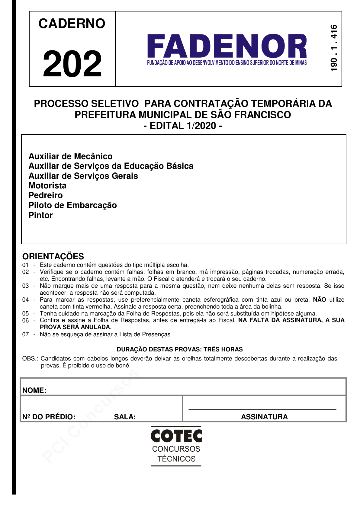 pcimarkpci MjgwNDowMTRkOjMyZDA6ODA2ODowMWVkOjBhOTA6NzZjMzoyYTZl:V2VkLCAxMSBOb3YgMjAyMCAyMzoxNzo0OSAtMDMwMA== PROCESSO SELETIVO PARA CONTRATAÇÃO TEMPORÁRIA DA PREFEITURA MUNICIPAL DE SÃO FRANCISCO - EDITAL 1/2020 - ORIENTAÇÕES 01 - Este caderno contém questões do tipo múltipla escolha. 02 - Verifique se o caderno contém falhas: folhas em branco, má impressão, páginas trocadas, numeração errada, etc. Encontrando falhas, levante a mão. O Fiscal o atenderá e trocará o seu caderno. 03 - Não marque mais de uma resposta para a mesma questão, nem deixe nenhuma delas sem resposta. Se isso acontecer, a resposta não será computada. 04 - Para marcar as respostas, use preferencialmente caneta esferográfica com tinta azul ou preta. NÃO utilize caneta com tinta vermelha. Assinale a resposta certa, preenchendo toda a área da bolinha. 05 - Tenha cuidado na marcação da Folha de Respostas, pois ela não será substituída em hipótese alguma. 06 - Confira e assine a Folha de Respostas, antes de entregá-la ao Fiscal. NA FALTA DA ASSINATURA, A SUA PROVA SERÁ ANULADA. 07 - Não se esqueça de assinar a Lista de Presenças. DURAÇÃO DESTAS PROVAS: TRÊS HORAS OBS.: Candidatos com cabelos longos deverão deixar as orelhas totalmente descobertas durante a realização das provas. É proibido o uso de boné. NOME: Nº DO PRÉDIO: SALA: ASSINATURA CADERNO 202 Auxiliar de Mecânico Auxiliar de Serviços da Educação Básica Auxiliar de Serviços Gerais Motorista Pedreiro Piloto de Embarcação Pintor 19 0 . 1 . 41 6 pcimarkpci MjgwNDowMTRkOjMyZDA6ODA2ODowMWVkOjBhOTA6NzZjMzoyYTZl:V2VkLCAxMSBOb3YgMjAyMCAyMzoxNzo0OSAtMDMwMA== 2 PROVA DE LÍNGUA PORTUGUESA Questões numeradas de 01 a 10 QUESTÃO 01 Leia o fragmento da música “Trem-bala” e, em seguida, responda: Trem - Bala Luan Santana, Ana Vilela Não é sobre ter todas pessoas do mundo pra si É sobre saber que em algum lugar alguém zela por ti É sobre cantar e poder escutar mais do que a própria voz É sobre dançar na chuva de vida que cai sobre nós É saber se sentir infinito Num universo tão vasto e bonito é saber sonhar Então, fazer valer a pena cada verso Daquele poema sobre acreditar [...] A gente não pode ter tudo Qual seria a graça do mundo se fosse assim? Por isso, eu prefiro sorrisos E os presentes que a vida trouxe pra perto de mim. Fonte: LyricFind. Compositores: Ana Carolina Vilela da Costa. Letra de Trem-Bala © Ubc, 2016. No verso “É sobre saber que em algum lugar alguém zela por ti”, a expressão destacada significa que: A) A vida passa depressa e devemos aproveitar cada minuto. B) É importante fazer o bem sem olhar a quem. C) Temos sempre alguém que se preocupa e cuida da gente. D) Devemos dar valor a cada momento da nossa vida. E) Temos que viver o hoje sem pensar no amanhã. QUESTÃO 02 A partir da imagem abaixo, responda: Disponível em:<https://rioclaronews.com.br/noticia/373>. Acesso em: 30 jan. 2020. O assunto principal do texto é A) o mosquito da dengue. B) o combate à dengue. C) água parada e suja. D) lixo, água e natureza. E) cuidados domésticos. pcimarkpci MjgwNDowMTRkOjMyZDA6ODA2ODowMWVkOjBhOTA6NzZjMzoyYTZl:V2VkLCAxMSBOb3YgMjAyMCAyMzoxNzo0OSAtMDMwMA== 3 QUESTÃO 03 Leia a tirinha abaixo. Disponível em: <https://www.google.com./search?sxsrf+ACYBGNS5ylvjQyFIRKrN5O0fCz1vURzw:1582035022267&q=tirinhas+d+bidu&tbm>. Acesso em: 30 jan. 2020. Marque a alternativa que melhor explica o significado da expressão “cachorrada”, utilizada pelo personagem, na tirinha: A) agrupamento de vários cachorros. B) canalhice, sacanagem, maldade. C) bondade, honestidade, nobreza. D) maldade, nobreza, amizade. E) grupo de cachorros malvados. QUESTÃO 04 Todas as palavras estão corretamente acentuadas na alternativa: A) arvore, café, pessego, melância. B) sapáto, flôr, amavel, sabido. C) capacête, árvore, relógio, pipoca. D) passaro, amável, melancia, pessego. E) pássaro, saúde, água, você. QUESTÃO 05 A divisão silábica de todas as palavras está CORRETA na alternativa: A) ma-rin-he-i-ro; páss-a-ro; ca-val-ga-da; ar-ti-lhei-ro; saú-de. B) ma-ri-nhei-ro; páss-a-ro; ca-val-ga-da; ar-ti-lhei-ro; sa-úde. C) mari-nhei-ro; pá-ssa-ro; cav-al-ga-da; arti-lhei-ro; saú-de. D) ma-ri-nhei-ro; pás-sa-ro; ca-val-ga-da; ar-ti-lhei-ro; sa-ú-de. E) ma-ri-nhei-ro; páss-aro; ca-val-ga-da; ar-ti-lheiro; sa-ú-de. QUESTÃO 06 Leia o fragmento da música “Trem-bala” e, em seguida, responda: Alguns verbos são criados a partir de substantivos. Considerando os substantivos “análise”, “aviso” e “pesquisa”, estão CORRETOS os seguintes derivados: A) analisar, avisar, pesquisar. B) analisar, avisar, pesquizar. C) analizar, avizar, pesquisar. D) analisar, avizar, pesquisar. E) analizar, avisar, pesquizar. QUESTÃO 07 Assinale a alternativa em que todos os vocábulos são acentuados por serem oxítonos: A) parabéns, ipê, hífen, saí. B) você, Paraná, lápis, régua. C) paletó, avô, pajé, café, jiló. D) amém, amável, porém, além. E) amigável, avó, pé, agrião. QUESTÃO 08 A palavra “combate” possui: A) 3 sílabas, 7 letras e a sílaba inicial é “com-”. B) 3 sílabas, 8 letras e a sílaba inicial é “co-”. C) 4 sílabas, 7 letras e a sílaba inicial é “com-”. D) 2 sílabas, 8 letras e a sílaba inicial é “comba-”. E) 3 sílabas, 6 letras e a sílaba inicial é “co-”. pcimarkpci MjgwNDowMTRkOjMyZDA6ODA2ODowMWVkOjBhOTA6NzZjMzoyYTZl:V2VkLCAxMSBOb3YgMjAyMCAyMzoxNzo0OSAtMDMwMA== 4 QUESTÃO 09 Assinale a alternativa em que a palavra destacada está de acordo com a ortografia da língua portuguesa. A) Estudar é previlégio de poucos. B) Alguém mecheu na minha mala! C) Bidu sonhava com uma picina térmica. D) Maria, fexe a porta, por favor! E) O sonho da irmã é uma casa com piscina. QUESTÃO 10 Considerando a expressão “Marta e Júlia não são irmãs, mas são semelhantes”, assinale a alternativa que contém o antônimo da palavra destacada: A) Id