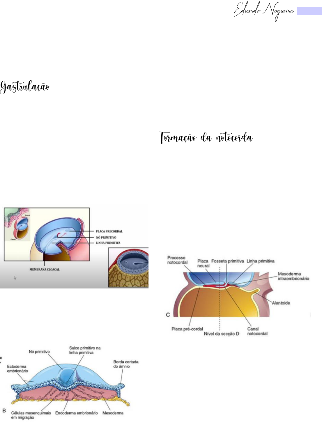 1 Desenvolvimento embrionário Terceira semana → É o processo que se estabelece as três camadas germinativas: ectoderma, mesoderma e endoderma (disco embrionário trilaminar), que dará origem a todos os tecidos e órgãos do embrião futuramente. → A gastrulação começa quando as células do epiblasto começam a migrar em direção ao centro formando a linha primitiva. → Essa linha cresce da região caudal em direção a região cefálica. → Essa linha cresce até uma região chamada nó primitivo. Ao chegarem no centro, essas células sofrem invaginações, descendo em direção ao hipoblasto através do sulco primitivo. → Essas células descem para o hipoblasto e o substituem, dando origem ao endoderma. → Outras células vão se concentrar acima do endoderma, formando o mesoderma. → E o que resta do epiblasto é o ectoderma. → Notocorda é uma estrutura embrionária semelhante a um bastão. → Define o eixo do embrião. → Base do esqueleto axial. → Indica o futuro local das vértebras. → A notocorda surge a partir do processo notocordal, abaixo do nó primitivo, no mesoderma. → O processo notocordal vai crescendo até a placa precordal (membrana orofaríngea), que indica a região cefálica. → Durante o crescimento do processo notocordal, surge um espaço, o canal notocordal, que cresce junto ao processo notocordal. → O canal notocordal divide o processo notocordal em duas partes. → A parte superior está em contato com o ectoderma. 2 → A parte inferior está em contato com o endoderma. → A parte inferior sofre um intenso processo de apoptose, eliminando parte do endoderma. → Sobra apenas a porção superior do processo notocordal, que passa a ser chamada de placa notocordal, que se dobra dando origem a uma estrutura esférica, a notocorda. → A porção do endoderma perdido, se restabelece e volta ao normal. → É o processo de formação do tubo neural, que posteriormente dá origem ao sistema nervoso central do embrião. → O ectoderma acima da notocorda se espessa, formando a placa neural. → A placa neural sofre invaginações formando uma depressão, o sulco neural e ao lado dessas depressões, são formadas elevações, as pregas neurais. → As pregas neurais se fundem, formando o tubo neural, que dará origem ao Sistema Nervoso Central (SNC). → Quando as pregas se fundem, se desprendem da outra parte do ectoderma, e uma parte se desprende junto, que são as cristas neurais, que darão origem ao Sistema Nervoso Periférico (SNP). 3 → O mesoderma se divide em três: mesoderma paraxial, mesoderma intermediário e mesoderma lateral. → O mesoderma paraxial se diferencia em estruturas esféricas chamadas de somitos, que originarão músculos, vértebras e costelas. → Surge por volta do 16º dia. → É uma evaginação no saco vitelino em direção ao pedículo, que conecta o embrião ao saco coriônico. → O alantoide está relacionado com a formação dos vasos sanguíneos umbilicais. → O sistema cardiovascular é composto pelos vasos sanguíneos e o coração. → O surgimento do sistema cardiovascular se inicia com a formação dos vasos para depois surgir o coração. → Os vasos sanguíneos se formam por meio de dois processos, a vasculogênese e a angiogênese. VASCULOGÊNESE – formação dos vasos. ANGIOGÊNESE – ramificação dos vasos. → Na vasculogênese, células mesenquimais (provenientes do mesoderma) se diferenciam em angioblastos. → Os angioblastos se agrupam formando uma ilhota sanguínea. Entre esses grupos surgem cavidades, que serão as cavidades dos vasos sanguíneos. 4 → As células em contato com a cavidade, mudam sua forma e agora são chamadas de células endoteliais, que vão revestir os vasos sanguíneos. → Outros angioblastos, não se transformam em células endoteliais e sim em células troncos hematopoéticas (células que dão origem a células sanguíneas). → A angiogênese é a ramificação dos vasos sanguíneos a partir de um vaso já existente. → O mesoderma embrionário possui uma região chamada de área cardiogênica, que é onde será o local do coração. → Na área cardiogênica, surgem dois tubos cardíacos, chamados de tubos cardíacos endocárdicos, esses tubos se fundem formando o tubo cardíaco primitivo, que é o coração primitivo do embrião, que se unirá a vasos, permitindo uma circulação primitiva.
