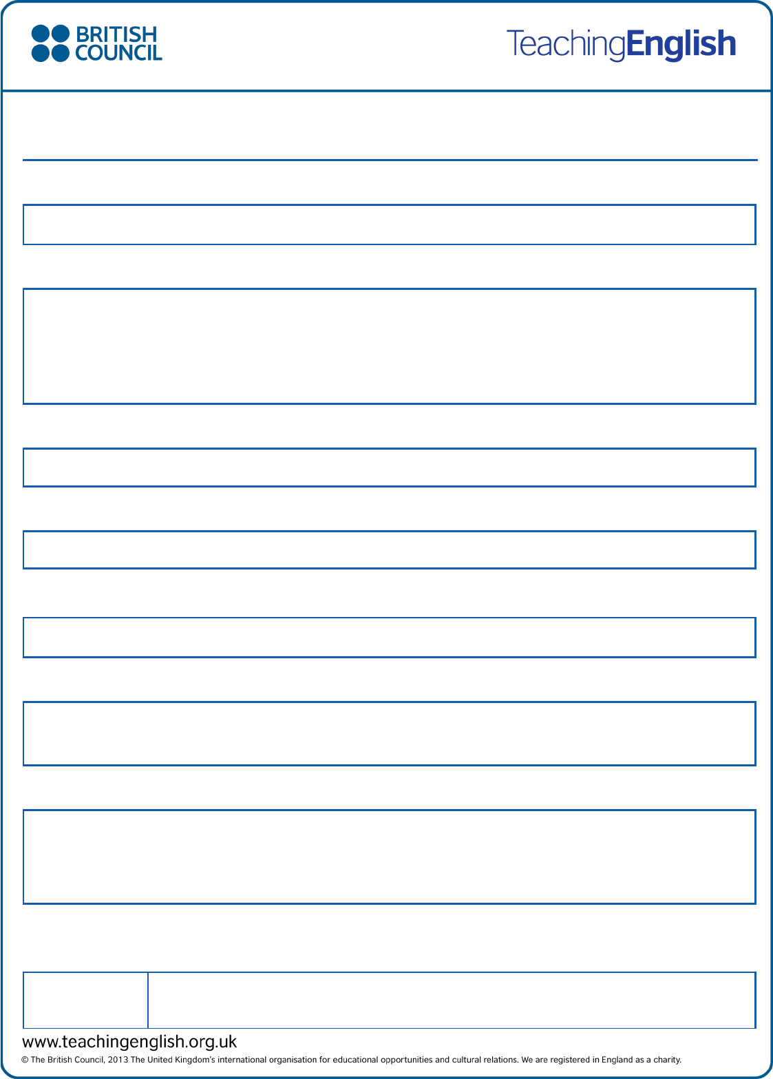Lesson plan Card games Topic Card games Aims • To help learners talk about (and play!) card games • To develop learners’ reading skill • To expand learners’ vocabulary • To develop learners’ writing skills Age group Teens Level A2 Time 60 minutes Materials • Card games student worksheet • A pack of playing cards Introduction What card games do you know? Do you like playing games? In this lesson, students read about how to play a card game called ‘Snap’. They practise expressions for playing games and then have the chance to write instructions for a game. You need at least one pack of playing cards for this lesson. Procedure 1. Lead in: (5 – 10 minutes) • Draw the following diagram on the board and ask the students to tell you the missing word (cards). Give clues if necessary, e.g., ‘You use these to play Lesson plan games with. You play poker with these…’ Clubs King DIamonds Hearts Queen Spades Jack Ace • Show the students a pack of cards. Can they identify the different suits (diamonds, hearts, spades, clubs)? Can they identify the picture cards (ace, King, Queen, Jack)? • Show different cards and say the name, for example ‘The ten of hearts, the ace of spades, etc’. Ask students to tell you the names of different cards and focus on the correct weak form pronunciation of ‘of’ (/əәv/). 2. Task 1: A description of a card game (10 minutes) • Ask students to tell you about any card games that they know. Tell them that they are going to read about a card game called ‘Snap’. Do they know this game? Hand out Task 1 and ask students to do question A in pairs. • Ask students to read the ‘Snap instructions’ text quickly to find the answer to question B. Set a two-minute time limit. Answers Task 1 A: two - players shout ‘Snap!’ when they see two cards with the same number or picture, four - there are four suits, five – up to five people can play Snap Answers Task 1 B: The players have to shout ‘Snap!’ when they see two cards of the same number or picture. 3. Task 2: Vocabulary, play and write (30- 40 • Hand out Task 2. Ask students to look at the ‘Snap instructions’ in Task 1 and match the words in italics in the text with the definitions in Task 2, question A. students can work individually then compare answers in pairs. • Ask students to cover the text before they do question B. They should try to C___ ____ Lesson plan minutes) choose the correct preposition then look back at the text to check their answers. • Students can do question C in pairs then discuss the answers as a class. Ask the students to repeat the expressions after you and focus on intonation by encouraging them to exaggerate the rising and falling (up and down) tone of these expressions and to say them with feeling. • Students play Snap in small groups. Each group needs a pack of cards. Encourage them to read the instructions again and have a practice round before they start playing. You could demonstrate the game to the class first by playing Snap with a small group as the others watch. Help as necessary as students play. Insist on English. Encourage students to say the name of each card, ‘ten of hearts’ etc. as they put the card on the pile to maximise English use. • Invite students to tell you card games (and other games) and make a list on the board. With weaker students you could vote to choose one game and write instructions for that game as a class. A stronger class could write instructions individually or in pairs. Tip: Improvise if you don’t have playing cards. You can use any sets of cards (e.g., flashcards) with matching pictures, words or numbers. Answers Task 2 A: 1 clockwise, 2 face down, 3 face up, 4 shout, 5 shuffle, 6 out, 7 deal, 8 pile, 9 goes first, 10 one at a time Answers Task 2B: 2 on, 3 of, 4 in, 5 at, 6 at Answers Task 2C: 2,3,4,5,6,7,11,13,14 (1- computer, 8 and 9 – a board game, 10 - a console game, 12- football) Contributed by Sally Trowbridge