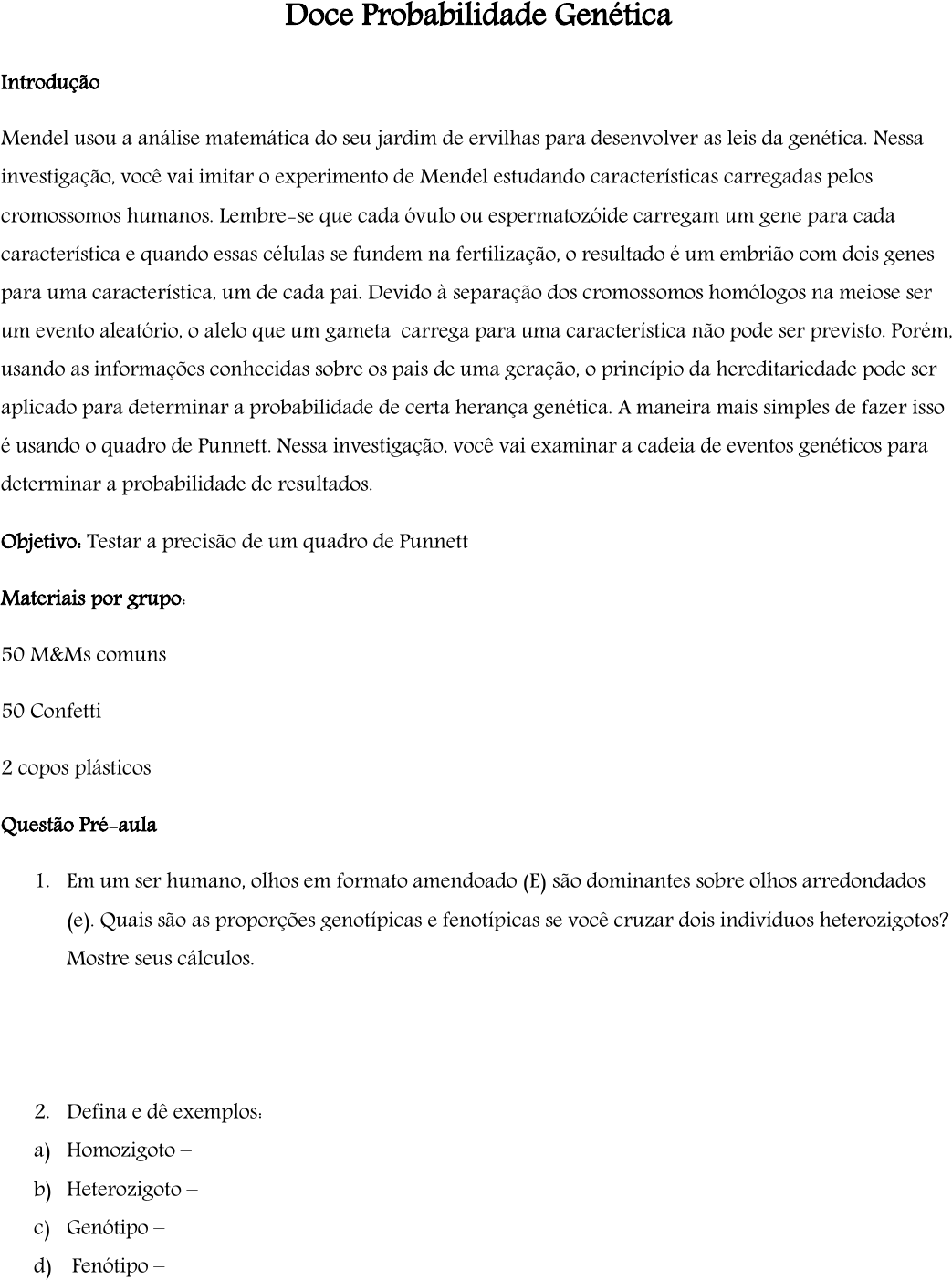 Doce Probabilidade Genética Introdução Mendel usou a análise matemática do seu jardim de ervilhas para desenvolver as leis da genética. Nessa investigação, você vai imitar o experimento de Mendel estudando características carregadas pelos cromossomos humanos. Lembre-se que cada óvulo ou espermatozóide carregam um gene para cada característica e quando essas células se fundem na fertilização, o resultado é um embrião com dois genes para uma característica, um de cada pai. Devido à separação dos cromossomos homólogos na meiose ser um evento aleatório, o alelo que um gameta carrega para uma característica não pode ser previsto. Porém, usando as informações conhecidas sobre os pais de uma geração, o princípio da hereditariedade pode ser aplicado para determinar a probabilidade de certa herança genética. A maneira mais simples de fazer isso é usando o quadro de Punnett. Nessa investigação, você vai examinar a cadeia de eventos genéticos para determinar a probabilidade de resultados. Objetivo: Testar a precisão de um quadro de Punnett Materiais por grupo: 50 M&Ms comuns 50 Confetti 2 copos plásticos Questão Pré-aula 1. Em um ser humano, olhos em formato amendoado (E) são dominantes sobre olhos arredondados (e). Quais são as proporções genotípicas e fenotípicas se você cruzar dois indivíduos heterozigotos? Mostre seus cálculos. 2. Defina e dê exemplos: a) Homozigoto – b) Heterozigoto – c) Genótipo – d) Fenótipo – Procedimento 1.Marque um copo como “macho” e outro como “fêmea”. 2.Coloque 25 m&ms em cada copo e depois acrescente 25 Confetti em cada copo (você deve ter uma mistura de cada tipo de chocolate). Misture os doces nos copos para que fiquem melhor distribuídos. Qual o genótipo do macho?______ Qual o genótipo da fêmea?_______ 3.Escolha um colega para representar o macho e outro a fêmea. De olhos fechados, cada um desses dois tira um doce do copo do outro. Nessa atividade, você terá duas possibilidades: E= olhos amendoados (M&Ms) e= olhos redondos (Confetti) 4.Depois dos dois colegas terem escolhidos os doces, marque na tabela o genótipo formado (Se os dois colegas pegaram M&Ms, você marca EE no primeiro teste). 5.Retorne os doces aos copos originais. 6.Continue repetindo esse processo até completar 25 testes. 7.Quando você terminar de completar seus resultados, adicione seus totais na tabela da turma escrita no quadro e quando ela estiver completa, anote na tabela da turma do relatório. Resultados Tabela de Genótipos (Grupo) Teste EE Ee Ee 1 2 3 4 5 6 7 8 9 10 11 12 13 14 15 16 17 18 19 20 21 22 23 24 25 Total Tabela de Genótipos (Turma) Grupo EE Ee Ee Total % de cada genótipo Análise 1. Por que é importante conduzir um grande número de testes em um experimento? 2. Observe a proporção genotípica do seu quadro de Punnett inicial. Esses foram resultados PREVISTOS. Compare com os resultados da porcentagem do experimento REAL. As porcentagens são as mesmas? Justifique. Blog aulanapratica.wordpress.com