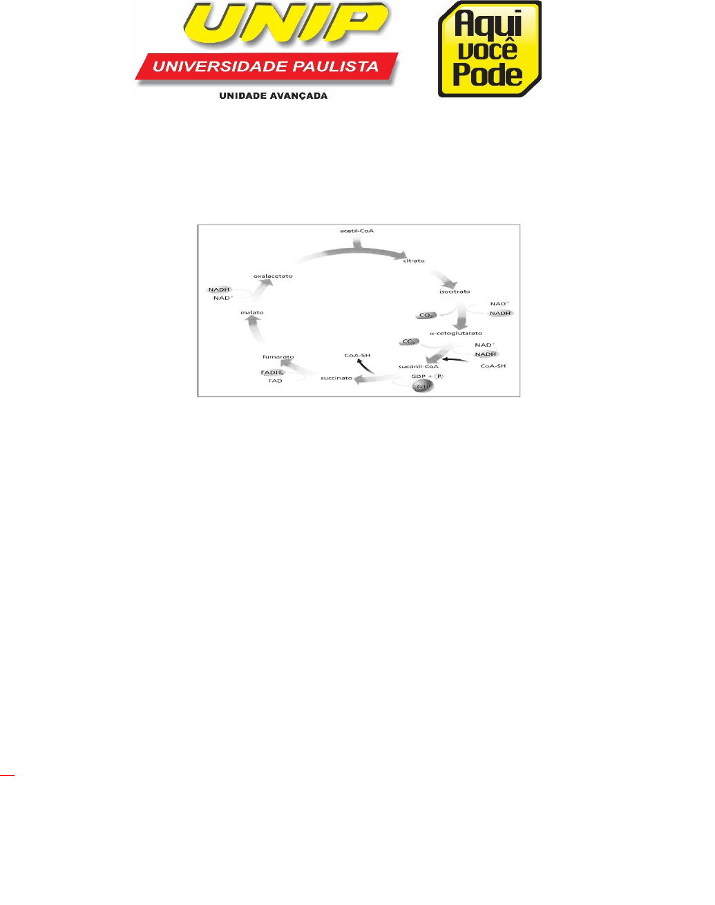 Questões de Bioquímica Professora: Cecília Mota 01- (IFGO/2012) O esquema abaixo apresenta uma das etapas metabólicas da respiração celular. Sobre essa etapa, julgue as afirmativas abaixo: I. Etapa conhecida como Ciclo de Krebs ou Calvin. II. Ocorre somente no interior das mitocôndrias. III. No final dessa etapa são formados: 2 CO2 + 3 NADH + 1 FADH2 + 1 GTP IV. O ciclo tem início com uma reação entre a acetil-CoA (acetilcoenzima A) e o ácido oxalacético (oxalacetato). Assinale a alternativa correta: a) Somente as afirmativas I e II são verdadeiras. b) Somente as afirmativas II e III são verdadeiras. c) Somente as afirmativas III e IV são verdadeiras. d) Somente as afirmativas II, III e IV são verdadeiras. e) Todas as afirmativas são verdadeiras. 02 – (UDESC SC/2008) Assinale a alternativa correta, em relação ao saldo final (rendimento líquido), na produção de ATPs pela Via da Glicólise, Ciclo de Krebs e Cadeia Respiratória, respectivamente. a) 2, 2, 34 b) 2, 4, 32 c) 4, 8, 24 d) 2, 8, 26 e) 4, 4, 30 03) Qual das seguintes afirmativas a respeito da cadeia de transporte de elétrons e fosforilação oxidativa está correta? a) Existem cinco complexos que fazem parte da cadeia de transporte de elétrons. b) O oxigênio é o aceptor final de elétrons. c) O gradiente de prótons não colabora com a formação de ATP. d) Os complexos que fazem parte da cadeia de transporte de elétrons estão inseridos na membrana externa da mitocôndria. 4) A respiração celular é um processo que garante a produção da energia necessária para a sobrevivência dos seres vivos. Analise as alternativas a seguir e marque aquela que não indica uma das etapas da respiração celular. a) Glicólise. b) Fosforilação oxidativa. c) Ciclo de Krebs d) Ciclo de Calvin. 5) A glicólise é uma das etapas da respiração celular, processo responsável pela produção do ATP necessário para o organismo. A respeito da glicólise, marque a alternativa incorreta: a) A glicólise engloba cerca de dez reações químicas diferentes. b) Na glicólise ocorre a quebra da glicose em duas moléculas de ácido pirúvico. c) A glicólise ocorre na matriz mitocondrial. d) O saldo positivo de ATP no final da glicólise é de duas moléculas. 6) O ciclo de Krebs, também chamado de ciclo do ácido cítrico ou ciclo do ácido tricarboxílico, é uma importante etapa da respiração celular. A respeito desse ciclo, marque a alternativa correta: a) O ciclo de Krebs ocorre no interior do complexo golgiense. b) O ciclo de Krebs envolve diversas reações químicas que garantem a oxidação completa da glicose. c) O ciclo de Krebs inicia-se com a reação entre acetil-CoA e ácido oxalacético. d) No final do ciclo de Krebs, a coenzima A não é recuperada. 7) (UFRGS) As células animais para a produção de energia necessitam de oxigênio, enzimas e substrato. Em relação ao processo de produção de energia, considere as afirmações abaixo. I - A fosforilação oxidativa ocorre nas mitocôndrias. II - Na fase aeróbia, ocorre alta produção de ATP. III - A glicólise possui uma fase aeróbia e outra anaeróbia. Quais estão corretas? a) Apenas I. b) Apenas II c) Apenas I e II. d) Apenas II e III. e) I, II e III. 8) A glicólise e o ciclo de Krebs funcionam em nosso corpo como uma encruzilhada metabólica, possibilitando que nossas células convertam algumas moléculas em outras à medida que o nosso corpo tenha necessidade. Em que locais ocorrem a glicólise e o ciclo de Krebs, respectivamente? a) Nos cloroplastos e mitocôndria. b) No citosol e no interior da mitocôndria. c) No retículo endoplasmático e na mitocôndria. d) No interior da mitocôndria. e) No citosol e no cloroplasto. 9) Analisando as alternativas abaixo, marque aquela em que é indicado o local onde acontece o processo de glicólise. a) na mitocôndria. b) no cloroplasto. c) no ribossomo. d) no retículo endoplasmático. e) no citosol. 10) (UEA) A respiração aeróbica pode ser dividida em três fases, denominadas glicólise, ciclo de Krebs e cadeia respiratória. Quanto aos locais da célula onde essas fases ocorrem, pode-se afirmar que: a) A glicólise, o ciclo de Krebs e a cadeia respiratória ocorrem no interior das mitocôndrias. b) Apenas a glicólise e o ciclo de Krebs ocorrem no interior das mitocôndrias. c) Apenas o ciclo de Krebs e a cadeia respiratória ocorrem no interior das mitocôndrias. d) Apenas a glicólise e a cadeia respiratória ocorrem no interior das mitocôndrias. e) Apenas a cadeia respiratória ocorre no interior das mitocôndrias.