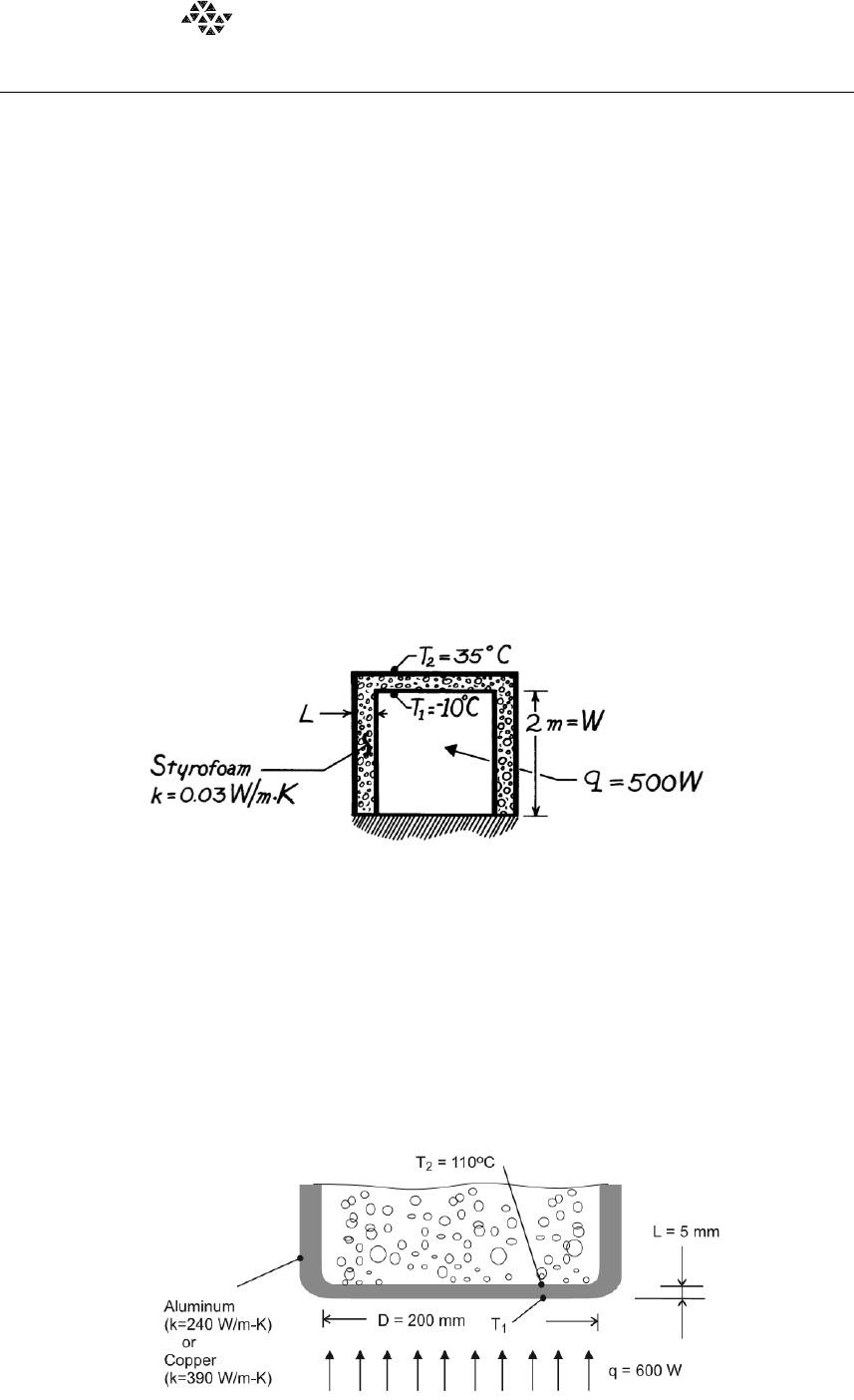 unesp UNIVERSIDADE ESTADUAL PAULISTA “JÚLIO DE MESQUITA FILHO” Campus de Guaratinguetá, Departamento de Energia 1 SISTEMAS TÉRMICOS CAP. 02 – ISOLANTES TÉRMICOS Lista de exercícios 1- Determinar o fluxo de calor perdido por metro de tubulação de aço com 5 mm de espessura, diâmetro externo de 50 mm, revestida com uma camada de lã de vidro com 60 mm de espessura. Esta camada é suportada por uma chapa de alumínio com 4 mm de espessura. A temperatura na parede interna do aço é de 250 oC e na parede externa do alumínio é de 40 oC. Dados: Alumínio: k= 242 W/m.K; Lã de vidro: k= 0,038 W/m.K; Aço: k= 54 W/m.K Resposta: q´= q/L = 40,97 W/m 2- Uma câmara de congelador é um espaço cúbico de lado igual a 2m. Considere que a sua base seja perfeitamente isolada. Qual é a espessura mínima de um isolamento à base de espuma de estireno (k= 0,003 W/m.K) que deve ser usada no topo e nas paredes laterais para garantir uma carga térmica menor que 500W, quando as superfícies interna e externa estiverem a -10 oC e 35 oC? Considerações: (1) base perfeitamente isolada; (2) condução unidimensional através de 5 paredes de área, A = 4 m2; (3) estado estacionário; (4) propriedades constantes. Resposta: L = e = 0,054 m = 54 mm 3- A base, com 5 mm de espessura, de uma panela com diâmetro de 200 mm pode ser feita com Alumínio (k = 240 W/m.K) ou cobre (k = 390 W/m.K). Quando usada para ferver água, a superfície da base exposta à água encontra-se a 110 oC. Se o calor é transferido do fogão para a panela a uma taxa de 600 W, qual é a temperatura da superfície voltada para o fogão para cada um dos dois materiais? Resposta: Para Al: T1 = 110,40 oC ; Para Cu: T1 = 110,25 oC Conclusão: Embora a queda de temperatura no fundo seja um pouco > para o Al (devido < k), ela é suficientemente pequena para ser desprezível para ambos os materiais. Para uma boa aproximação, o fundo pode ser considerado isotérmico a T aproximadamente 110 oC, o que é uma característica desejável para tachos e panelas. unesp UNIVERSIDADE ESTADUAL PAULISTA “JÚLIO DE MESQUITA FILHO” Campus de Guaratinguetá, Departamento de Energia 2 4- Um tubo de diâmetro externo de 300 mm, com a superfície a 90 oC, transporta vapor ao longo de uma distância de 90 m. O tubo está enterrado, com sua linha de centro a uma profundidade de 900 mm; a superfície do solo está a -6 oC, e a condutibilidade térmica média do solo, k, é de 0,6 kcal / h.m.oC. Calcule o calor perdido por dia (q/dia) e o custo (custo/dia), se o vapor vale R$ 0,45 por 250 x 103 kcal. Estime também a espessura de um isolante (eiso), com k = 0,032 BTU / h pé oF, necessária para atingir o mesmo isolamento com um coeficiente global de troca de calor, U = 20 kcal / h m2 oC no lado externo do isolamento. Sabendo que: 𝑈 = 𝑇𝑡𝑢𝑏𝑜−𝑇𝑠𝑜𝑙𝑜 ∑𝑅𝑇𝐴 Resposta: q/dia = 436.230 kcal/dia; Custo/dia = 0,78 R$/dia; eiso = 0,015 m. 5- Um tubo de aço de 2’’ Schedule 40 (De = 2,375’’ e Di = 2,067’’), tem k = 47 W/m.oC. O fluido no interior do tubo tem hi = 170 W/m2 oC, e a superfície externa do tubo é coberta com uma camada isolante de ½” de fibra de vidro. O coeficiente de convecção na superfície externa, he, do isolante é de 11 W/m2.oC. A temperatura do fluido no interior do tubo é de 160 oC e a temperatura ambiente é 20 oC. Calcule a perda de calor por metro, q´= q/L, de tubulação. Dados: Fibra de vidro: k = 0,038 W/m.oC. Resposta: q´= -75,86 W/m 6- As paredes de uma geladeira são tipicamente construídas com uma camada de isolante entre dois painéis de folhas de metal. Considere uma parede feita com isolante de fibra de vidro (ki = 0,046 W/m.K e espessura Li = 50 mm, e painéis de aço, cada um com condutividade térmica kp = 60 W/m.K e espessura Lp = 3 mm. Com a parede separando ar refrigerado a T∞,i = 4oC do ar ambiente a T∞,e = 25oC, determine o ganho de calor por unidade de área superficial. Os coeficientes associados à convecção natural nas superfícies interna e externa podem ser aproximados por hi = he = 5 W/m².K. O que poderia ser feito para diminuir a troca de calor do interior da geladeira com o meio externo? Resposta: q’’= 14,2 W/m2 7- Vapor circula por uma tubulação com 0,12 m de diâmetro, que está isolada termicamente por uma camada de silicato de cálcio de 20 mm de espessura. Se o isolante possui temperaturas das superfícies interna e externa de Ts1 = 800 K e Ts2 = 490 K, respectivamente, qual é a perda de calor por unidade de comprimento da tubulação? Resposta: q/L = 601,9 W/m unesp UNIVERSIDADE ESTADUAL PAULISTA “JÚLIO DE MESQUITA FILHO” Campus de Guaratinguetá, Departamento de Energia 3 EXERCÍCIOS RESOLVIDOS 8- Um tubo de vapor de 50 m de comprimento cujo diâmetro externo é 10 cm está instalado em um espaço aberto a 15 oC. A temperatura média da superfície externa do tubo é de 150 oC. Se o coeficiente de transferência de calor por convecção sobre a superfície externa do tubo é de 20 W/m².K. Determinar: (a) A taxa de perda de calor a partir do tubo de vapor; (b) O custo anual desta perda de energia se o vapor é gerado em um forno a gás natural com uma eficiência de 75% e o preço do gás natural é de R$ 1,50/therm (1 therm = 105500 kJ); (c) A espessura de isolante de fibra de vidro (k = 0,035 W/m.K) necessária para economizar 90% do calor perdido. Considerar que a temperatura da superfície externa do tubo e o coeficiente de transferência de calor por convecção sobre a superfície externa do isolante permaneçam constante como no caso do tubo sem isolamento. Solução: Assume-se transferência de calor em regime permanente, unidimensional (direção radial), sem geração interna de calor e sem resistência térmica de contato entre superfície do tubo e isolante. unesp UNIVERSIDADE ESTADUAL PAULISTA “JÚLIO DE MESQUITA FILHO” Campus de Guaratinguetá, Departamento de Energia 4 c. Para economizar 90% da energ