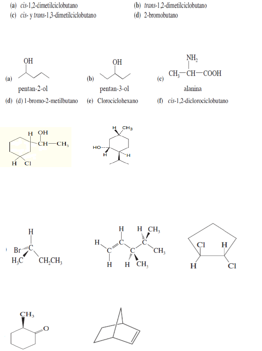 TALLER DE ESTEREOQUIMICA 1. Dibuje la imagen especular de las siguientes estructuras y determine si la imagen especular corresponde al mismo compuesto. Marque cada estructura como quiral o aquiral y marque los pares de enantiómeros 2. En los siguientes compuestos , Marque con un asterisco todos los átomos de carbono asimétricos g) h) 3. Marque con un asterisco los átomos de carbono asimétrico de los siguientes compuestos y determina su configuración (R ) o (S) A. B. C. D. E. 4. Resuelve los siguientes ejercicios a. b. 5. En cada par de compuesto, identifique cuáles son diasterómeros 6. Identifique cuál de los siguientes compuestos son meso 7. Determine si de la reacción de hidratación del 2-penteno se puede obtener una mezcla racémica. En el caso de obtener los enantiómeros correspondientes de la mezcla racémica, diseñe un mecanismo de resolución de esta mezcla racémica.