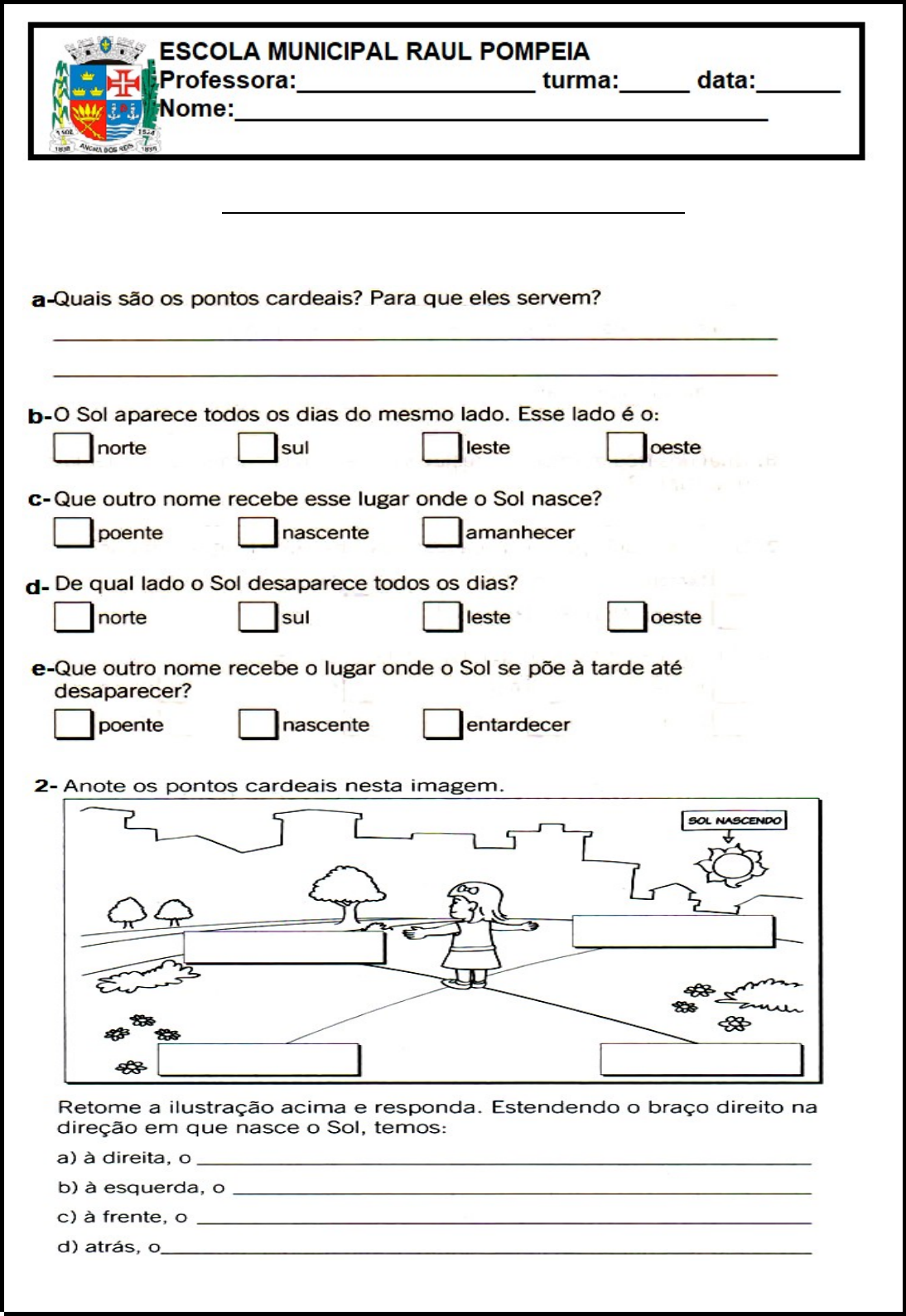 AVALIAÇÃO DE HISTÓRIA E GEOGRAFIA 1- Responda as questões abaixo: 3- Numere os serviços públicos corretamente: 4- Entre os serviços públicos abaixo, marque apenas os que se referem ao Saneamento Básico: ÁGUA TRATADA ENERGIA ELÉTRICA REDE DE ESGOTO HOSPITAL TRANSPORTE PÚBLICO ESCOLA PÚBLICA TELEFONE ARBORIZAÇÃO POSTO POLICIAL PAVIMENTAÇÃO DAS RUAS COLETA DE LIXO POSTO DE SAÚDE ILUMINAÇÃO PÚBLICA COLETA DE LIXO 8- Escreva (V ) para verdadeiro e (F)para falso nas frases abaixo: ( ) Serviço público não é essencial para a população. ( ) O governo não é responsável pelos séricos públicos. ( ) Todas as pessoas têm direito à serviço público de qualidade. ( ) As pessoas não devem zelar pelos serviços públicos. ( ) Os serviços públicos melhoram a qualidade de vida dos habitantes do município. ( ) Os serviços públicos são mantidos com dinheiro da arrecadação de impostos e taxas que os moradores pagam ao governo. 9- Associe corretamente: (P) Periferia (C) Centro da Cidade ( ) Área que em algumas cidades é a mais antiga. ( ) Nesta área podem existir condomínios fechados. ( ) Concentra grande quantidade de edifícios, estabelecimentos comerciais e bancos. ( ) Parte da cidade com trânsito mais calmo. ( ) Área com transito mais intenso e com maior fluxo de pedestres circulando. ( ) Área onde estão localizados os bairros industriais. ( ) Parte da cidade que está crescendo com o surgimento de novas ruas e construções. ( ) Presença de shoppings, centros médicos. ( ) Mais áreas verdes e centros esportivos e de lazer. ( ) Presença de pequenos agricultores e de criação de animais domésticos. ( ) Maior número de escolas particulares. 10- Leia o texto e responda as questões: Abolição da escravatura A decisão de abolir a escravatura não se deu da noite para o dia, levou muitos anos e passou por muitas revoltas. Alguns movimentos como a Inconfidência Mineira e a Conjuração Baiana que tinham como proposta substituir a mão de obra escrava pelo trabalho livre. Mas a estrutura agrária brasileira era contra, e ao invés disso eles queriam intensificar o tráfico de escravos, pois isso garantia mão de obra barata. Em 1.831 foi promulgada a lei que declarava livres os negros que entrassem no Brasil a partir daquela data, mas esta lei nunca foi obedecida. Em 1.850 o tráfico foi proibido, mas isso também foi inútil. Em 1.871 foi aprovada a Lei do Ventre Livre, que declarava livre os filhos dos escravos nascidos a partir daquela data. Esta lei dizia que as crianças tinham que ficar com as mães que eram escravas. Em 1.885 surgiu a Lei dos Sexagenários, que declarava livres os escravos com mais de 60 anos. Em 13 de maio de 1.888 a Princesa Imperial Regente D. Isabel, assinou a Lei Áurea, que abolia a escravidão no Brasil. Isso aconteceu aproximadamente às 15 horas, no Paço da Liberdade. Para assinar a Lei a Princesa utilizou uma caneta de ouro e pedras preciosas, oferecida pelos abolicionistas. Questões a) Em que data foi assinada abolição da escravatura? R.: ___________________________________________________________________________ b) Que nome levou esta lei? R.: ___________________________________________________________________________ c) Quem assinou esta lei? R.: ___________________________________________________________________________ d) Cite alguns movimentos abolicionistas que precederam a abolição da escravatura. R.: ___________________________________________________________________________ ______________________________________________________________________________ e) Que lei foi promulgada em 1.831? Ela foi obedecida? R.: ___________________________________________________________________________ f) Que lei foi assinada em 1.850? R.: ___________________________________________________________________________ g) Quando foi promulgada a Lei do Ventre Livre? R.: ___________________________________________________________________________ h) Explique o que era a Lei do Ventre Livre. R.: ___________________________________________________________________________ ______________________________________________________________________________ i) O que era a Lei dos Sexagenários? E quando ela foi assinada? R.: ___________________________________________________________________________ ______________________________________________________________________________