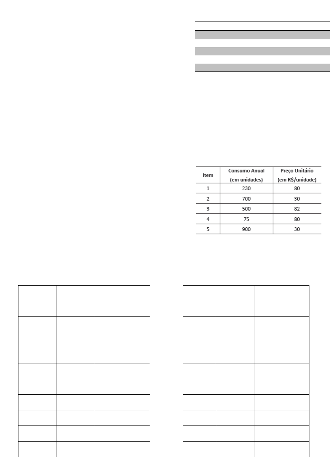PRATICANDO: Classificação ABC 1) Foram levantados os itens de estoque da Fábrica Paulista de Peças Ltda, para poder negociar com os fornecedores reduções de preços, porém isso é urgente e o tempo disponível é pequeno. A direção então solicitou ao gerente de materiais que resolvesse o problema usando a curva ABC. Os dados do estoque estão na tabela ao lado. Construa a tabela com as informações da curva ABC e identifique o material que deverá receber atenção especial e ser negociado primeiramente com o fornecedor. 2) Em qualquer estoque que contenha mais de um item, alguns serão mais importantes para a organização do que outros. Alguns itens, por exemplo, podem ter uma taxa de uso muito alta, de modo que, se faltassem, muitos consumidores ficariam desapontados. Outros podem ter valores particularmente altos, de modo que níveis de estoque excessivos seriam particularmente caros. Uma forma comum de discriminar diferentes itens de estoque é fazer uma lista deles, de acordo com suas movimentações de valor. SLACK, N.; CHAMBERS, S.; JOHNSTON, R. Administração da Produção. 2 ed. São Paulo: Atlas, 2002 (adaptado). O consumo anual e o preço unitário de cada item de determinada empresa estão descritos na tabela a seguir. A empresa quer saber quais são os itens em estoque com maior movimentação de valor para que se tenha maior controle do estoque. Com o auxílio das informações do texto acima, estabeleça a ordem de prioridade de controle dos itens em estoque para essa empresa, apresentando os cálculos efetuados em uma tabela. 3) [Ser feito no excel] Em um estoque, encontramos as seguintes peças com seus respectivos custos unitários, conforme lista a seguir, que deverá ser analisada e ter seus valores de estoques reduzidos. Usando a curva ABC e estipulando os itens segundo as regras de Pareto, classifique-os: Peça Quantidade Valor unitário(R$) Peça Quantidade Valor unitário(R$) Eixo 1 100 25,50 Eixo 2 55 40,00 Polia 1 35 100,00 Coroa 1 15 1500,00 Polia 2 85 500,00 Eixo 3 105 100,00 Polia 3 5 10,00 Suporte 1 10 15,50 Mola 1 1000 1,00 Suporte 2 1000 25,5 Mola 2 35 15,00 Motor 1 100 5000,00 Polia 4 550 125,00 Motor 2 100 3500,00 Painel 1 100 25,50 Eixo 4 33 125,00 Eixo Móvel 10 5,50 Eixo 35 1 10,50 Painel 2 50 12,50 Catraca 21 2,50 Monte as tabelas e o gráfico e explique qual seria sua atuação com relação ao estoque diante dos dados obtidos. Nome Custo/Unid Consumo anual Eixo 20,00 100 Porca 0,50 1000 Parafuso 1,00 100 Polia 10,00 2000 Anel 2,5 1000