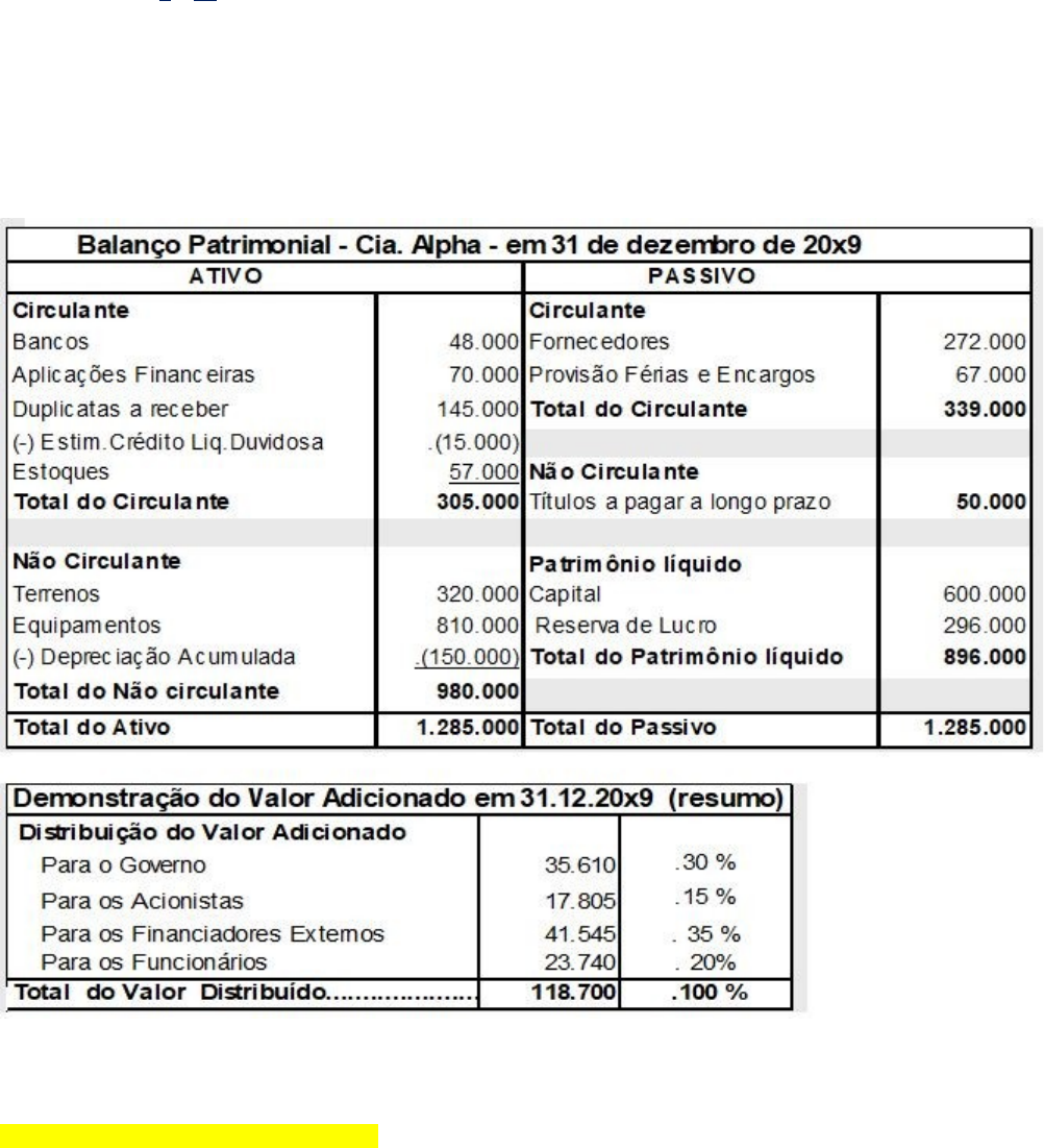 QUESTIONÁRIO CONTABILIDADE FINANCEIRA – UNIDADE II As atividades de 1 a 10 desta aula têm como base o seguinte enunciado: A Cia. Alpha, estabelecida no mercado há mais de duas décadas, sempre atuando no mercado de cosméticos, nacional e internacional, com vários prêmios por excelência, vem passando por momentos difíceis depois do falecimento da sócia-fundadora, “Madame Gaia” (era assim chamada por funcionários, clientes, fornecedores; enfim, todos que direta ou indiretamente ajudaram a construir a Cia. Alpha). Os herdeiros Jorge, Sonia e Israel, em reunião com a controller da empresa, Sra. Sophia, após uma breve leitura, questionam alguns dos saldos apresentados nas demonstrações financeiras: balanço patrimonial e resumo da demonstração do valor adicionado. Pergunta 1 - A Estimativa para Crédito de Liquidação Duvidosa foi estabelecida com qual finalidade? a) Atender a legislação vigente. b) Considerar uma expectativa de perda. c) Liquidar as dívidas com os clientes. d) Cumprir uma rotina contábil. e) Reduzir a tributação. Comentário: A ECLD é constituída em função da expectativa de perdas que a empresa suscita que possam ocorrer em virtude de ter efetuado vendas a prazo (fato gerador contábil) e da possibilidade de nem todos os devedores honrarem seus compromissos. Pergunta 2 - A Sra. Sophia sabe o quanto é importante para a sobrevivência da Cia. Alpha esse primeiro contato com os herdeiros, mesmo com toda dificuldade apresentada de ambos os lados, a controller, explicando da melhor maneira possível a situação da empresa e eles, Jorge, Israel e Sonia, buscando o tempo todo não só o entendimento, como também a necessidade de levar adiante o império construído por “Madame Gaia”. Após algumas leituras sobre as demonstrações financeiras apresentadas em 32.12.x9, uma delas chama mais a atenção de Israel, é a DVA - Demonstração do Valor Adicionado, que traz o seguinte resumo: “distribuição do valor adicionado”, 35% para o Governo, 15% para os acionistas, 30% para os financiadores externos e 20% para os funcionários. Israel pergunta: os funcionários terão direito a 20% do lucro da Cia. Alpha? A Sra. Sophia prontamente responde: a) Sim, conforme está apurado na DVA. b) Sim, desde que expressamente renunciarem ao 13º salário. c) Sim, é o mínimo exigido pela legislação atual. d) Não, valor adicionado é a riqueza gerada e distribuída pela empresa aos respectivos formadores. e) Não, a proporção correta é de 25% para cada agente que de forma direta ou indireta contribui na formação da riqueza do período. Comentário: A demonstração do valor adicionado evidencia a capacidade da empresa de gerar riqueza e como ela é distribuída entre acionistas, financiadores externos, funcionários e governo, ou seja, os agentes que contribuíram com a respectiva formação. Por meio dessa demonstração contábil, é possível apresentar a contribuição de cada empresa proporciona ao país e, consequentemente, a formação do Produto Interno Bruto (PIB). Pergunta 3 - A reunião continua, mesmo com todo interesse da Sra. Sophia em prestar as mais minuciosas explicações e talvez por ser o primeiro momento dos herdeiros tomarem conhecimento sobre o império constituído por “Madame Gaia”, a preocupação dos “meninos” era visível. Agora, os questionamentos são para a folha de pagamento dos empregados. Sonia, filha adotiva de “Madame Gaia”, geralmente, passava as tardes na empresa e seu interesse pelo mundo dos negócios era visível e foi ela quem fez a primeira pergunta, no caso de um empregado ser contratado para receber um salário bruto R$ 2.100,00 por mês, o valor líquido a receber será de? (Considerar dois dependentes e os encargos sociais exigidos pela legislação trabalhista.) a) R$ 1.932,00 b) R$ 1.858,04 c) R$ 1.869,00 d) R$ 1.724,80 e) R$ 1.811,60 Comentário: demonstrativo dos cálculos. ▪ Salário: R$ 2.100,00 ▪ Desconto da Previdência Social, conforme tabela, alíquota de 11% = R$ 2.100,00 x 0,11= R$ 231,00 ▪ Desconto do Imposto de Renda retido na fonte, com dois dependentes, dedução por dependente cada R$ 144,20 = R$ 288,40 Salário - desconto da Previdência Social - dependentes R$ 2.100,00 - R$ 231,00 - R$ 288,40 = base de cálculo = R$ 1.580,60 conforme tabela, alíquota de 7,5% = R$ 1.580,60 x 0,075 = R$ 118,55 - parcela a deduzir de R$ 107,59 = IRRF de R$ 10,96 ▪ Salário líquido = R$ 2.100,00 - R$ 231,00 - R$ 10,96 = R$ 1.858,04 Pergunta 4 - Agora, o questionamento parte de Israel, filho do segundo casamento de “Madame Gaia”: “estou atento às explicações da Sra. Sophia, porém acredito que haja um erro no demonstrativo financeiro chamado ‘balanço patrimonial’, há uma redução nos valores a receber, acredito que essa situação prejudicará o ‘caixa’ da empresa”. A Sra. Sophia apresenta a seguinte explicação sobre o fato ao herdeiro Israel: a) Trata-se de um problema do sistema, vamos resolvê-lo em breve. b) A causa pode ser explicada, houve uma redução na receita de vendas. c) Trata-se de um procedimento utilizado por todas as empresas do nosso ramo de atividade. d) Representa uma possível perda no recebimento das vendas ocorridas, tomando-se como base inadimplências ocorridas no passado. e) Estamos atendendo um benefício fiscal. Comentário: Tomemos como exemplo as contas patrimoniais duplicatas a receber ou clientes. Tais contas representam valores a serem recebidos pela empresa, seja por mercadorias, produtos ou serviços vendidos/prestados a prazo, ou ainda pela venda de qualquer outro direito ou bem vendido a prazo. Ainda que de fato a empresa tenha esses valores a receber, representando, supostamente, ingressos em seu caixa, a prática comercial indica que há a possibilidade de que “dentro” dessa conta clientes inadimplentes estejam presentes. Em outras palavras, é possível que o valor a receber não seja efetivamente recebido de clien