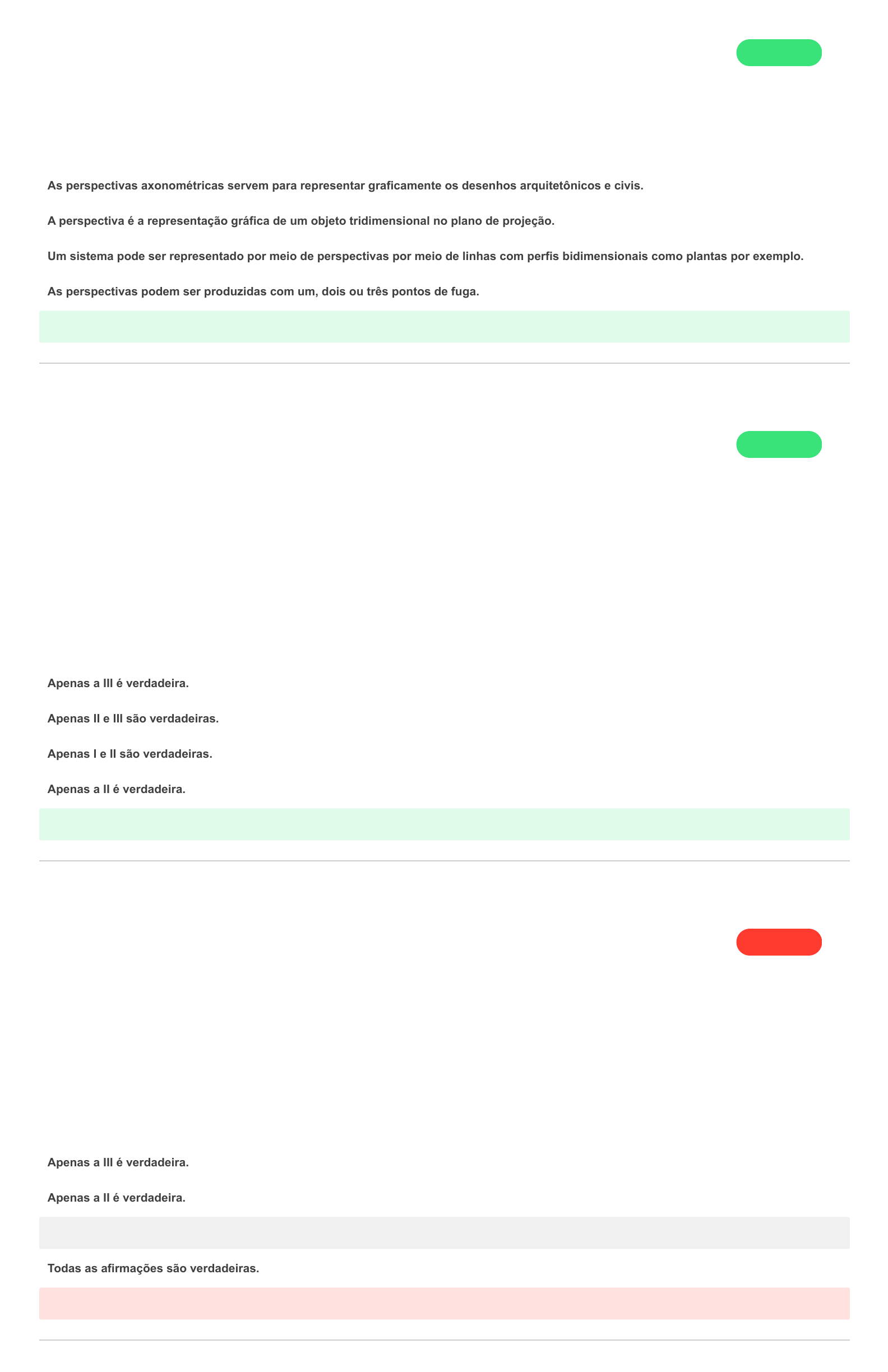 20/11/2020 Ultra https://sereduc.blackboard.com/ultra/courses/_38028_1/outline/assessment/_2802451_1/overview/attempt/_9561422_1/review?courseId=_38028_1 1/4 Ocultar opções de resposta Ocultar opções de resposta Ocultar opções de resposta Pergunta 1 -- /1 Sistemas de representações gráficas são conjuntos de técnicas e modelos de projeção visualizados no espaço como tridimensional, mas que podem ser projetados em um plano bidimensional. Diante disso assinale a alternativa incorreta. As perspectivas axonométricas servem para representar graficamente os desenhos arquitetônicos e civis. A perspectiva é a representação gráfica de um objeto tridimensional no plano de projeção. Um sistema pode ser representado por meio de perspectivas por meio de linhas com perfis bidimensionais como plantas por exemplo. As perspectivas podem ser produzidas com um, dois ou três pontos de fuga. Resposta corretaProjeção axonométrica é aquela em que se pretende representar com rigor um objeto em duas dimensões. Pergunta 2 -- /1 As vistas ortogonais podem ser classificadas em trimétrica, isométrica e dimétrica. Quanto a esse tema podemos afirmar que: I – A trimétrica tem todas as faces contidas em planos oblíquos e plano de projeção; II – A dimétrica tem planos e eixos equidistantes; III - A isométrica tem um coeficiente de redução de profundidade. Apenas a III é verdadeira. Apenas II e III são verdadeiras. Apenas I e II são verdadeiras. Apenas a II é verdadeira. Resposta corretaApenas a I é verdadeira. Pergunta 3 -- /1 As perspectivas podem aparecer de acordo com cada tipo de elemento perspectivo. Em relação a isso é correto afirmar: I – A perspectiva paralela central é chamada de Cavaleira; II – A perspectiva cavaleira ocorre quando há um objeto que gera retas projetantes e que incidem no quadro com uma forma perpendicular; III – A perspectiva denominada Visão de Pássaro é a visão sobre a parte inferior de edificações e de outros objetos. Apenas a III é verdadeira. Apenas a II é verdadeira. Resposta corretaTodas as afirmações são falsas. Todas as afirmações são verdadeiras. Incorreta: Apenas a I é verdadeira. 20/11/2020 Ultra https://sereduc.blackboard.com/ultra/courses/_38028_1/outline/assessment/_2802451_1/overview/attempt/_9561422_1/review?courseId=_38028_1 2/4 Ocultar opções de resposta Ocultar opções de resposta Pergunta 4 -- /1 Além das projeções ortogonais, também temos as projeções oblíquas, as projeções cônicas ou centrais, projeções cilíndricas e paralelas, e projeções cotadas. Sobre isso é correto afirmar: I – Nas projeções oblíquas, há a vista frontal do objeto em verdadeira grandeza, em que, entre a posição dos três eixos x, y e z, tem-se a formação dos ângulos de 90º no primeiro quadrante e de 120º em cada um do segundo e terceiro quadrante. Ela também é conhecida como cavaleira. II – As projeções cônicas diferentemente das oblíquas, não têm somente os ângulos em fuga, mas também o conceito de um ponto em fuga, no qual se concentra a visão em uma determinada profundidade. III – As projeções cotadas tinham por finalidade levantar hidrograficamente o canal da Manchaa, e posteriormente foram bastante utilizadas nas guerras napoleônicas por uso militar. Apenas a II é verdadeira. Apenas I e II são verdadeiras. Resposta corretaApenas II e III são verdadeiras. Apenas a I é verdadeira. Apenas a III é verdadeira. Pergunta 5 -- /1 Sistemas de projeções são formas por meio da geometria descritiva em que você pode interpretar objetos tanto na forma de perspectiva como na de projeções. Existem alguns tipos, dentre eles temos a Projeção Ortogonal. Quanto a esse tipo de Projeções é correto afirmar que: I – Projeção Ortogonal é o tipo mais utilizado na prática. II – Projeção Ortogonal é um tipo de representação com todas as projeções de vistas de forma ortogonal ao lado do objeto. III - Há no máximo seis planos de projeção que podem ser representados por um objeto. Apenas a III é verdadeira. Resposta corretaTodas são verdadeiras. Apenas a I é verdadeira. Apenas a I é verdadeira. Todas são falsas. Pergunta 6 -- /1 Pode-se identificar os vários tipos de perspectivas associadas ao projeto arquitetônico que podem incluir as perspectivas axonométricas, a militar e as que utilizam os pontos fugantes para análise. Quanto a isso pode se afirmar que: I – A perspectiva cônica utiliza um ponto de fuga; 20/11/2020 Ultra https://sereduc.blackboard.com/ultra/courses/_38028_1/outline/assessment/_2802451_1/overview/attempt/_9561422_1/review?courseId=_38028_1 3/4 Ocultar opções de resposta Ocultar opções de resposta Ocultar opções de resposta II - A perspectiva oblíqua utiliza dois pontos de fuga; III – A perspectiva paralela utiliza três pontos de fuga; Apenas I e III são verdadeiras. Apenas a I é verdadeira. Resposta corretaApenas I e II são verdadeiras. Apenas a III é verdadeira. Apenas a II é verdadeira. Pergunta 7 -- /1 No desenho de perspectiva, as principais posições de projeções são: posição do observador, posição do quadro e posição do objeto. Diante disso é correto afirmar: I – A posição do observador pode ter altura diferentes: abaixo, na mesma linha ou acima da linha do horizonte; II – O quadro é a forma de representação que será originada entre o observador e o objeto; III – O objeto poderá estar posicionado em qualquer localização dentro do quadro, em que seja possível enxerga-lo e projetá-lo. Apenas a II é verdadeira. Resposta corretaTodas são verdadeiras. Apenas a I é verdadeira. Apenas II e III são verdadeiras. Apenas a III é verdadeira. Pergunta 8 -- /1 Para identificar os Sistemas de Projeção de Perspectiva, você deve ter em mente o que deseja demonstrar ao público, reconhecendo quem será esse público e como ele as atenderá. Em relação a isso é correto afirmar: I – Para projeções c
