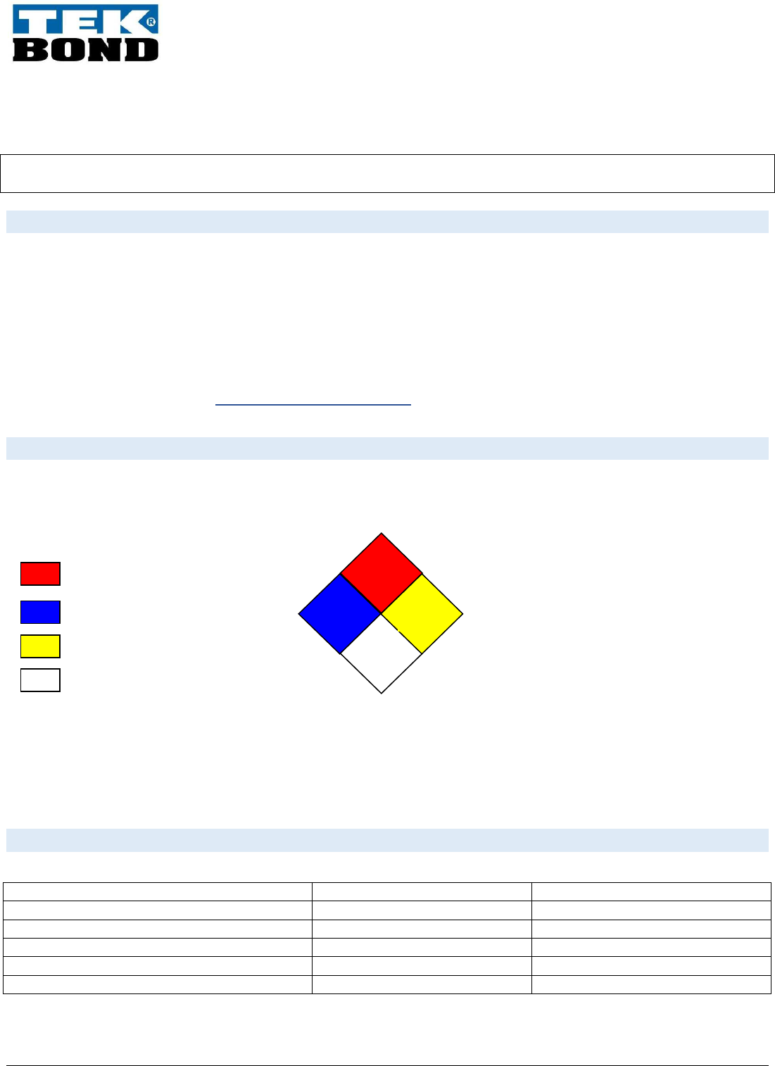 FISPQ – SILICONE ACÉTICO TRANSPARENTE CONSTRUÇÃO FICHA DE INFORMAÇÃO DE SEGURANÇA DE PRODUTOS QUÍMIC OS Esta FISPQ está em conformidade com a NBR 14725 Publicada em: 11/2011 Revisada em: 08/2014 FISPQ: N°: 0043 Página 1 de 6 WWW.TEKBOND.COM.BR 1. IDENTIFICAÇÃO DO PRODUTO E DA EMPRESA Nome do produto: TEKBOND – SILICONE ACÉTICO TRANSPARENTE CONSTRUÇÃO Categoria: Adesivo a base de borracha de silicone para vedação Nome da empresa: ATB Ind. e Com. de Adesivos S/A Endereço: Rua Marcelino Pinto Teixeira, 1268 – Parque Industrial Ramos CEP: 06816-000 - Embu das Artes – SP – Brasil Telefone da Empresa: (11) 4785-6600 Telefone de Emergência: (11) 4785-6600 Fax: (11) 4785-6629 E-mail: laboratorio@tekbond.com.br Internet: www.tekbond.com.br 2. IDENTIFICAÇÃO DE PERIGOS Natureza Química: Produto a base de borracha de silicone 2.1 Classificação da substância ou mistura: Não é Perigoso. 2.2 Elementos de rotulagem: Mantenha fora do alcance das crianças. Mantenha em local fresco e ao abrigo da luz. 2.3 Outros perigos: Pode provocar irritação moderada á pele. Pode provocar irritação ocular. Pode ser nocivo se ingerido e penetrar nas vias respiratórias. 3. COMPOSIÇÃO E INFORMAÇÕES SOBRE OS INGREDIENTES Nome químico ou genérico Faixa de concentração (%) CAS N° Dimetilsiloxano hidróxiterminado 30 – 70 63148-60-7 Óleo de querosene tratado com hidrênio 10 – 30 64742-47-8 Polidimetilsiloxano 5 – 20 63148-62-9 Sílica 5 – 20 7631-86-9 Metiltriacetóxisilano 3 – 8 4253-34-3 0 1 0 Inflamabilidade Riscos à Saúde Reatividade Não misturar com água FISPQ – SILICONE ACÉTICO TRANSPARENTE CONSTRUÇÃO FICHA DE INFORMAÇÃO DE SEGURANÇA DE PRODUTOS QUÍMIC OS Esta FISPQ está em conformidade com a NBR 14725 Publicada em: 11/2011 Revisada em: 08/2014 FISPQ: N°: 0043 Página 2 de 6 WWW.TEKBOND.COM.BR 4. MEDIDAS DE PRIMEIROS SOCORROS 4.1 EM CASO DE INALAÇÃO: Caso sinta indisposição, remova a pessoa para um local ventilado e a mantenha em repouso numa posição que não dificulte a respiração, contate um CENTRO DE INFORMAÇÃO TOXICOLÓGICA. 4.2 EM CASO DE CONTATO COM A PELE: Lave com água e sabão em abundância. 4.3 EM CASO DE CONTATO COM OS OLHOS: Enxágue cuidadosamente com água durante vários minutos. No caso de uso de lentes de contato, remova-as, se for fácil. Continue enxaguando. Caso a irritação ocular persista: consulte um médico. 4.4 EM CASO DE INGESTÃO: Contate imediatamente um CENTRO DE INFORMAÇÃO TOXICOLÓGICA. Procure um médico. NÃO provoque vômito. NOTA PARA OS MÉDICOS: Tratar de acordo com as especificidades do tipo de exposição. Tratar sintomaticamente. 5. MEDIDAS DE COMBATE A INCÊNDIO 5.1 Meios de extinção apropriados: Em caso de incêndio, apagar com extintor de pó químico seco, espuma ou gás carbônico. 5.2 Perigos específicos: Produto não inflamável. Quando aquecido acima de 150°C libera vapores de formaldeído. Em sua combustão podem ser liberados monóxido de carbono (CO); dióxido de carbono (CO2). 5.3 Meio impróprio para extinção: Jato de água. 6. MEDIDAS DE CONTROLE PARA DERRAMAMENTO OU VAZAMEN TO 6.1 Precauções para o pessoal que não faz parte da equipe de emergência: Utilizar equipamentos de proteção necessários, para evitar o risco de contato com as mãos, pele, olhos e vias respiratórias. 6.2 Precauções para o pessoal do serviço de emergên cia: Ventilar bem a área, utilizar luvas de polipropileno, neoprene ou polietileno, máscara para vapores orgânicos, óculos e sapatos de segurança. 6.3 Limpezas: Em caso de derramamentos pequenos, limpar com toalhas de papel e colocar em contâiners para disposição final. Em caso de derramamentos grandes, utilizar material absorvente inerte e colocar em contâiners lacrados, devidamente identificados, para posterior disposição final. Ventilar a área. 6.4 Precauções ao meio ambiente: Evite que o produto atinja o curso de água de rios, córregos, solo / subsolo. Em caso de atingir as águas, solo ou canalizações, comunicar as autoridades responsáveis. 7. MANUSEIO E ARMAZENAMENTO 7.1 Incompatibilidades: Conservar longe de agentes oxidantes. Mantenha o recipiente fechado e armazenar afastado de água e umidade. FISPQ – SILICONE ACÉTICO TRANSPARENTE CONSTRUÇÃO FICHA DE INFORMAÇÃO DE SEGURANÇA DE PRODUTOS QUÍMIC OS Esta FISPQ está em conformidade com a NBR 14725 Publicada em: 11/2011 Revisada em: 08/2014 FISPQ: N°: 0043 Página 3 de 6 WWW.TEKBOND.COM.BR 7.2 Condições de armazenamento: Estocar em temperatura de 5 a 25°C em local fresco e ao abrigo da luz solar. Não reaproveitar as embalagens. 7.3 Manuseio: Utilizar equipamentos de proteção necessários para evitar o risco de contato com as mãos, pele e olhos. Utilizar em local ventilado. 7.4 Precauções contra fogo e explosão: Vapores podem ser formados em locais fechados e misturar-se com ar, conduzindo a explosão na presença de fontes de ignição. Portanto, manter longe de fontes de ignição e não fumar. 8. CONTROLE DE EXPOSIÇÃO E PROTEÇÃO INDIVIDUAL 8.1 Proteção dos olhos/face: Utilizar óculos de segurança. 8.2 Proteção da pele e mãos: Utilizar avental plástico, sapatos de segurança, luvas de polietileno ou polipropileno ou neoprene. 8.3 Proteção respiratória: Em caso de ventilação insuficiente, utilizar máscara para vapores orgânicos. Manusear em local arejado e ventilado. 8.4 Medidas Gerais: Evitar contato com os olhos e com pele. Não fumar, comer, nem beber durante o trabalho. Tirar imediatamente a roupa suja ou embebida com produto. Lavar as mãos antes de pausas e no final do trabalho. Proteção preventiva através do uso de creme a pele. 9. PROPRIEDADES FÍSICAS E QUÍMICAS 9.1 Aspecto: Pastoso incolor 9.2 Odor: Característico de ácido acético (vinagre) pungente 9.3 pH: N/A 9.4 Ponto de fusão / ponto de congelamento: N/D 9.5 Ponto de ebulição: N/A 9.6 Ponto de fulgor: N/D 9.7 Pressão de vapor: N/A 9.8 Densidade relati
