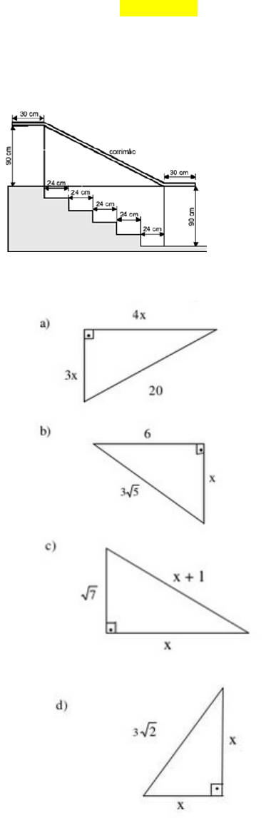 Universidade Candido Mendes Campus Bangu - Noite Disciplina: Matemática Básica Prof. Victor Lyra Trabalho para avaliação – P2 Observações: 1) Todos os cálculos deverão constar na resolução; 2) A entrega deverá ser feita em arquivo PDF. 3) Data da entrega: 26/06/2020 Questões: 1) O esquema abaixo representa o projeto de uma escada de 5 degraus com mesma altura. De acordo com os dados da figura, qual é o comprimento de todo o corrimão? 2) Nas figuras abaixo, determine o valor de x: 3) Num triângulo retângulo, um dos catetos mede 24 cm e a sua projeção sobre a hipotenusa mede 14,4 cm. Determine: a) a medida da hipotenusa b) a medida do outro cateto c) a medida da altura relativa à hipotenusa. 4) Em um mapa, as cidades A, B e C são os vértices de um triângulo retângulo e o ângulo reto está em A. A estrada AB tem 80 km e a estrada BC tem 100 km. Um rio impede a construção de uma estrada que ligue diretamente a cidade A com a cidade C. Por esse motivo, projetou-se uma estrada saindo de A e perpendicular à estrada BC, para que ela seja a mais curta possível. Qual será o comprimento da estrada que será construída? 5) (Uel) Trafegando num trecho plano e reto de uma estrada, um ciclista observa uma torre. No instante em que o ângulo entre a estrada e a linha de visão do ciclista é 60°, o marcador de quilometragem da bicicleta acusa 103,50 km. Quando o ângulo descrito passa a ser 90°, o marcador de quilometragem acusa 104,03 km. Qual é, aproximadamente, a distância da torre à estrada? (Se necessitar, use 2 1,41; 3 1,73; 6 2,42)= = = 6) (Unirio) Um disco voador é avistado, numa região plana, a uma certa altitude, parado no ar. Em certo instante, algo se desprende da nave e cai em queda livre, conforme mostra a figura. A que altitude se encontra esse disco voador? 7) (Ufes) Um homem de 1,80m de altura avista o topo de um edifício sob um ângulo de 45° em relação à horizontal. Quando ele se aproxima 20m do edifício, esse ângulo aumenta para 60°. Qual a altura do edifício? 8) (Uerj) Observe a bicicleta e a tabela trigonométrica. Os centros das rodas estão a uma distância PQ igual a 120 cm e os raios PA e QB medem, respectivamente, 25 cm e 52 cm. De acordo com a tabela, qual o valor do ângulo AÔP? 9) Um topógrafo pretende medir a distância entre dois pontos (A e B) situados em margens opostas de um rio. Para isso, ele escolheu um ponto C na margem em que está, e mediu os ângulos AĈB e CÂB, encontrando, respectivamente, 45° e 75°. Determine AB̅̅ ̅̅ , sabendo que AC̅̅̅̅ mede 16 m. (Utilize √2 ≅ 1,4). 10) Sabendo que em um triângulo qualquer seus lados medem respectivamente 3, 5 e 7 , qual o valor do cosseno do ângulo C deste triângulo? 11) No triângulo da figura, x = 30º, y = 15º e AC mede 215 . Calcule o lado BC. 12) No triângulo da figura abaixo, determine a medida a. (A) 2 (B) 2 2 (C) 7 (D) 31 (E) 10