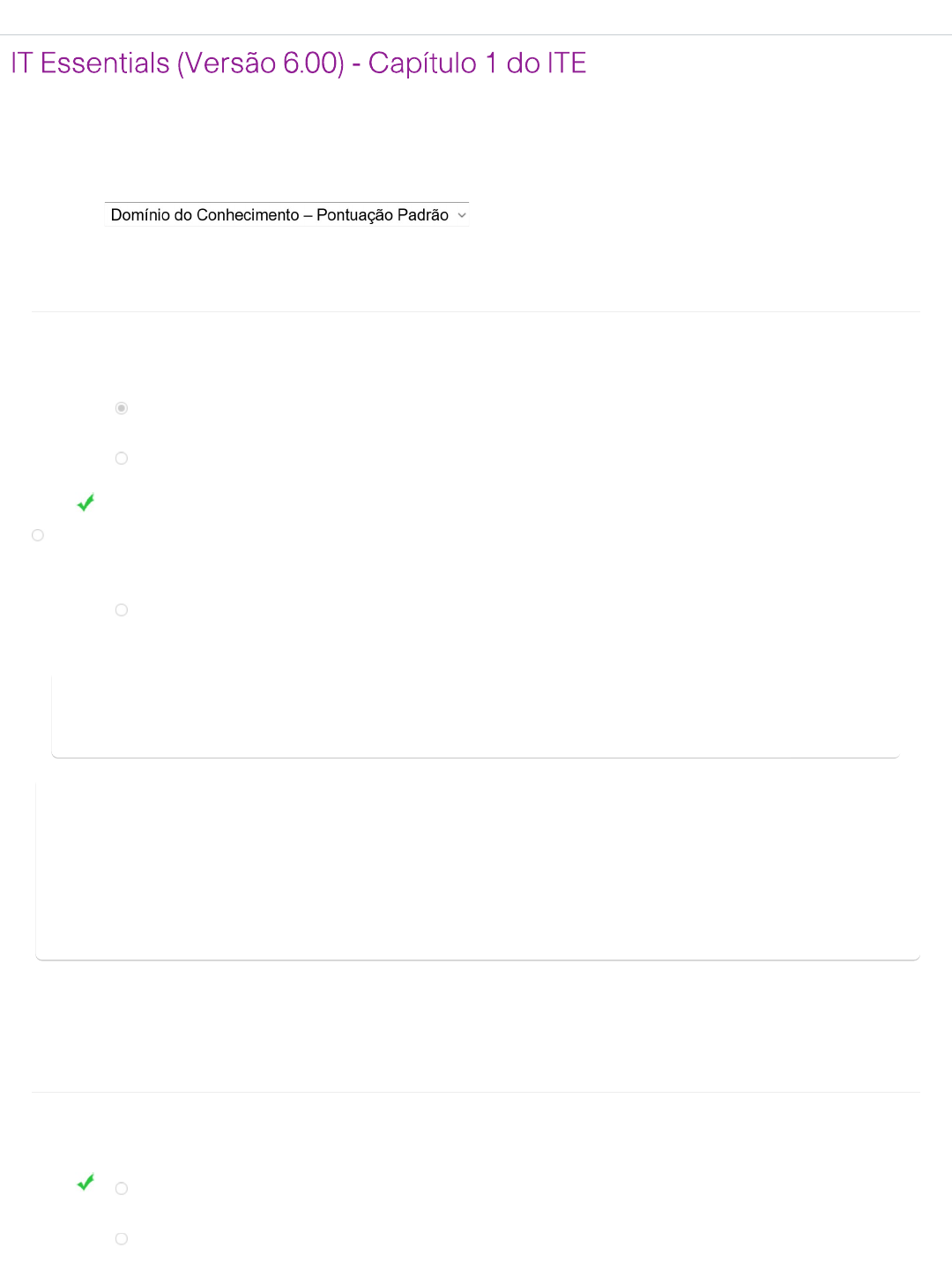 Resultados da avaliação / Relatório de comentários por item Abaixo você encontra o relatório de comentários por item para aqueles itens pelos quais você não recebeu crédito. Alguns itens interativos podem não exibir a sua resposta. Subtotal: Esse item faz referência ao conteúdo das seguintes áreas: IT Essentials 1.1.1 Gabinetes e Fontes de Alimentação 4 Qual característica de eletricidade é expressa em watts? Correta Resposta Sua Resposta a quantidade de elétrons que passam por um circuito por segundo a quantidade de trabalho necessária para mover os elétrons em um circuito o trabalho necessário para mover os elétrons em um circuito multiplicado pelo número de elétrons que passam por um circuito por segundo a resistência ao fluxo de corrente em um circuito Watts é a unidade usada para medir a potência elétrica. Potência se refere ao trabalho necessário para mover os elétrons em um circuito multiplicado pelo número de elétrons que passam por um circuito por segundo. 5 Que tipo de memória é usada principalmente como memória cache? Correta Resposta Sua Resposta SRAM ROM Relatório de comentários por item https://assessment.netacad.net/virtuoso/delivery/pub-doc/2.0/item_level_... 1 of 10 24/10/2020 10:07 Esse item faz referência ao conteúdo das seguintes áreas: IT Essentials 1.1.2 Componentes Internos do PC Esse item faz referência ao conteúdo das seguintes áreas: IT Essentials 1.1.2 Componentes Internos do PC DRAM RAM 8 Quais são as duas atividades que normalmente são controladas pelo chipset Northbridge? (Escolha duas.) Correta Resposta Sua Resposta acesso à placa de vídeo comunicação entre a CPU e as portas de I/O comunicação entre a CPU e o disco rígido comunicação entre a CPU e a placa de som acesso à memória RAM O chipset Northbridge geralmente controla o acesso à memória RAM, placa de vídeo e a velocidade em que a CPU pode se comunicar com eles. 12 O que é indicado pelo contraste de um monitor? Relatório de comentários por item https://assessment.netacad.net/virtuoso/delivery/pub-doc/2.0/item_level_... 2 of 10 24/10/2020 10:07 Esse item faz referência ao conteúdo das seguintes áreas: IT Essentials 1.1.4 Dispositivos de Entrada e Saída Correta Resposta Sua Resposta a diferença na intensidade da luz entre o branco mais brilhante e o preto mais escuro que pode ser exibida o número total de pixels que compõem a imagem a frequência com a qual a imagem de é atualizada a interface das áreas de visualização horizontais e verticais do monitor O contraste é um dos muitos fatores usados para descrever a resolução de um monitor. O contraste é uma medida da diferença de intensidade entre as áreas brancas e pretas da imagem. Um contraste mais elevado significa que o monitor pode produzir imagens com um branco mais claro e com um preto mais escuro. 15 Qual termo é usado para definir os fios que movem dados na placa- mãe de uma parte do computador para outra? Correta Resposta Sua Resposta chipset bridge barramento (bus) Placa de I/O Os dados são transportados na placa-mãe em um conjunto de fios conhecidos como barramento. Os barramentos têm duas finalidades: (1) transportar dados entre os componentes do computador e (2) transportar os endereços de memória de onde os dados são lidos e gravados pela CPU. Relatório de comentários por item https://assessment.netacad.net/virtuoso/delivery/pub-doc/2.0/item_level_... 3 of 10 24/10/2020 10:07 Esse item faz referência ao conteúdo das seguintes áreas: IT Essentials 1.2.1 Selecionar Componentes do PC Esse item faz referência ao conteúdo das seguintes áreas: IT Essentials 1.2.1 Selecionar Componentes do PC 17 Qual a função da fonte de alimentação? Correta Resposta Sua Resposta converter a energia DC em uma tensão AC menor converter a energia AC em uma tensão DC menor converter a energia AC em uma tensão DC maior converter a energia DC em uma tensão AC maior A fonte de alimentação converte a energia de corrente alternada (AC) proveniente de uma tomada de parede em energia de corrente contínua (DC), com uma menor tensão. A corrente contínua é necessária para todos os componentes dentro do computador. 23 Qual recurso de segurança nas CPUs modernas protege as áreas de memória que contêm parte do sistema operacional de ataques de malware? Correta Resposta Sua Resposta criptografia Relatório de comentários por item https://assessment.netacad.net/virtuoso/delivery/pub-doc/2.0/item_level_... 4 of 10 24/10/2020 10:07 Esse item faz referência ao conteúdo das seguintes áreas: IT Essentials 1.1.2 Componentes Internos do PC 24 Pergunta como apresentada: TPM LoJack bit para desativar a execução A opção desativar a execução pode ser ligada, se o recurso for suportado pelo sistema operacional, para evitar que código mal-intencionado seja executado dentro de uma área específica da memória que contém arquivos do sistema operacional. Arraste a descrição na esquerda para o nível de RAID na direita. desempenho mais alto espelhamento de disco combinação de paridade e distribuição de dados distribuição de dados sem redundância capacidade de recriar os dados com informações de outras unidades alto desempenho e alta proteção devido a todos os dados estarem duplicados RAID 0 Relatório de comentários por item https://assessment.netacad.net/virtuoso/delivery/pub-doc/2.0/item_level_... 5 of 10 24/10/2020 10:07 Esse item faz referência ao conteúdo das seguintes áreas: IT Essentials 1.1.2 Componentes Internos do PC Sua resposta: undefined RAID 1 undefined undefined RAID 5 undefined undefined Arraste a descrição na esquerda para o nível de RAID na direita. desempenho mais alto espelhamento de disco combinação de paridade e distribuição de dados Relatório de comentários por item https://assessment.netacad.net/virtuoso/delivery/pub-doc/2.0/item_level_... 6 of 10 24/10/2020 10:07 distribuição de dados sem redundância capacidade de recri