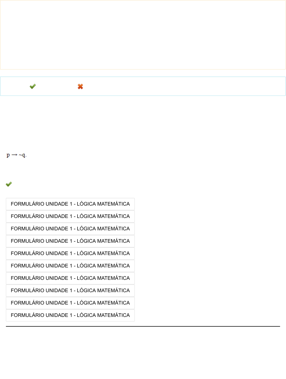 Acadêmico: Jorge Rosario de Carvalho (2664990) Disciplina: Lógica Matemática (MAT23) Avaliação: Avaliação I - Individual FLEX ( Cod.:649872) ( peso.:1,50) Prova: 25915359 Nota da Prova: 7,00 Legenda: Resposta Certa Sua Resposta Errada 1. Uma proposição é um termo lógico que pode aferir dois valores (de forma exclusiva): Verdadeiro ou Falso. Visto isto, sejam as proposições p: Está claro q: Está seco. Assinale a alternativa CORRETA que traduz para a linguagem corrente a proposição composta: a) Se está claro, então não está molhado. b) Se está claro, então está seco. c) Se está escuro, então está molhado. d) Se está claro, então está molhado. Anexos: FORMULÁRIO UNIDADE 1 - LÓGICA MATEMÁTICA FORMULÁRIO UNIDADE 1 - LÓGICA MATEMÁTICA FORMULÁRIO UNIDADE 1 - LÓGICA MATEMÁTICA FORMULÁRIO UNIDADE 1 - LÓGICA MATEMÁTICA FORMULÁRIO UNIDADE 1 - LÓGICA MATEMÁTICA FORMULÁRIO UNIDADE 1 - LÓGICA MATEMÁTICA FORMULÁRIO UNIDADE 1 - LÓGICA MATEMÁTICA FORMULÁRIO UNIDADE 1 - LÓGICA MATEMÁTICA FORMULÁRIO UNIDADE 1 - LÓGICA MATEMÁTICA FORMULÁRIO UNIDADE 1 - LÓGICA MATEMÁTICA https://portaldoalunoead.uniasselvi.com.br/extranet/layout/request/imag_prova_ead_anexo_n2.php?action1=MjU5MTUzNTk=&action2=NjM0NjA4 https://portaldoalunoead.uniasselvi.com.br/extranet/layout/request/imag_prova_ead_anexo_n2.php?action1=MjU5MTUzNTk=&action2=NjM0NjA4 https://portaldoalunoead.uniasselvi.com.br/extranet/layout/request/imag_prova_ead_anexo_n2.php?action1=MjU5MTUzNTk=&action2=NjM0NjA4 https://portaldoalunoead.uniasselvi.com.br/extranet/layout/request/imag_prova_ead_anexo_n2.php?action1=MjU5MTUzNTk=&action2=NjM0NjA4 https://portaldoalunoead.uniasselvi.com.br/extranet/layout/request/imag_prova_ead_anexo_n2.php?action1=MjU5MTUzNTk=&action2=NjM0NjA4 https://portaldoalunoead.uniasselvi.com.br/extranet/layout/request/imag_prova_ead_anexo_n2.php?action1=MjU5MTUzNTk=&action2=NjM0NjA4 https://portaldoalunoead.uniasselvi.com.br/extranet/layout/request/imag_prova_ead_anexo_n2.php?action1=MjU5MTUzNTk=&action2=NjM0NjA4 https://portaldoalunoead.uniasselvi.com.br/extranet/layout/request/imag_prova_ead_anexo_n2.php?action1=MjU5MTUzNTk=&action2=NjM0NjA4 https://portaldoalunoead.uniasselvi.com.br/extranet/layout/request/imag_prova_ead_anexo_n2.php?action1=MjU5MTUzNTk=&action2=NjM0NjA4 https://portaldoalunoead.uniasselvi.com.br/extranet/layout/request/imag_prova_ead_anexo_n2.php?action1=MjU5MTUzNTk=&action2=NjM0NjA4 2. Ao desenvolver o conhecimento de representação por meio simbólico de um argumento, aprendemos alguns conectivos, os quais realizam as ligações entre as proposições envolvidas. A negação é uma operação unário, que quando aplicada, produz o valor falso de uma proposição. É necessário ter cuidado ao realizar a negação de argumentos que utilizam como ligação a conjunção e a disjunção (inclusiva ou exclusiva). Com relação a esta observação, a equivalência lógica proposicional, a negação da frase "Cris fez exercícios e Paola não pratica esportes", é: a) Cris fez exercícios ou Paola pratica esportes. b) Cris não fez exercícios ou Paola pratica esportes. c) Cris não fez exercícios ou Paola não pratica esportes. d) Cris não fez exercícios e Paola não pratica esportes. Anexos: FORMULÁRIO UNIDADE 1 - LÓGICA MATEMÁTICA 3. Uma proposição pode ser definida como todo grupo de palavras ou símbolos que compõem uma ideia com sentido total e se expressam por meio de orações. Elas podem ser classificadas de duas formas diferentes: proposição lógica simples ou proposição lógica composta. As simples são representadas de forma única, enquanto as proposições compostas são representadas por um conjunto de proposições simples que são ligadas pelos chamados "conectivos lógicos". Sobre as frases que apresentam proposições, analise as sentenças a seguir: I- O livro está sobre a mesa. II- O cubo possui oito faces. III- Você pode vir até aqui? IV- O vestido é preto porque Amélia assim o encomendou. Assinale a alternativa CORRETA: a) As sentenças I, II e IV estão corretas. b) Somente a sentença III está correta. c) As sentenças II e III estão corretas. d) As sentenças I e IV estão corretas. Anexos: FORMULÁRIO UNIDADE 1 - LÓGICA MATEMÁTICA FORMULÁRIO UNIDADE 1 - LÓGICA MATEMÁTICA 4. Fazer a tradução da linguagem natural de proposições para a linguagem simbólica, requer o conhecimento dos operadores lógicos (conectivos) presentes em cada situação, para que se possa fazer a utilização correta em cada proposição. Sobre as proposições que apresentam somente o conectivo condicional, analise as sentenças a seguir: I- Leonardo é catarinense ou gaúcho. II- Não é verdade que Paola é bonita. III- Se Cris é bonita, então sou linda. IV- Ana foi ao shopping, contudo seu amigo Luiz foi a praia. Assinale a alternativa CORRETA: a) Somente a sentença II está correta. b) Somente a sentença III está correta. c) As sentenças I e III estão corretas. d) As sentenças II e IV estão corretas. https://portaldoalunoead.uniasselvi.com.br/extranet/layout/request/imag_prova_ead_anexo_n2.php?action1=MjU5MTUzNTk=&action2=NjM0NjA4 https://portaldoalunoead.uniasselvi.com.br/extranet/layout/request/imag_prova_ead_anexo_n2.php?action1=MjU5MTUzNTk=&action2=NjM0NjA4 https://portaldoalunoead.uniasselvi.com.br/extranet/layout/request/imag_prova_ead_anexo_n2.php?action1=MjU5MTUzNTk=&action2=NjM0NjA4 Anexos: FORMULÁRIO UNIDADE 1 - LÓGICA MATEMÁTICA FORMULÁRIO UNIDADE 1 - LÓGICA MATEMÁTICA FORMULÁRIO UNIDADE 1 - LÓGICA MATEMÁTICA 5. É intuitivo perceber ou estabelecer que, para duas proposições que são logicamente equivalentes, esta equivalência na prática torna uma proposição qualquer em uma maneira diferente de apresentar o mesmo dizer. Acerca do exposto, qual das opções apresenta a equivalência para a negação da proposição a seguir? "Se sou inteligente então conseguirei responder esta questão" a) Se sou