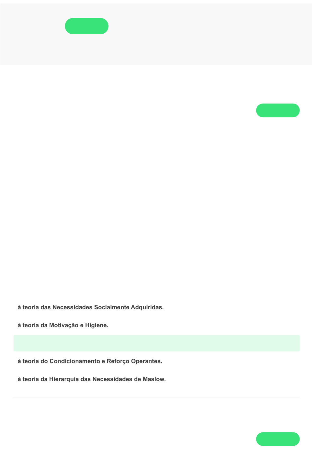 Ocultar opções de resposta Pergunta 1 -- /1 Leia o trecho a seguir: “Para que os profissionais se sentissem livres para sonhar com o impossível, Jack Welch sabia que era necessário remover todos os obstáculos que atrapalham o desempenho na maioria das organizações. A GE não era exceção e, por isso mesmo, ele criou a estratégia ‘sem limites’. Seu objetivo era eliminar os empecilhos que mantinham os colaboradores separados das ideias, dos colegas e de tudo mais que encontrasse pelo caminho.” Fonte: KRAMES, Jeffrey A. Os princípios de liderança de Jack Welch. Rio de janeiro: Sextante, 2006. Dentre todas as teorias de motivação estudadas, uma delas prevê, em seu contexto, um papel importante da liderança acerca do direcionamento de sua equipe aos frutos de seu trabalho. Considerando essas informações e o conteúdo estudado, a teoria descrita acima se refere: à teoria das Necessidades Socialmente Adquiridas. à teoria da Motivação e Higiene. Resposta corretaà teoria da Motivação Caminho-Meta. à teoria do Condicionamento e Reforço Operantes. à teoria da Hierarquia das Necessidades de Maslow. Pergunta 2 -- /1 10/10 Nota final Enviado: 21/11/20 23:44 (BRT) Ocultar opções de resposta Leia o trecho abaixo: “A empresa acredita que o emprego é pessoalmente importante para os membros dos times – e que eles acreditam que seus trabalhos importam e geram mudanças. Shaw concorda: ‘As pessoas querem trabalhar em algo significativo, que faça a diferença para sua organização e para a sociedade em geral’, diz a Fast Company.” Fonte: Época Negócios on line. Os Segredos do Google para Motivar seus Funcionários. 20 set. 2018. Disponível em: <https://epocanegocios.globo.com/Carreira/noticia/2018/09/os-segredos-do-google-para- motivar-seus-funcionarios.html>. Acesso em: 07 fev. 2019. Dentre as várias teorias que procuram explicar o processo de motivação nos indivíduos, uma delas tem seu foco em 3 vertentes que tem como alvo nossos relacionamentos, necessidades primárias e potencialidades. Considerando essas informações e o conteúdo estudado, a teoria descrita acima se refere: Resposta corretaà ERC de Alderfer. ao Reforço e Condicionamento Operante de Skinner. ao Estabelecimento de Metas. à Teoria das Expectativas. às Hierarquias de Maslow. Pergunta 3 -- /1 Leia o excerto abaixo: “(...) as empresas buscam profissionais antenados com as demandas do contexto (...), pessoas abertas ao novo, proativas, que entreguem resultados e que exerçam papel ativo no seu próprio desenvolvimento. (...) E algumas competências são mais valorizadas em ambientes multiculturais e de muita pressão. Um exemplo, diz Karin Parodi, é a capacidade de relacionamento e é por isso que muitas vezes uma experiência no exterior pode ser um diferencial para o profissional, já que esteve exposto a diferentes Ocultar opções de resposta Ocultar opções de resposta culturas e padrões de comportamento. (...) Outra competência valorizada é o autodesenvolvimento: o profissional que alia suas ações de desenvolvimento às demandas da organização e ao mercado tem maiores chances de obter sucesso em sua carreira.” Fonte: LUQUES, Ione. O perfil e os desafios do profissional do futuro. 19 jan. 2010. Disponível em: <https://oglobo.globo.com/economia/emprego/o-perfil-os-desafios-do-profissional-do-futuro-3067131>. Acesso em: 07 fev. 2019. A partir dessas informações e do conteúdo estudado, pode-se afirmar que relacionamento e busca pelo novo são comportamentos ligados a determinados fatores básicos de personalidade, que são: Consciência e estabilidade emocional. Abertura à experiência e consciência. Resposta corretaExtroversão e abertura à experiência. Estabilidade emocional, extroversão. Consciência e amabilidade. Pergunta 4 -- /1 Leia o trecho a seguir: “A ênfase no discurso da empregabilidade deixa implícita uma relação na qual, quanto mais qualificado o indivíduo for, maiores e melhores as recompensas organizacionais (como o crescimento na carreira). Mas, isso não é sempre verdadeiro. Há casos nos quais o indivíduo investe em qualificações que, provavelmente, nunca serão demandadas por sua organização ou o serão por pouco tempo, até serem substituídas por outras.” Fonte: NETO, João Moreira Gonçalves. Sobre qualificação e atitudes no trabalho entre servidores públicos. 2017. 49 f. Dissertação (Mestrado em Psicologia Social, do Trabalho e das Organizações.) – Instituto de Psicologia, Universidade de Brasília, Brasília. O texto trata de um desequilíbrio entre a expectativa de carreira do colaborador e seu investimento em novos aprendizados. Considerando essas informações e o conteúdo estudado, a discordância entre 2 ou mais atitudes é conhecida como: Ocultar opções de resposta pressão social. fatores influenciadores. equilíbrio de valores. Resposta corretadissonância cognitiva. experiência direta. Pergunta 5 -- /1 Leia o trecho abaixo: “Os valores organizacionais evoluem e desenvolvem-se em estreita interação com exigências internas e externas da organização. As exigências internas de uma organização são múltiplas e variadas, mas, em grande parte, decorrentes de necessidades e motivações dos seus membros. Dificilmente uma empresa pode ignorar as motivações e os interesses dos seus membros.” Fonte: TAMAYO, Álvaro. Valores organizacionais e comprometimento afetivo. Revista de Administração Mackenzie, v.6, n.3, p.192-213, 2005. O contexto corporativo e sua relação com o colaborador está relacionado com os valores organizacionais, que podem ser agrupados em 8 conjuntos de fatores. A partir dessas informações e do conteúdo estudado, analise as afirmativas abaixo. I. Autonomia é o fator que incentiva o trabalho individual do colaborador. II. A boa educação e a observação das regras são atributos da Conformidade. III. Status e reputação são referentes ao Prestígio Organizacional. 